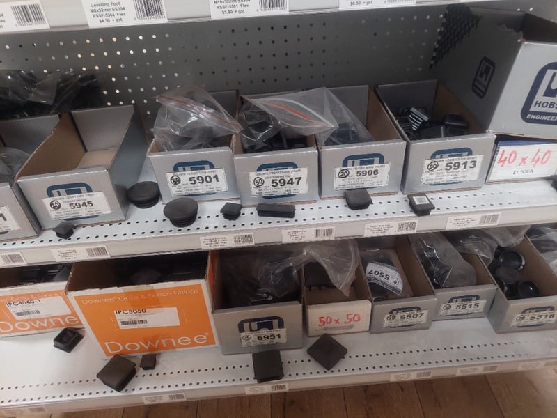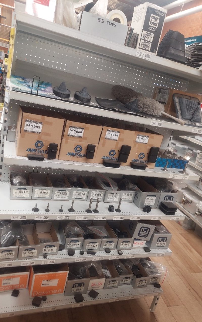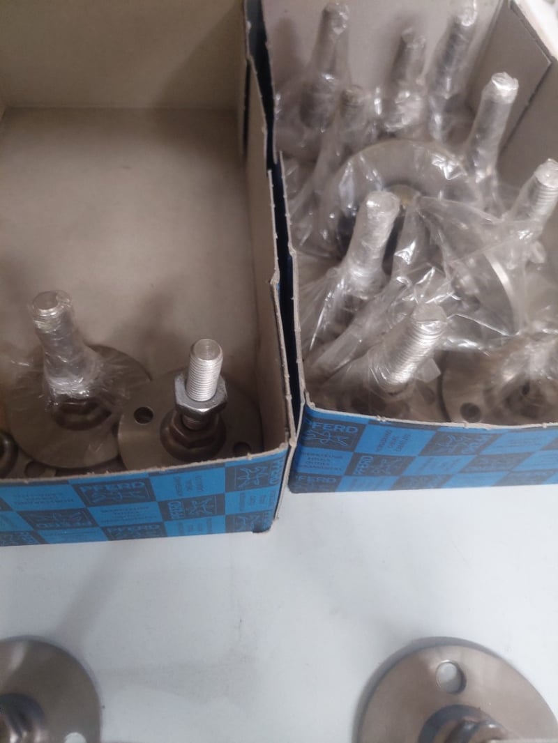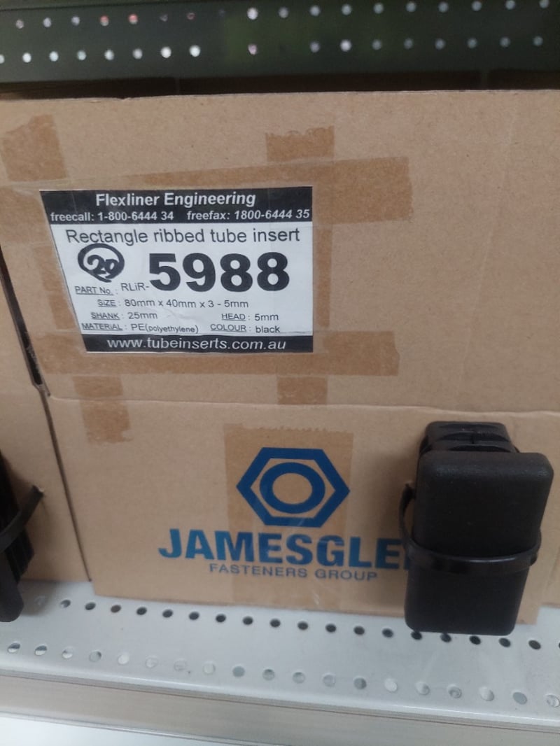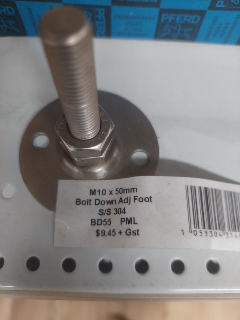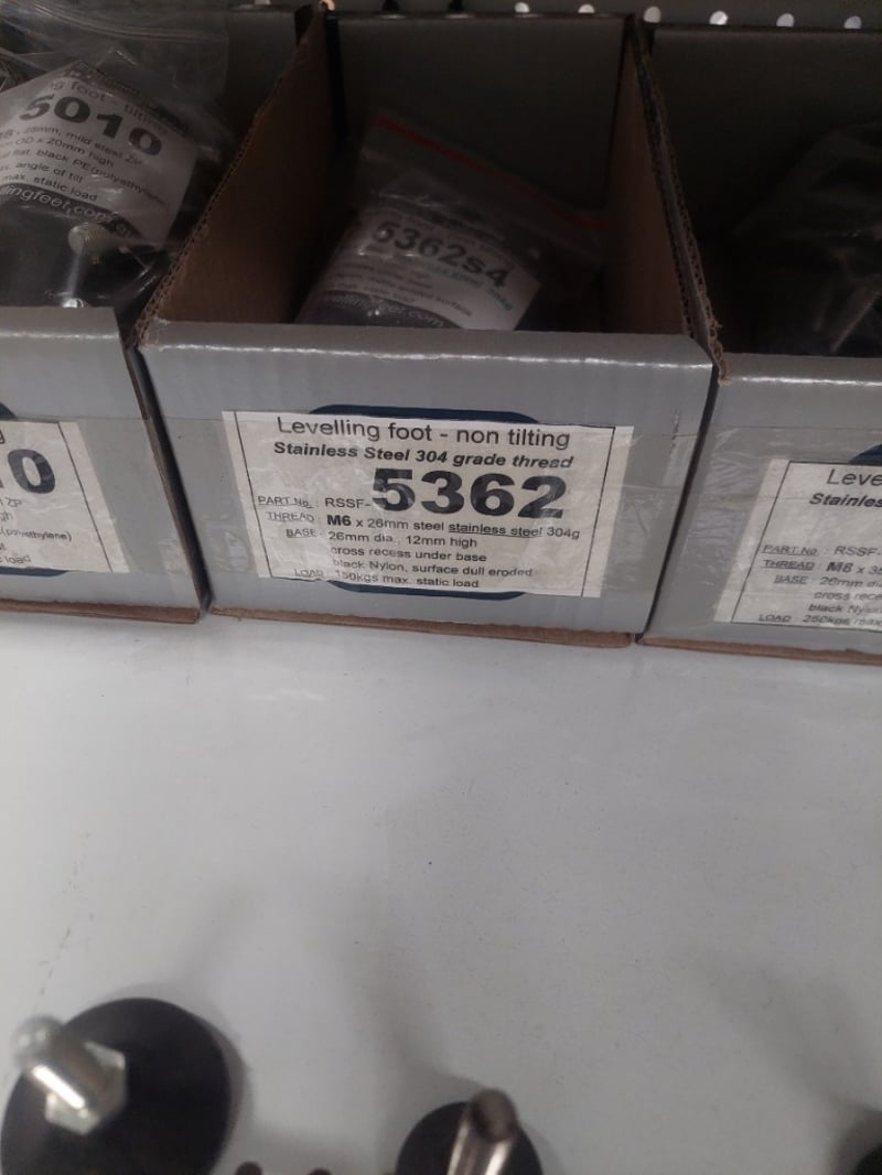 Assorted Lot includes, stainless steel levelling feet (non-tilting, grade 304 thread), rectangle ribbed tube inserts (PE material, black finish), bolt down adjustable feet, and assorted metric bolts and studs in stainless steel 304 grade. Multiple boxed units visible with part numbers including 5988, 5989, 5994, 5362, 5901, 5906, 5913, 5945, 5947, 5951, 5507, and others. Inventory stored in cardboard boxes and loose components. Suitable for machinery assembly, industrial equipment, and commercial applications. Stock appears to be from professional fastener supplier with comprehensive range of specifications. Sold as Lot