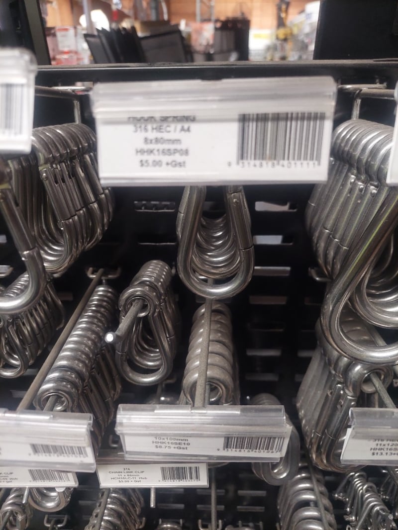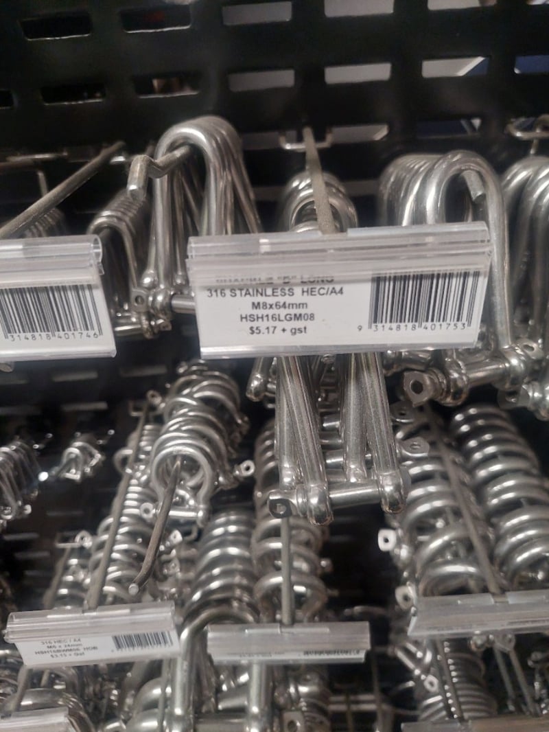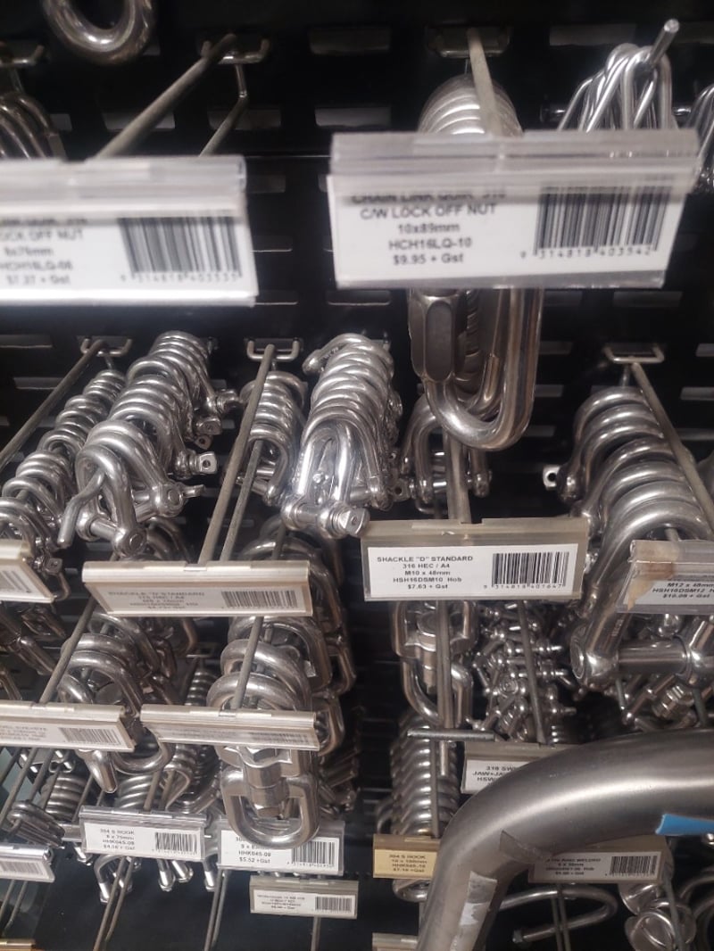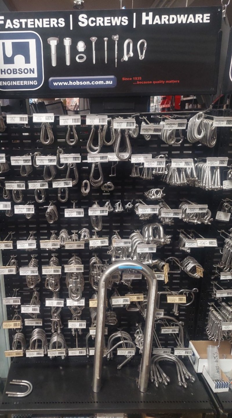 Hobson Engineering hardware display fixture featuring comprehensive stainless steel fasteners collection. The black pegboard display showcases an extensive range of stainless steel hooks, eye bolts, shackles, and U-bolts in various sizes and configurations. Sold as Lot