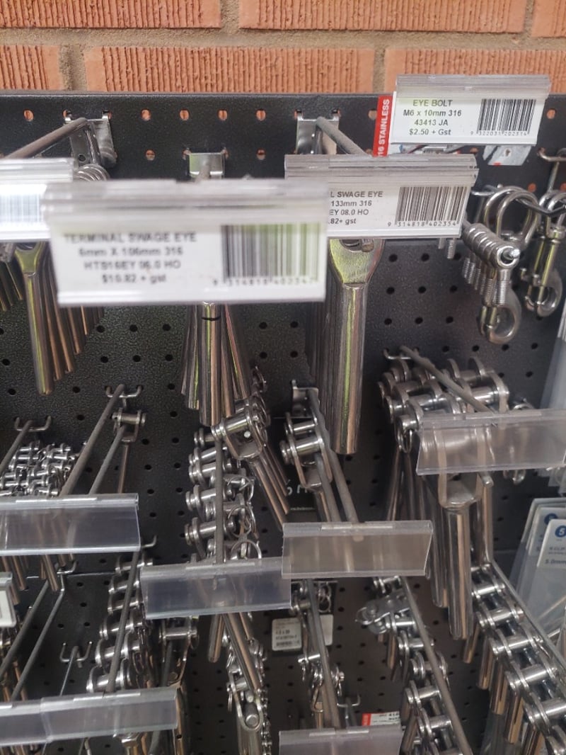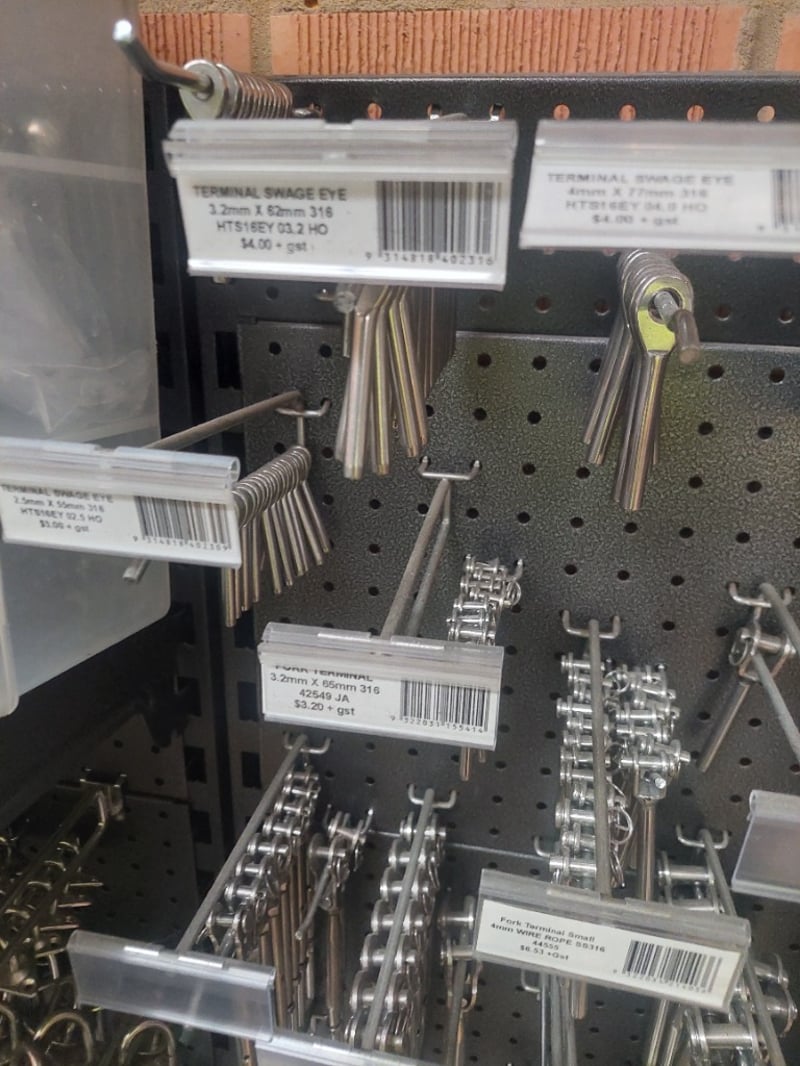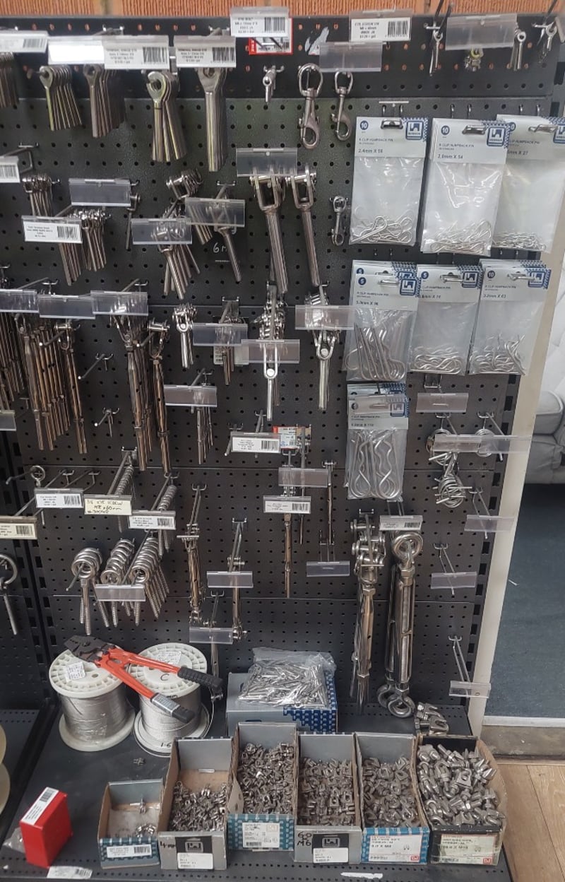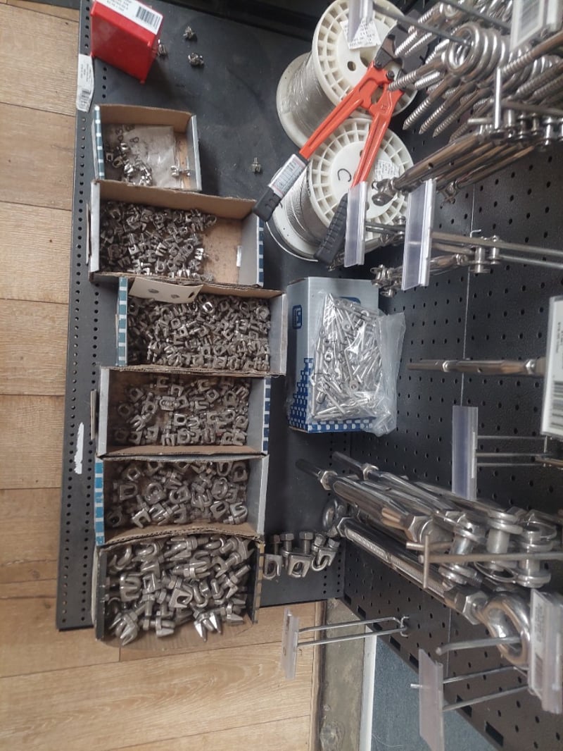 Comprehensive retail pegboard display system featuring extensive inventory of stainless steel hardware and fasteners. Display includes organized assortment of terminal swage eyes, eye bolts, eye screws, humpback pins in various metric dimensions, threaded fasteners, and cable rigging components. System comprises dual pegboards with integrated storage bins containing hundreds of individual fasteners, and more .... Sold as Lot