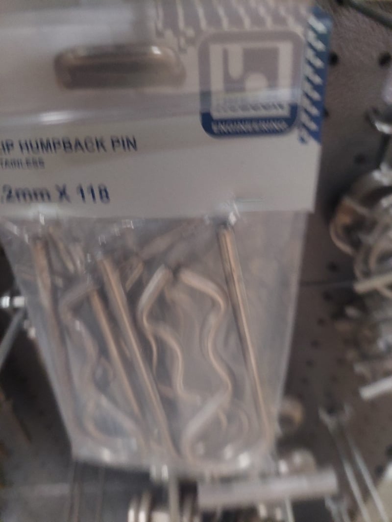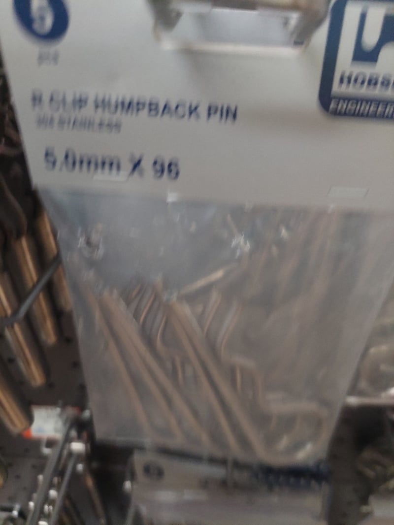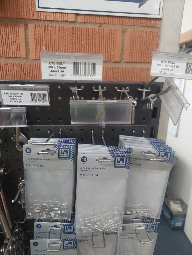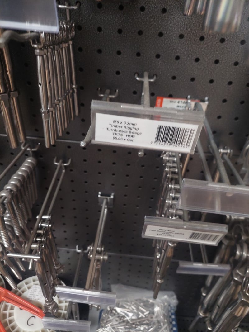 Comprehensive retail pegboard display system featuring extensive inventory of stainless steel hardware and fasteners. Display includes organized assortment of terminal swage eyes, eye bolts, eye screws, humpback pins in various metric dimensions, threaded fasteners, and cable rigging components. System comprises dual pegboards with integrated storage bins containing hundreds of individual fasteners, and more .... Sold as Lot