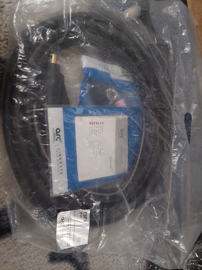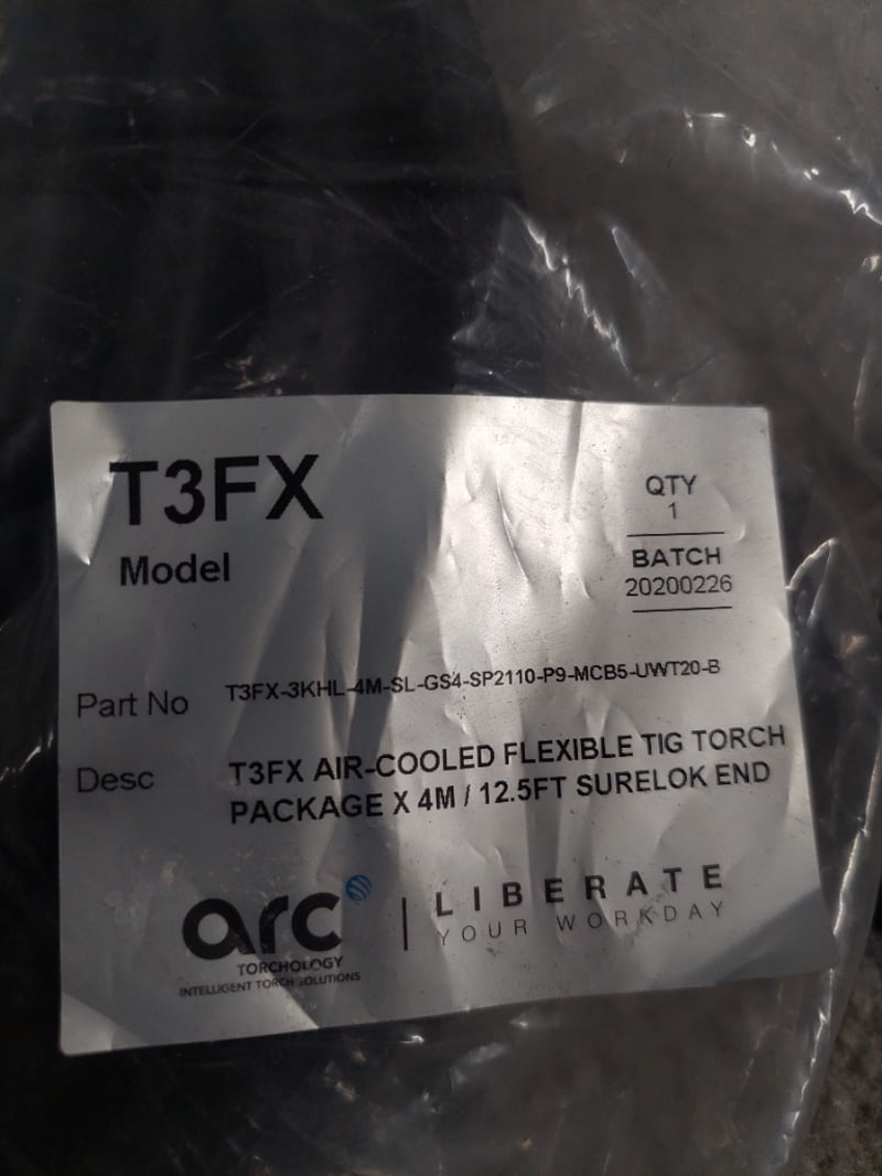 Arc T3FX Air-Cooled Flexible TIG Torch Package, Model T3FX-3KHL-4M-SL-GS4-SP2110-P9-MCB5-UWT20-8. This professional-grade welding torch assembly includes 4 meters (12.5 feet) of torch cable with Surelok end connector. Brand New - Unopened