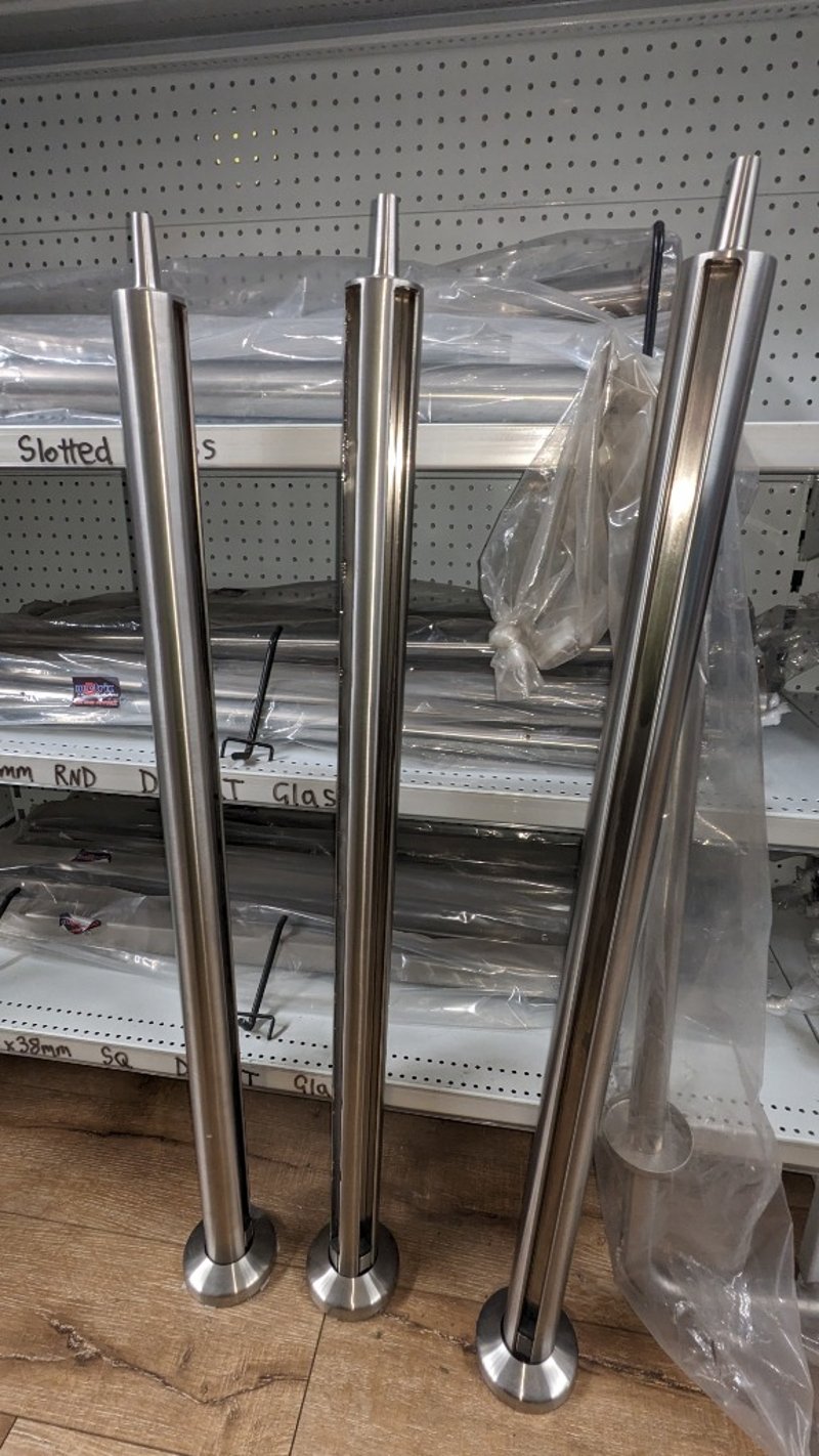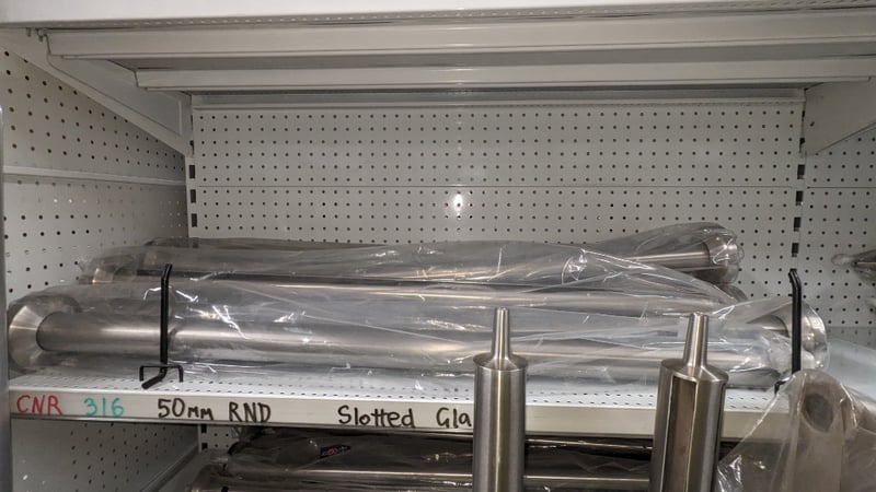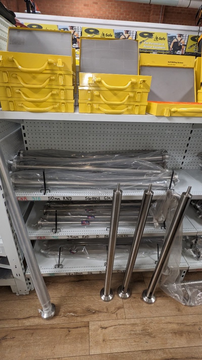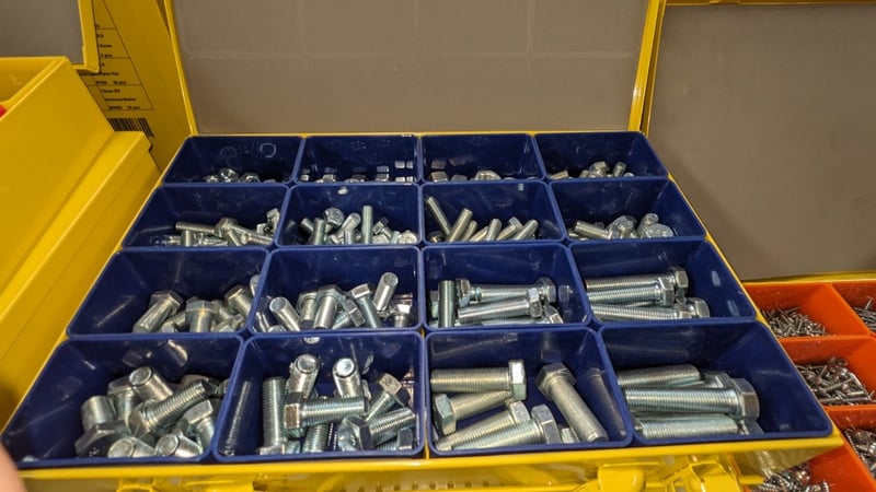 Comprehensive tooling and hardware lot comprising stainless steel slotted rods (50mm diameter), multiple metal fasteners and bolts in organized compartmentalized storage, and yellow high-visibility tool boxes with carry handles. Includes metal stand-offs, threaded rods, and extensive inventory of various gauge screws and fixings. Sold as Lot