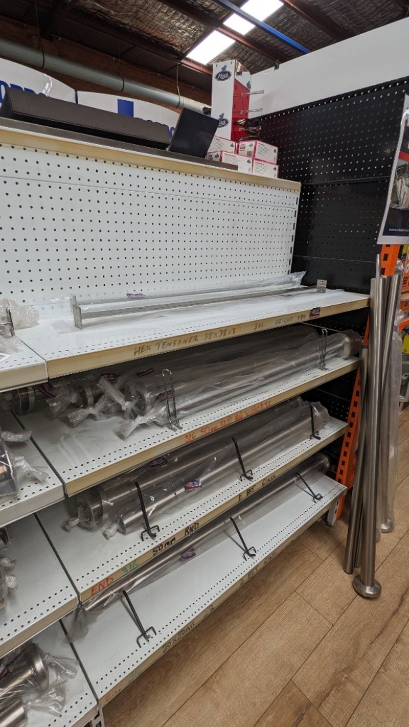 Comprehensive Stainless steel shelving components and hardware, including multiple rectangular balustraded panels in 316 marine-grade stainless steel, polished and more......
