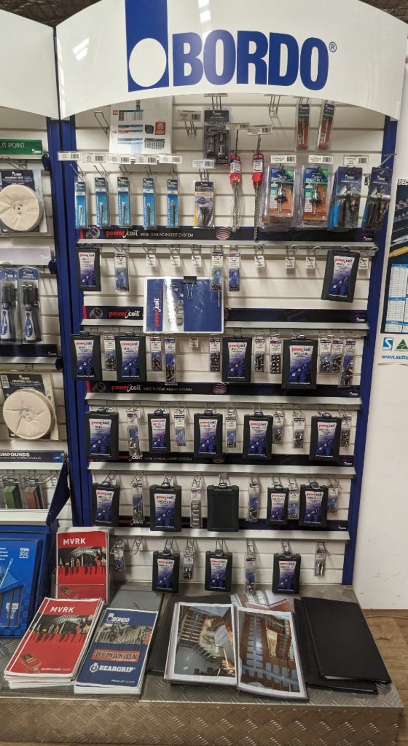 Lot of assorted Bordo branded tools and accessories including chamfering tools, drill bits, thread repair kits, and related hardware. Items displayed on retail stand with multiple packaged units in various sizes. Sold as Lot Note: Untested / As Displayed
