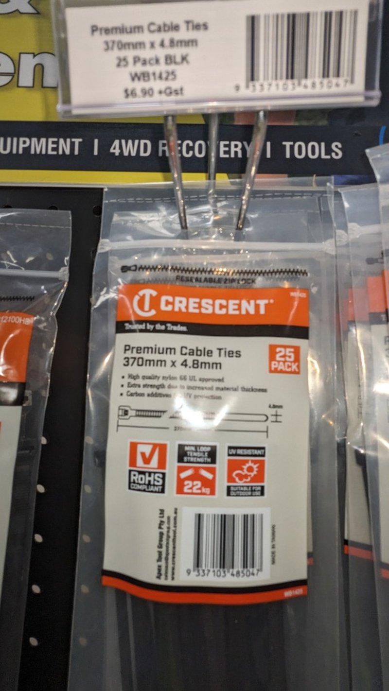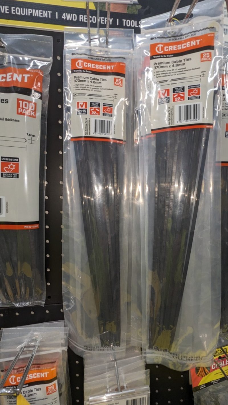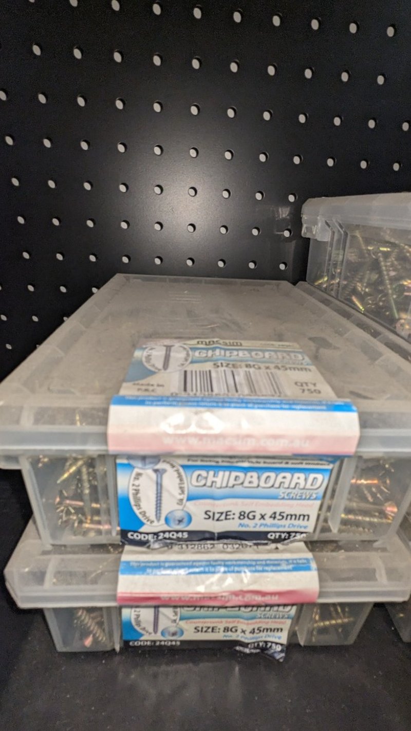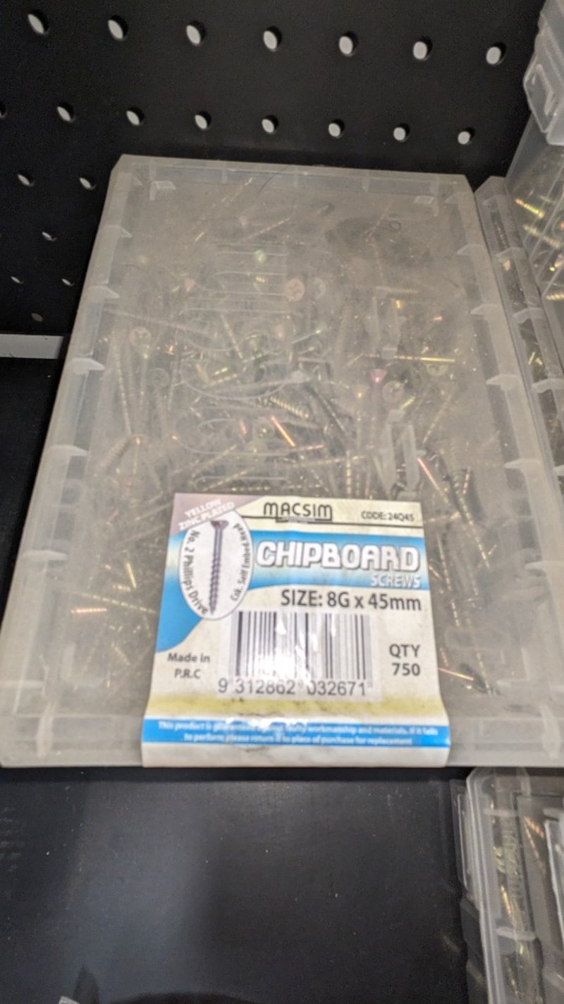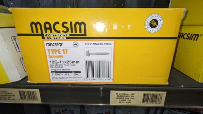 Bulk hardware fasteners assortment featuring premium Australian brands. Lot includes MACSIM Type 17 screws (316 stainless steel, 12G-11x25mm, hex washer face head with hex socket and neoprene washer, 1000 qty in original yellow box), CRESCENT premium cable ties (370mm x 4.8mm, 25-pack units, multiple packs available), and CHIPBOARD screws (8G x 45mm, 750 qty per container, size 2402 code) and more ....