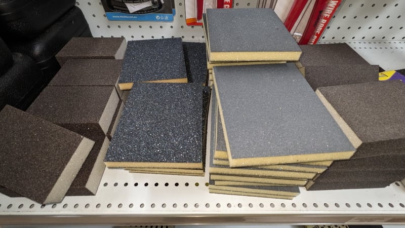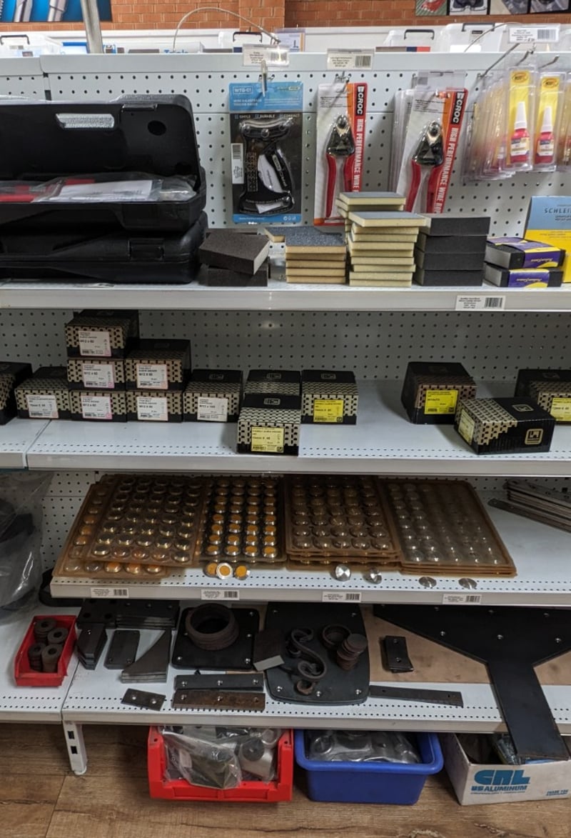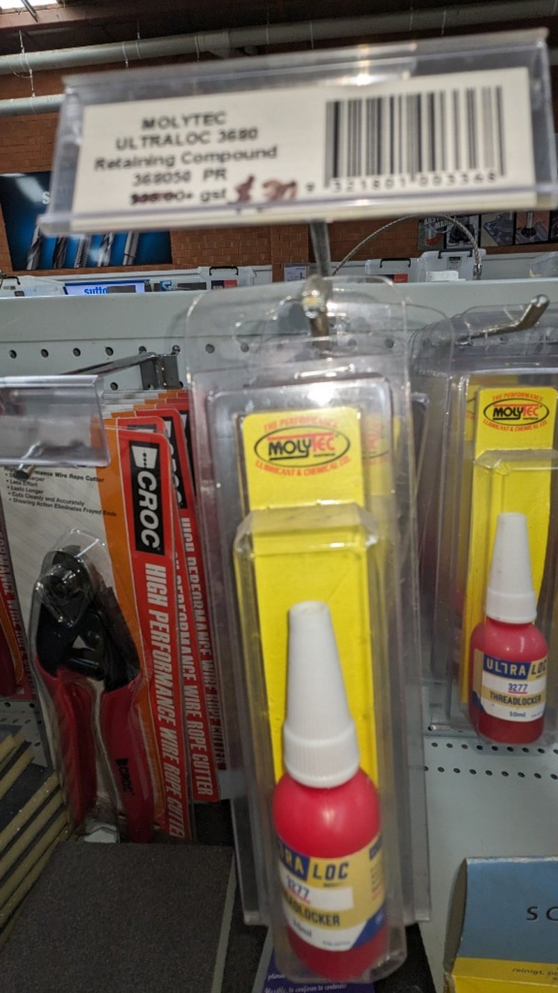 Mixed lot of industrial tools and consumables including wire rope cutters, retaining compounds, sanding pads, and assorted hardware items on shelving. Sold as Lot Note: Untested / As Displayed