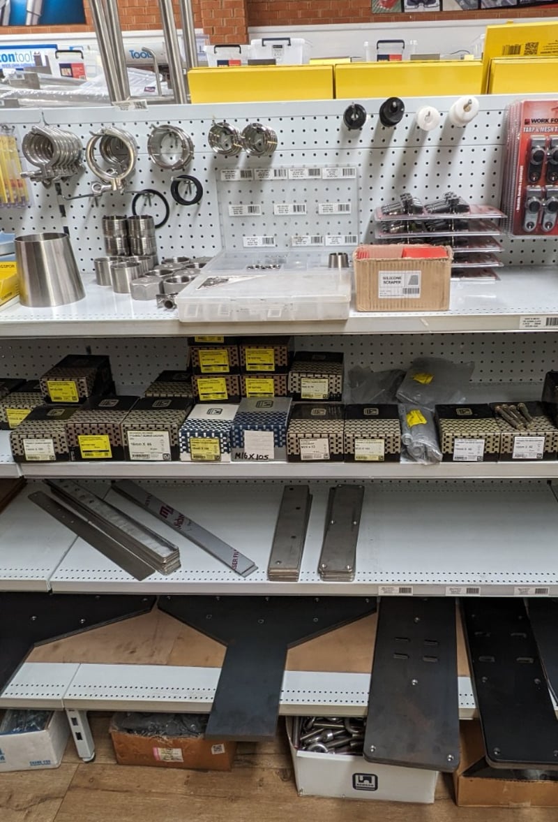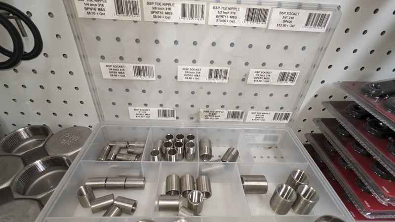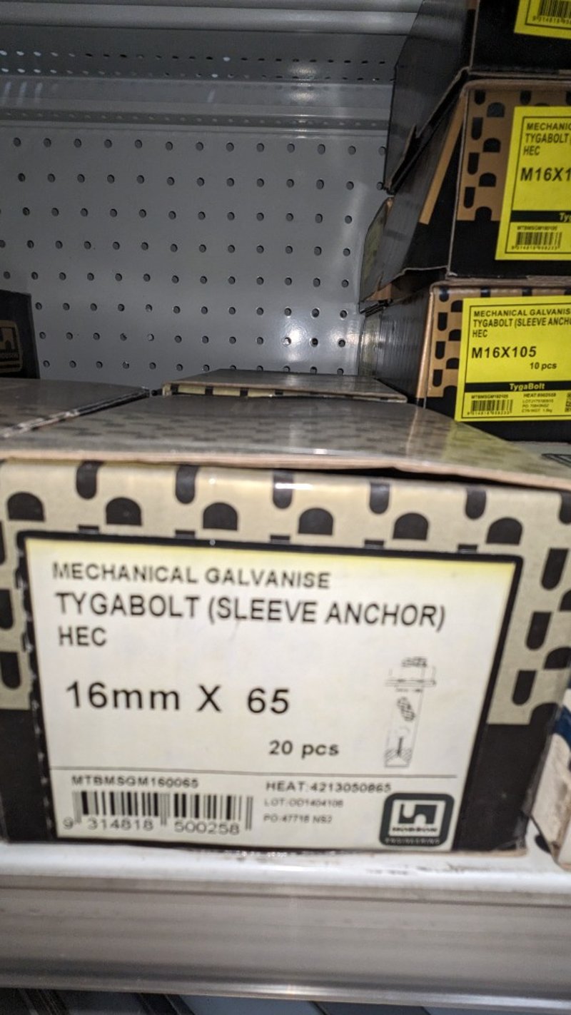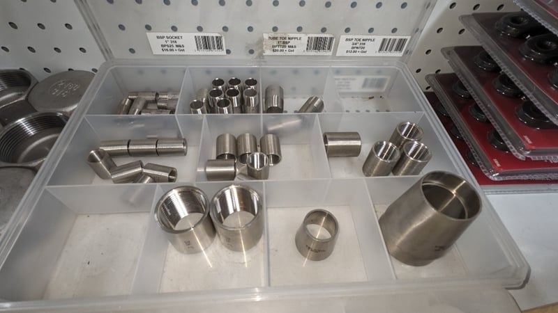 Comprehensive hardware and plumbing fixtures assortment featuring stainless steel components including BSP sockets, toe nipples, and tube fittings across multiple sizes. Collection includes Work Force 6-piece tarp and mesh tie-down clips, mechanical galvanised tygabolt sleeve anchors (16mm x 65, 20pcs), decorative metal rings, and more Sold as Lot