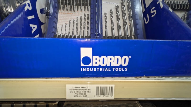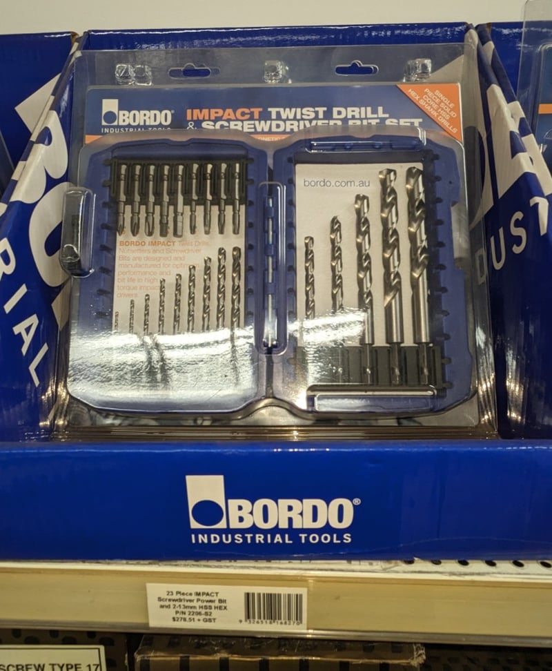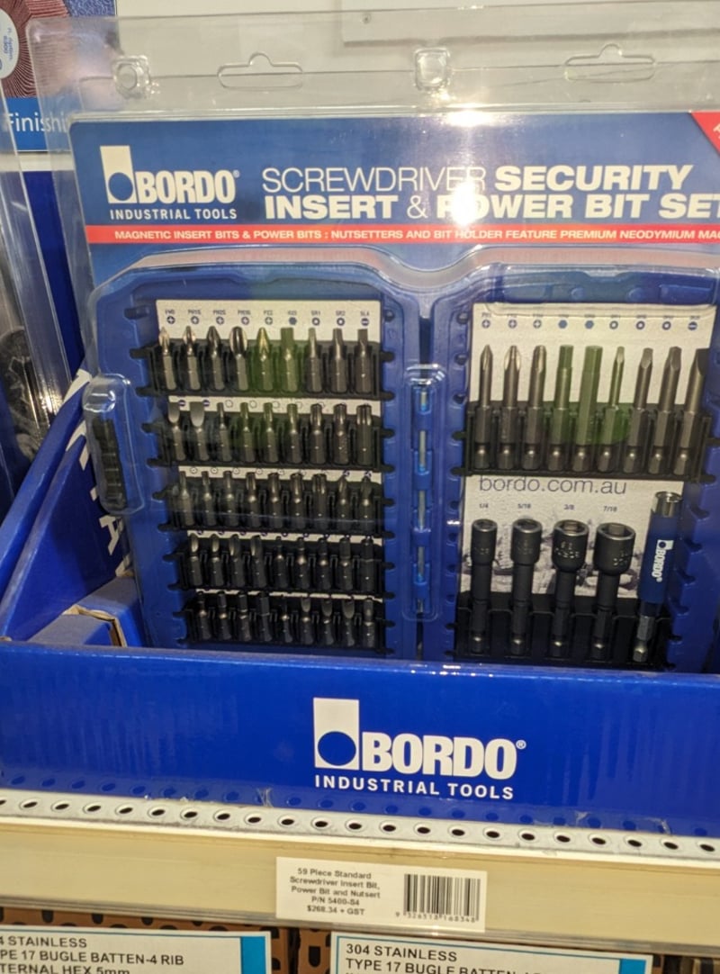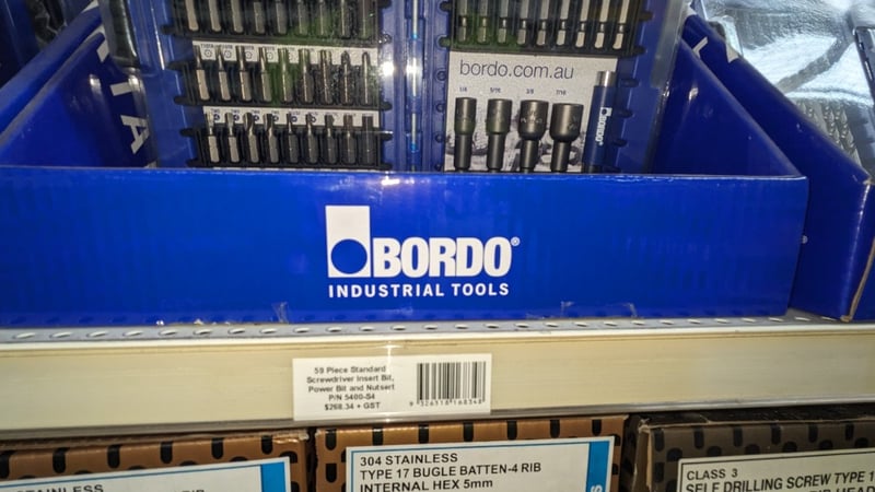 Comprehensive industrial fastening and power tools assortment featuring Bordo brand impact twist drill and screwdriver sets alongside security screwdriver insert bit collections. The lot includes 23-piece impact screwdriver power bit sets with 2-1.3mm HSS hex bits, 59-piece standard screwdriver insert bit and nutsetter combinations, and premium security screwdriver sets with magnetic insert bits and power bits. Also included are 304 stainless steel Type 17 bugle batten fasteners (4-rib, internal hex 5mm, #14-10x100) supplied by Drillx and more