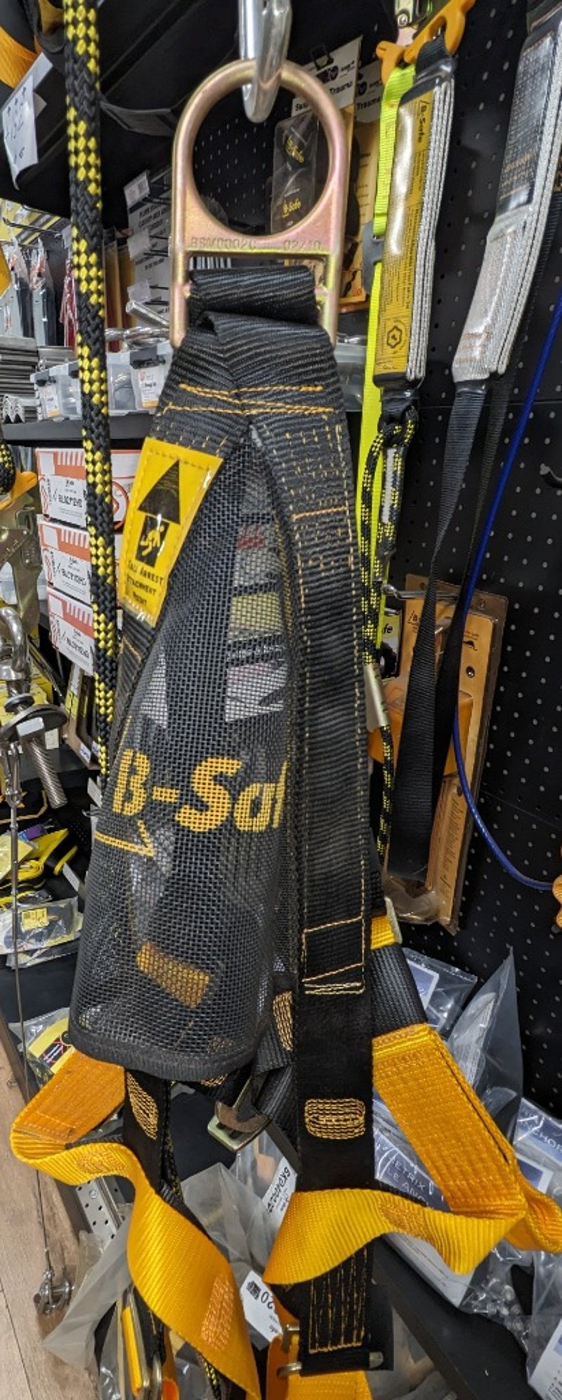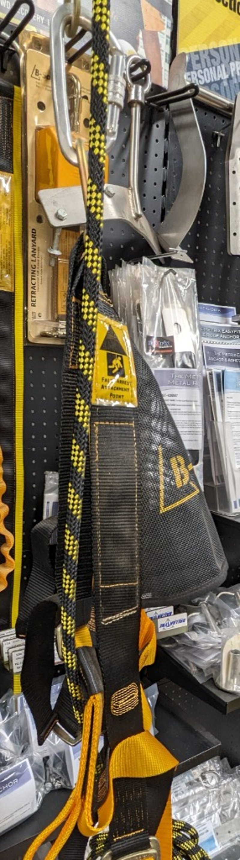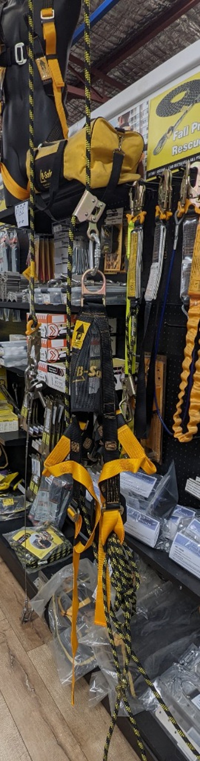 Professional-grade fall protection and rescue equipment package featuring heavy-duty safety harnesses in black and yellow, dynamic kernmantle ropes with distinctive yellow/black chevron pattern.