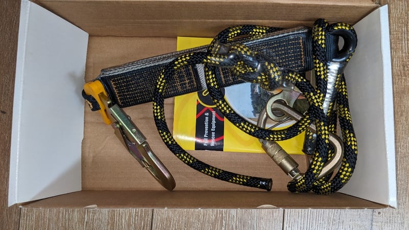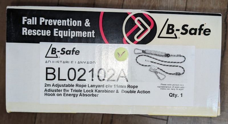 B-Safe Fall Prevention & Rescue Equipment Bundle. Model BL02102A comprising a 2m adjustable rope lanyard with 11mm rope, adjuster mechanism, triple lock karabiner, and double action hook on energy absorber.