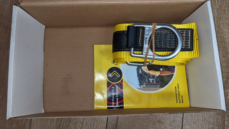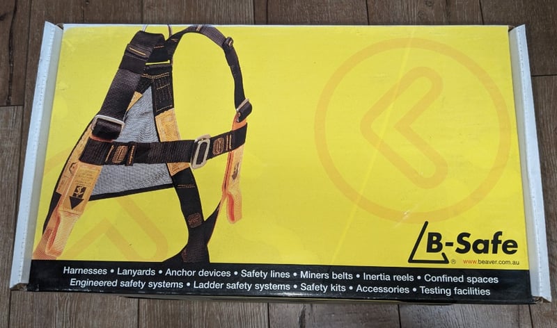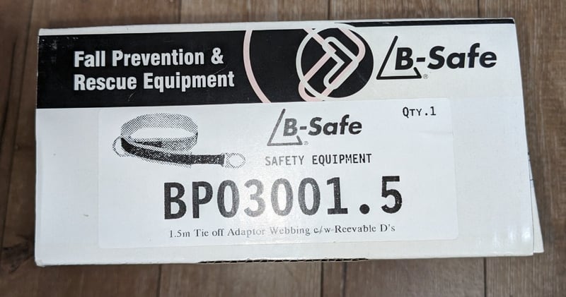 B-Safe fall prevention and rescue equipment package comprising a full-body safety harness with black and tan webbing, multiple attachment points, and a 1.5m tie-off adaptor webbing with receivable D's (model BP03001.5). The harness features reinforced stitching, metal D-ring attachment points, and adjustable shoulder and waist straps with buckle closures.