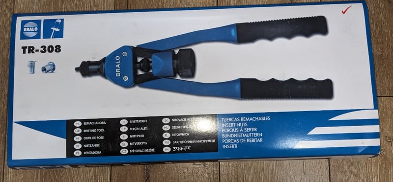 Bralo TR-308 riveting tool, a professional-grade hand rivet gun featuring blue and black construction. The tool includes replaceable insert nuts for versatile fastening applications. Model TR-308 comes with integrated mechanical components designed for inserting rivets.