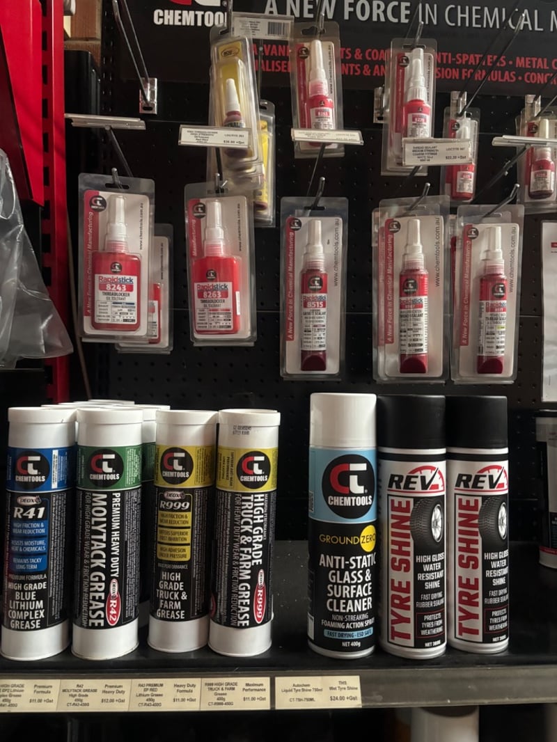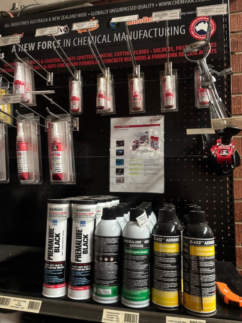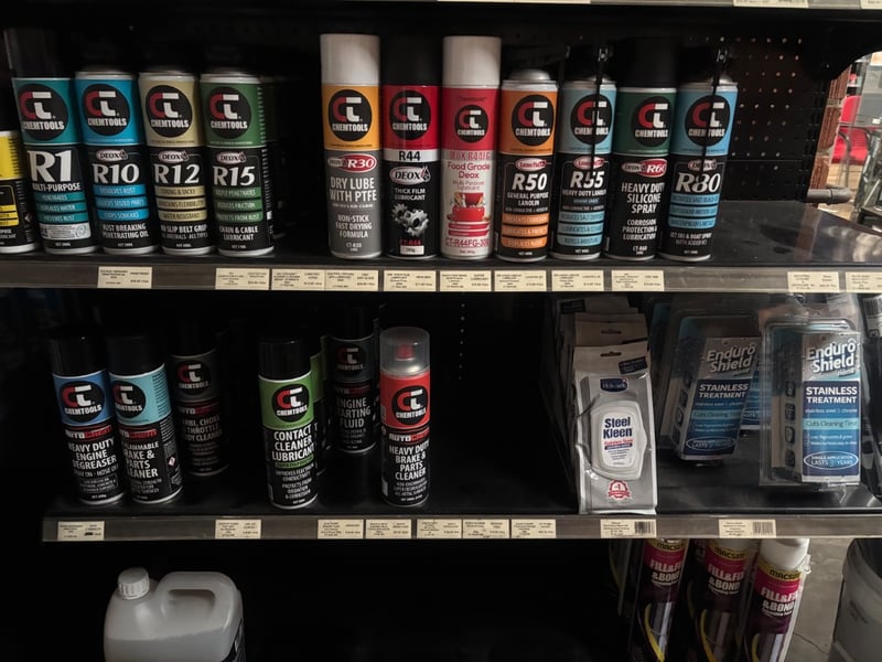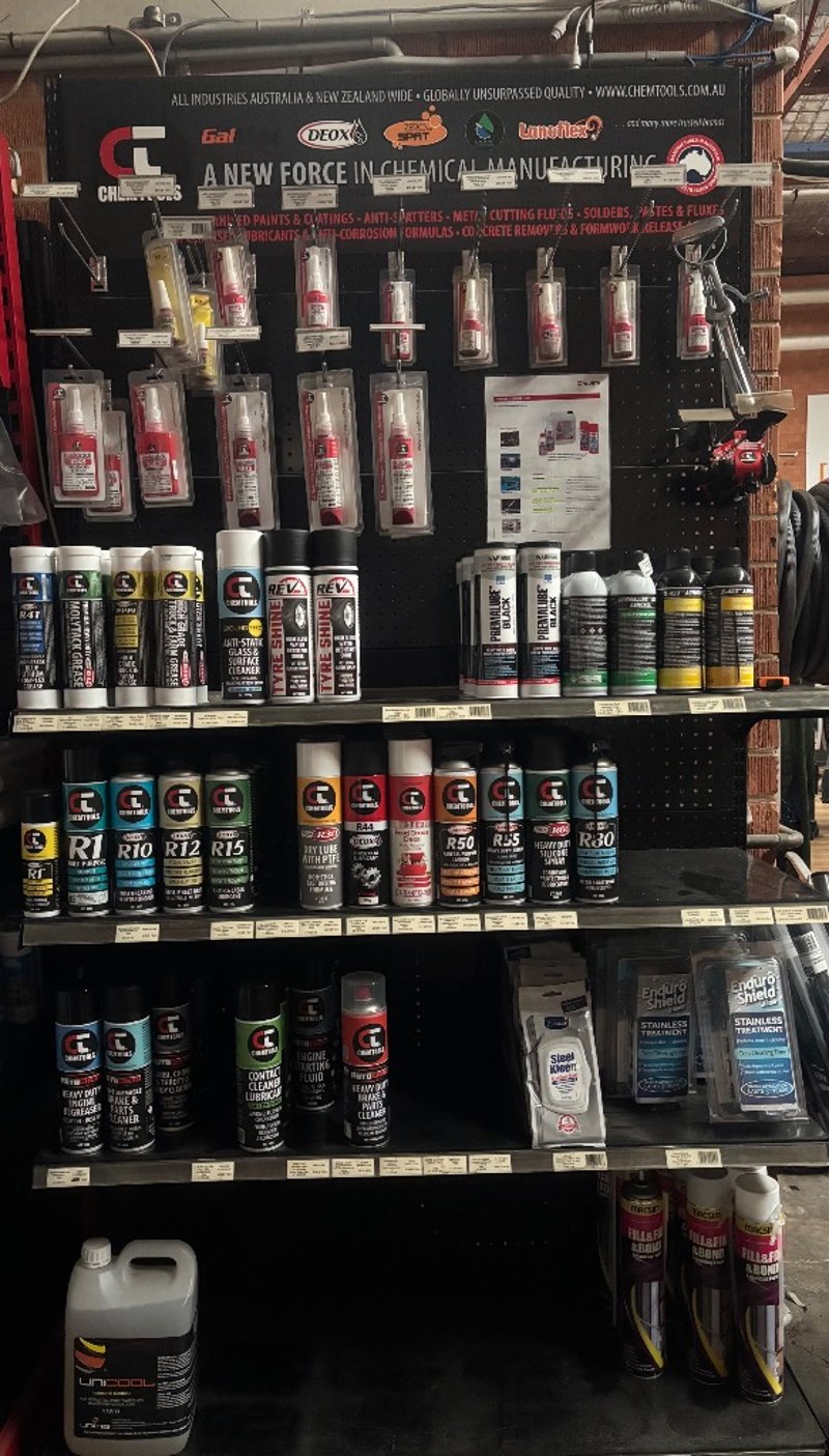 Lot of Chemtools industrial chemicals and maintenance products including lubricants, degreasers, cleaners, aerosols, threadlockers, and associated items on display shelving. Sold as Lot Note: Untested / As Displayed