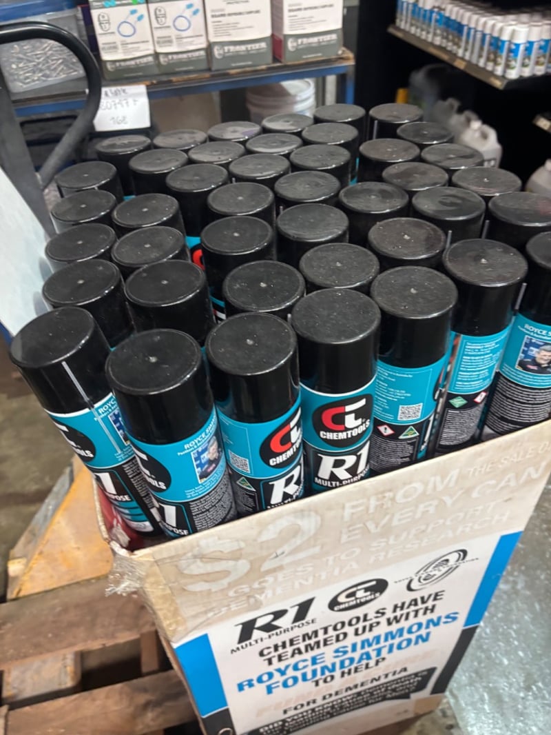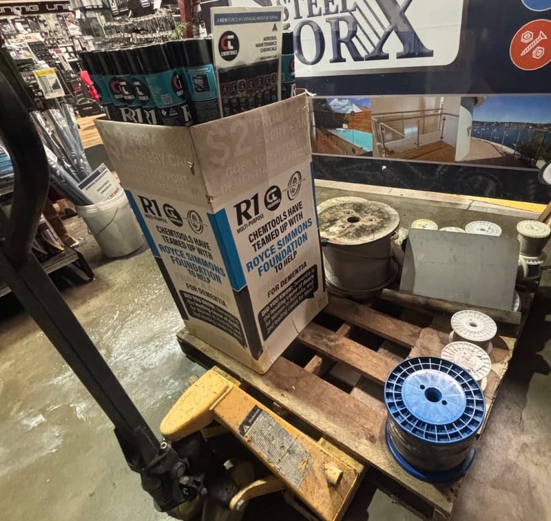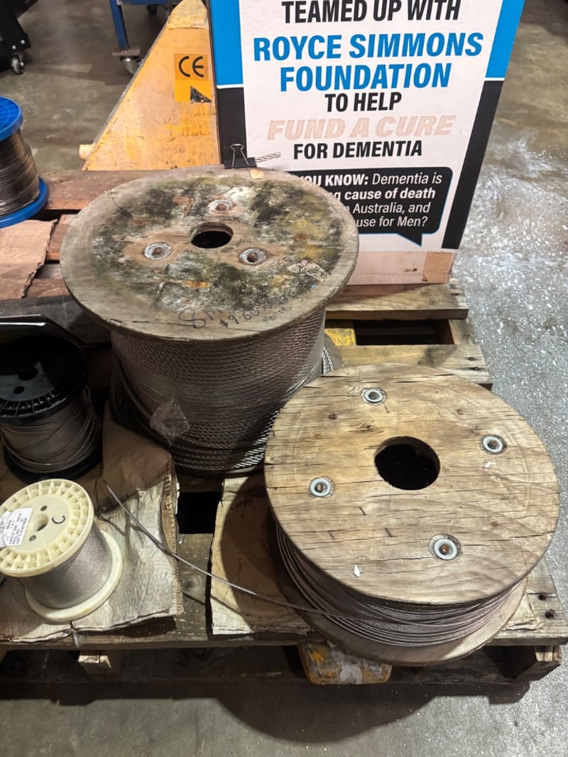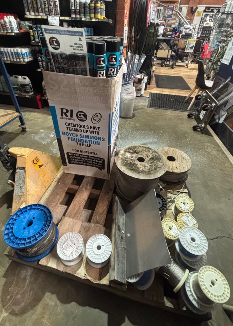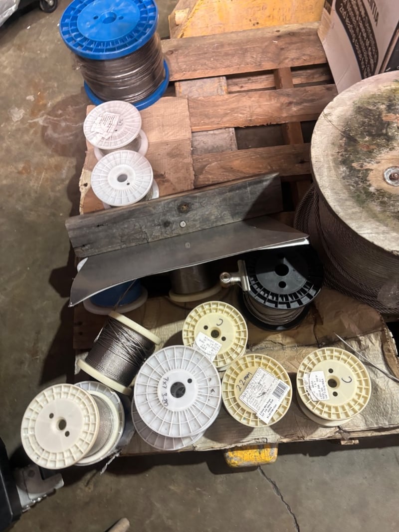 Large lot of welding wire spools, steel cable reels, Chemtools R1 multi-purpose aerosols, and assorted metal pieces. Sold as Lot Note: Untested / As Displayed