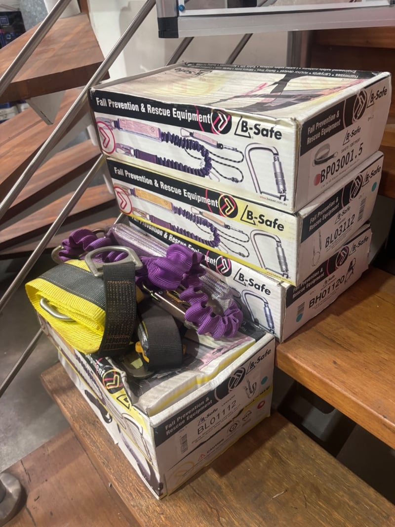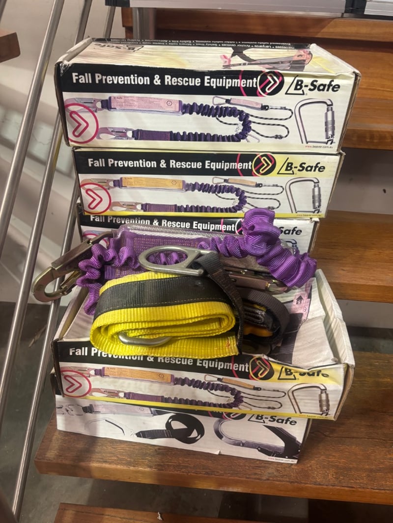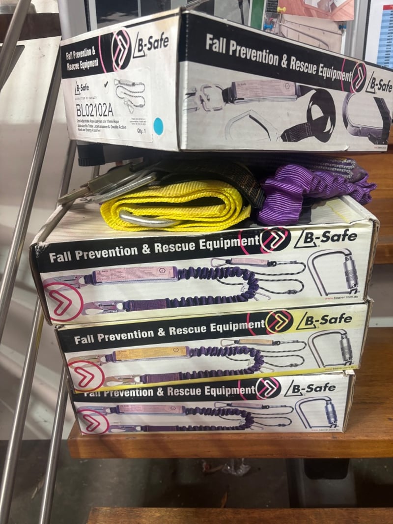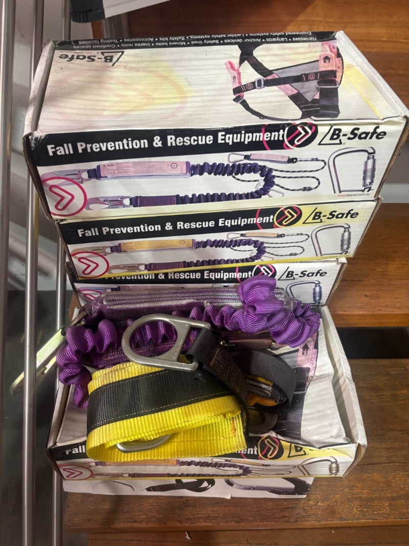 Lot of Safe fall protection equipment, specifically shock-absorbing lanyards and ropes designed for height safety.