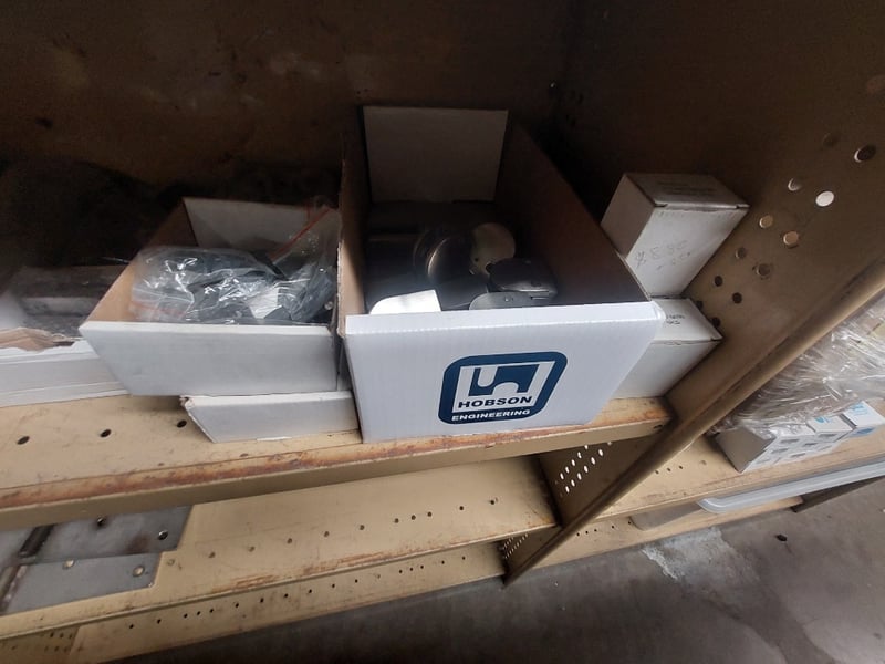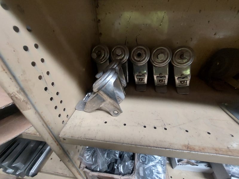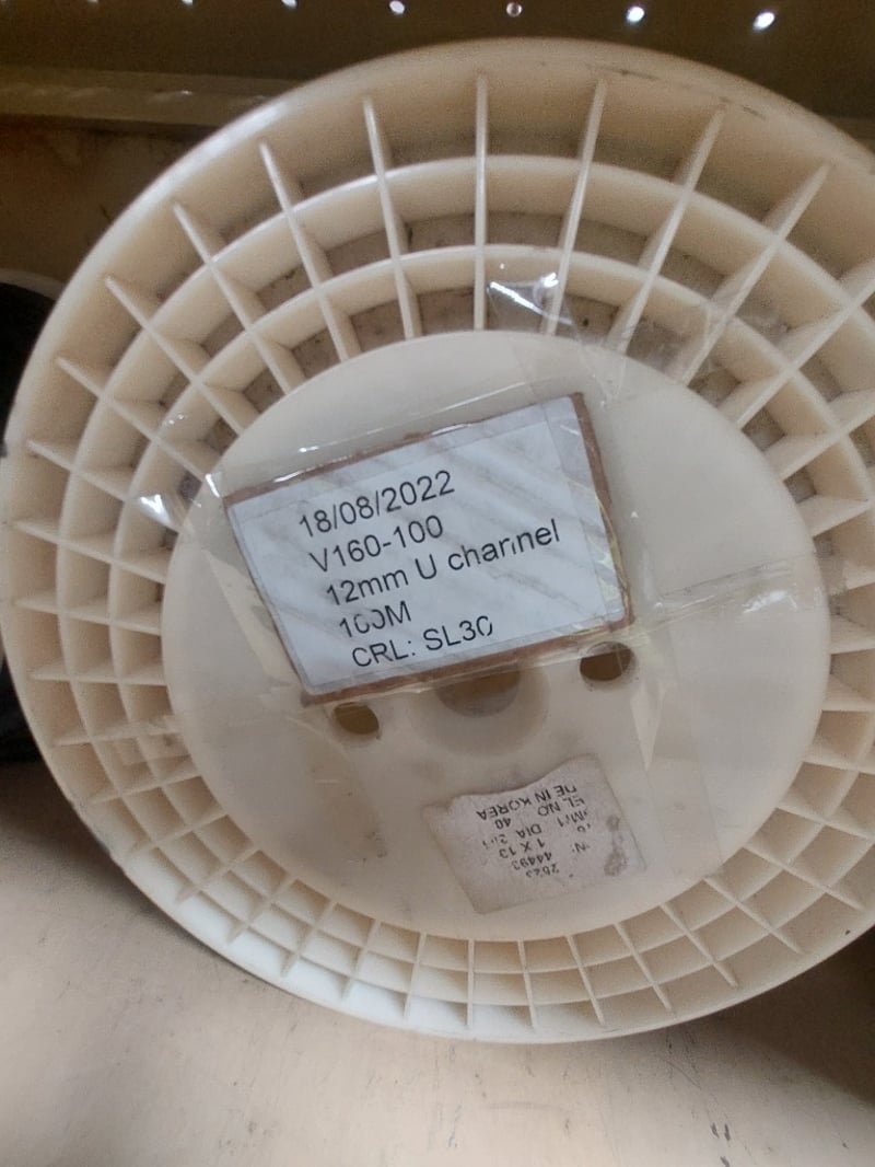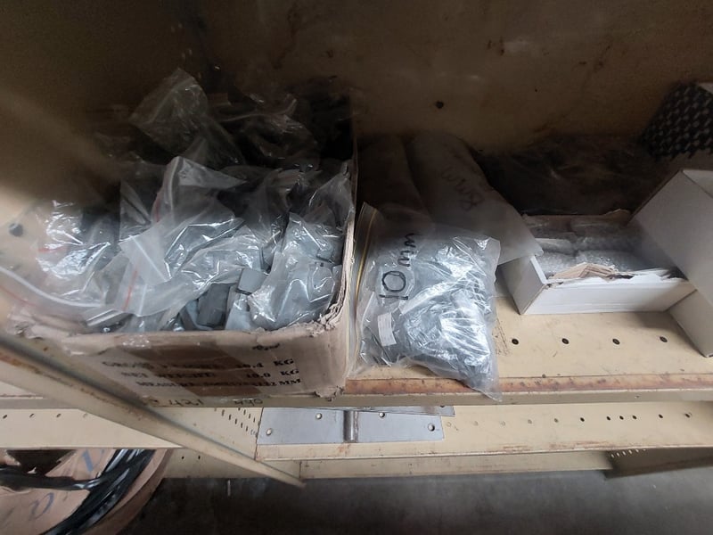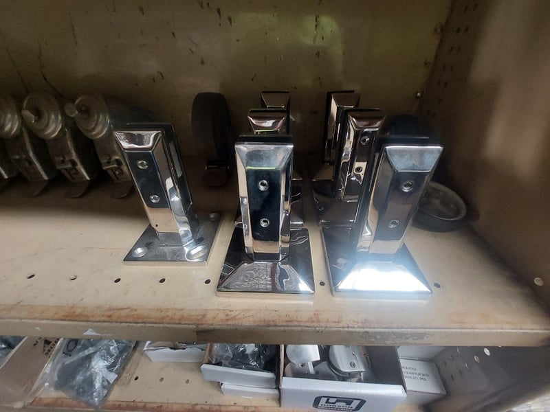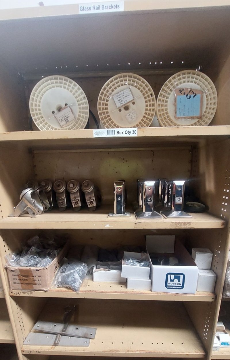 Comprehensive lot of glass rail brackets, fastening hardware, and installation components. Includes three cream-coloured circular wire baskets containing 12mm U channel sections (dated 18/08/2022, reference V160-100, and more ... Sold as Lot