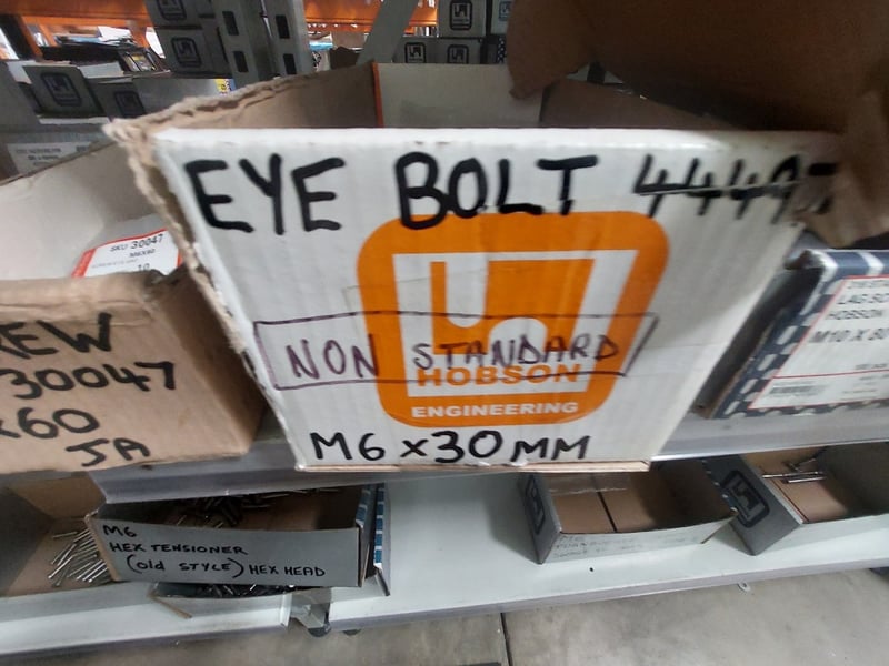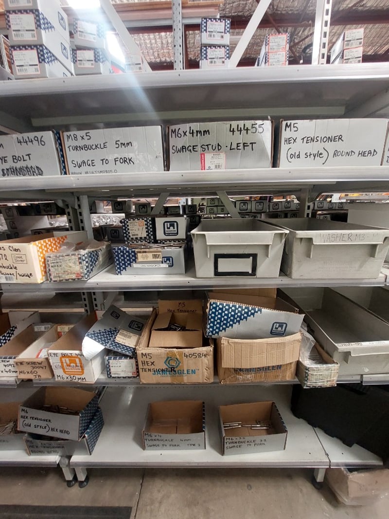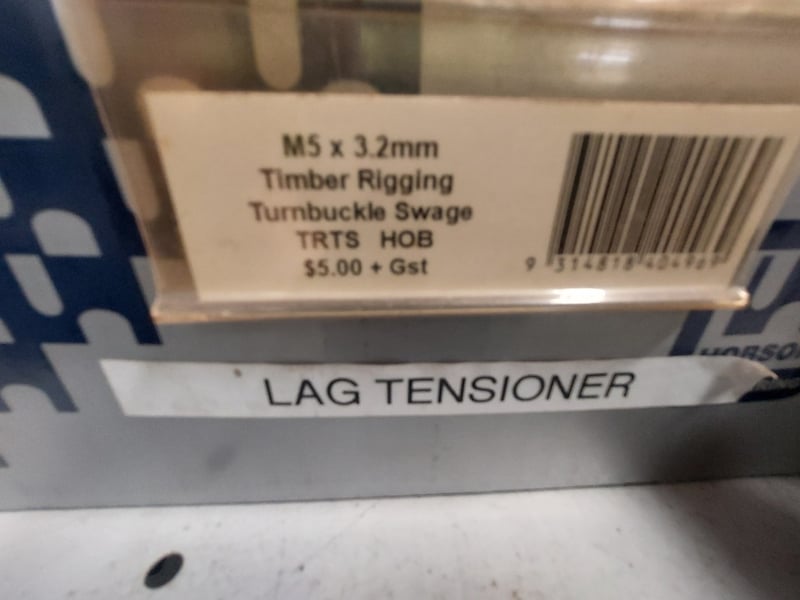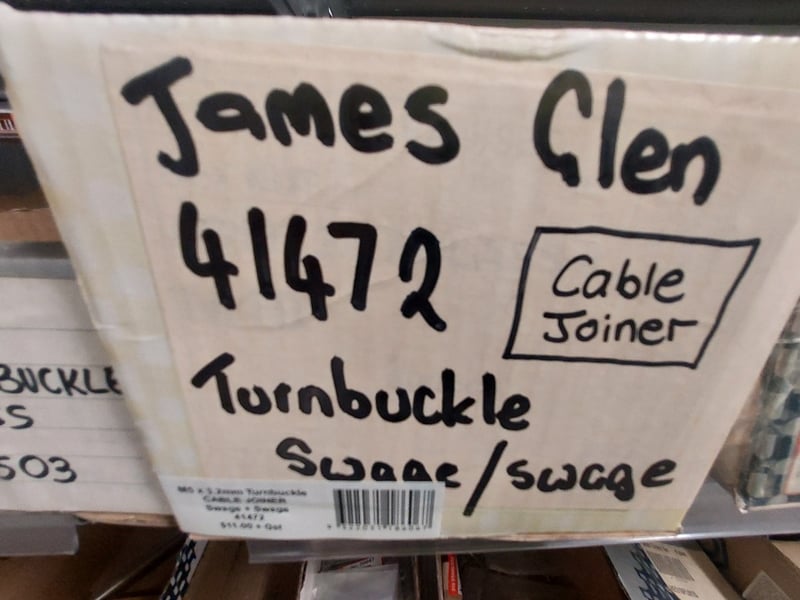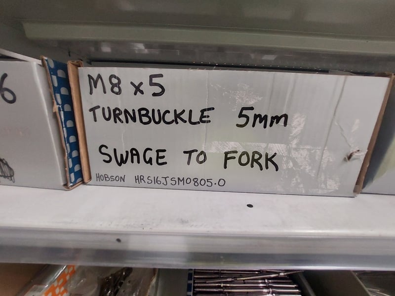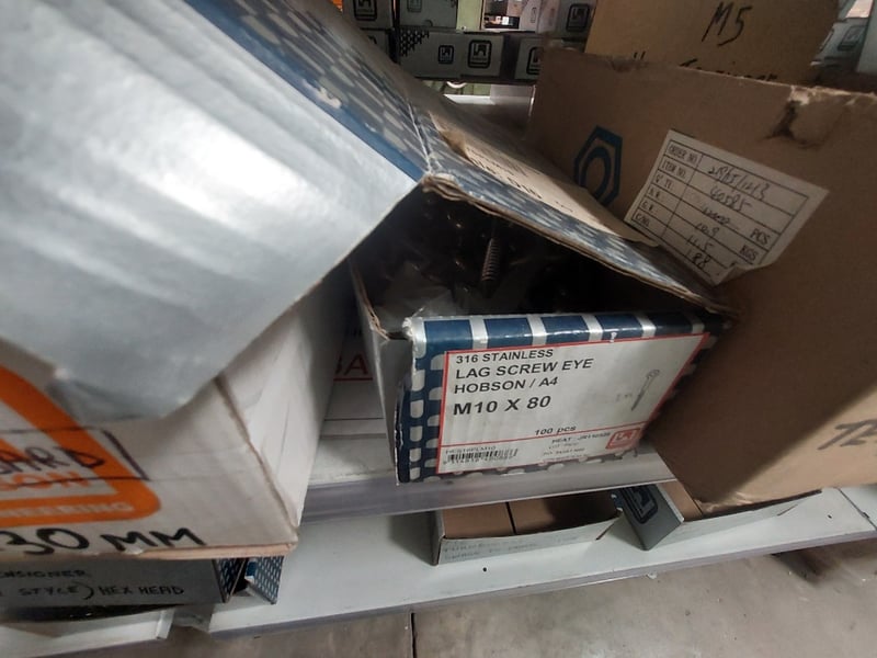 Comprehensive hardware and fastener inventory lot featuring industrial-grade components. Collection includes M8x5 turnbuckles (5mm swage to fork configuration), M6x4mm swage studs (left-hand), M5 hex tensioners (old style round head), M5x3.2mm timber rigging turnbuckle swage fasteners, lag tensioners, M6x30mm eye bolts, M10x80mm stainless steel lag screw eye bolts (316 stainless, Hobson A4 specification), and cable joiners and more ... Sold as Lot