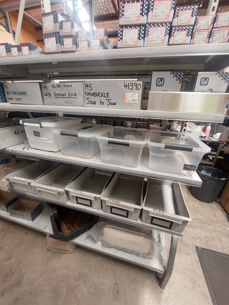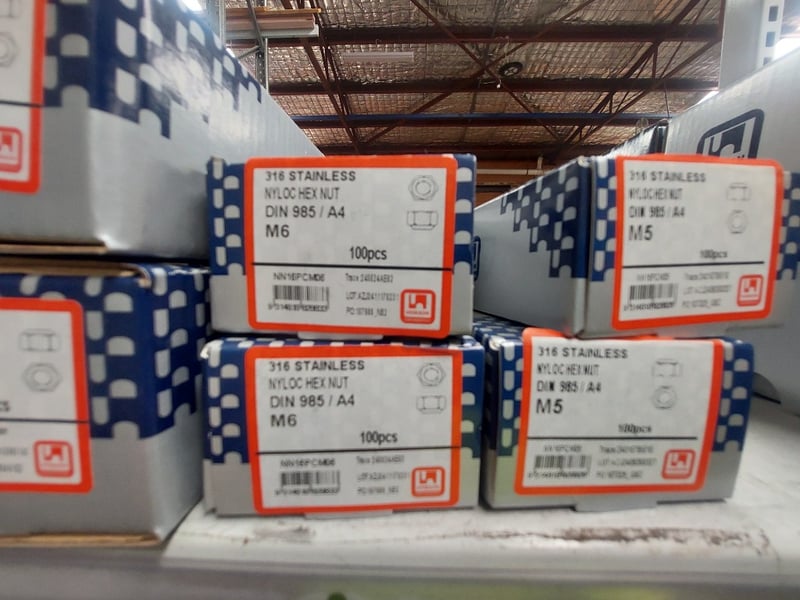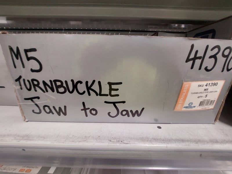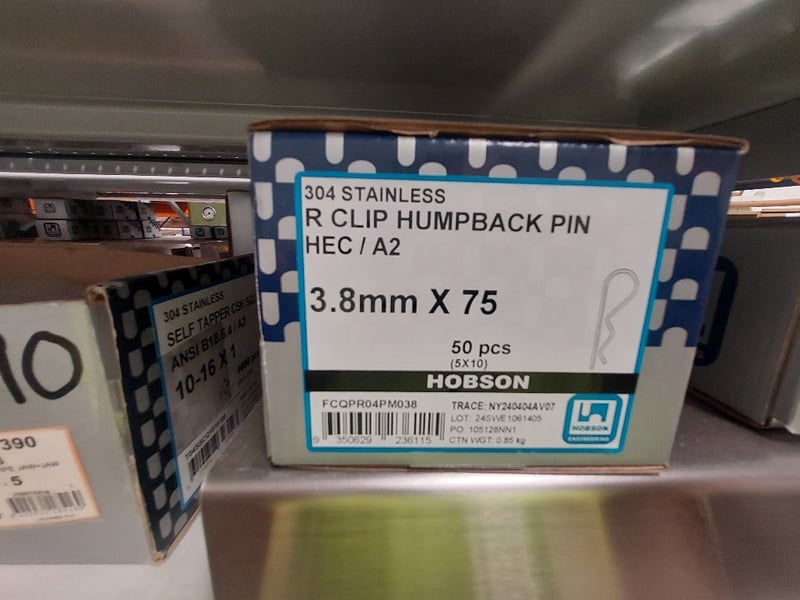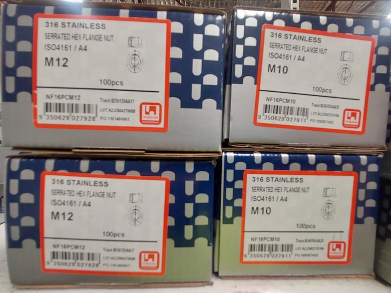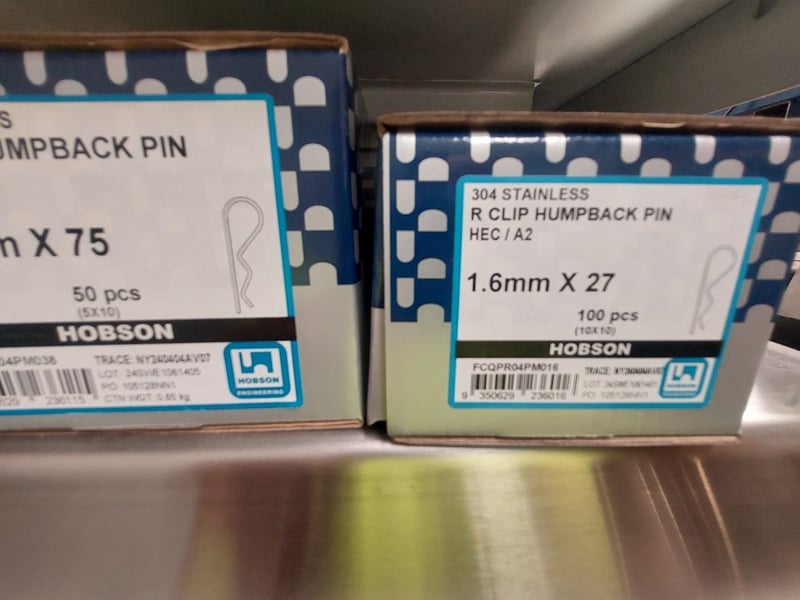 Comprehensive lot of industrial hardware and fastening supplies featuring stainless steel components. Includes M5 turnbuckle (jaw to jaw), serrated hex flange nuts in 316 stainless steel (ISO4161/A4) in M10 and M12 sizes with 100-piece boxes, and 304 stainless steel R-clip humpback pins (HEC/A2) in 1.6mm x 27 and 3.8mm x 75 configurations by Hobson and more ...... Sold as Lot