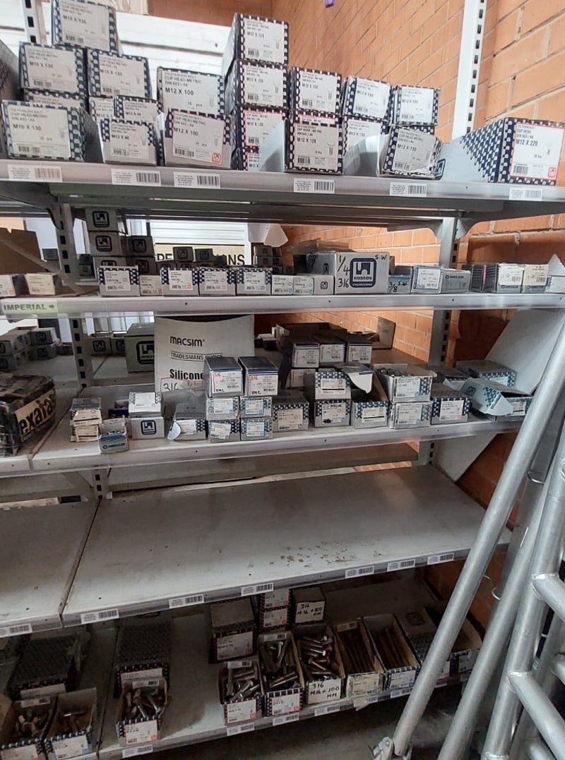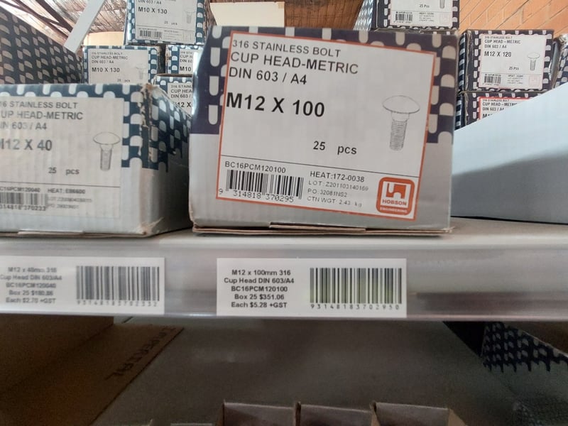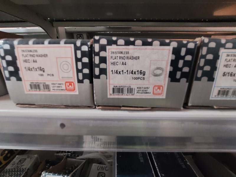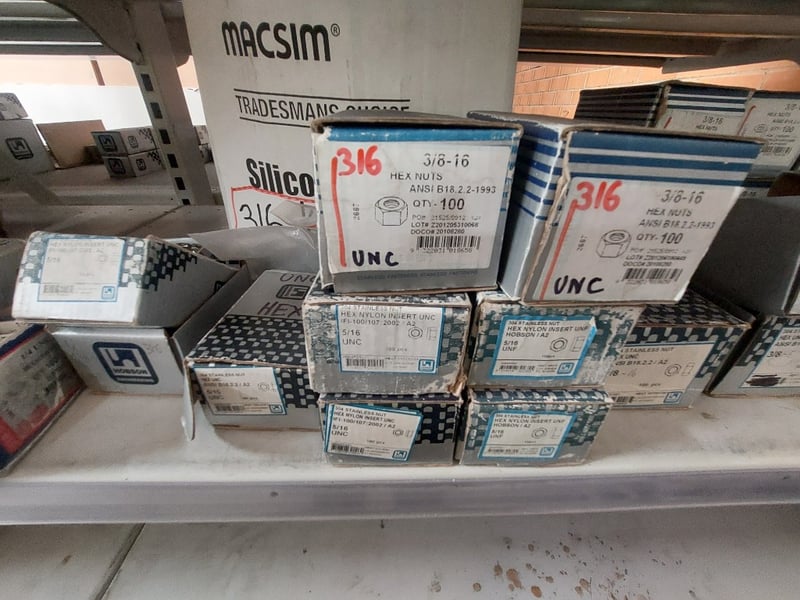 Comprehensive bulk lot of stainless steel fasteners and hardware comprising multiple boxes of assorted bolts, washers, and nuts. Inventory includes M12 x 100mm cup head metric bolts (DIN 603/A4, 25 pieces per box), flat round washers (various sizes including 1/4" x 1-1/4" x 16g, 100 pieces per box), and hex nuts in multiple thread specifications (5/8-16 UNC, 3/8-16 UNC, and more......Sold as Lot
