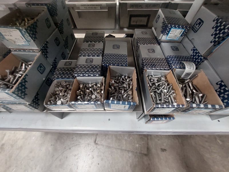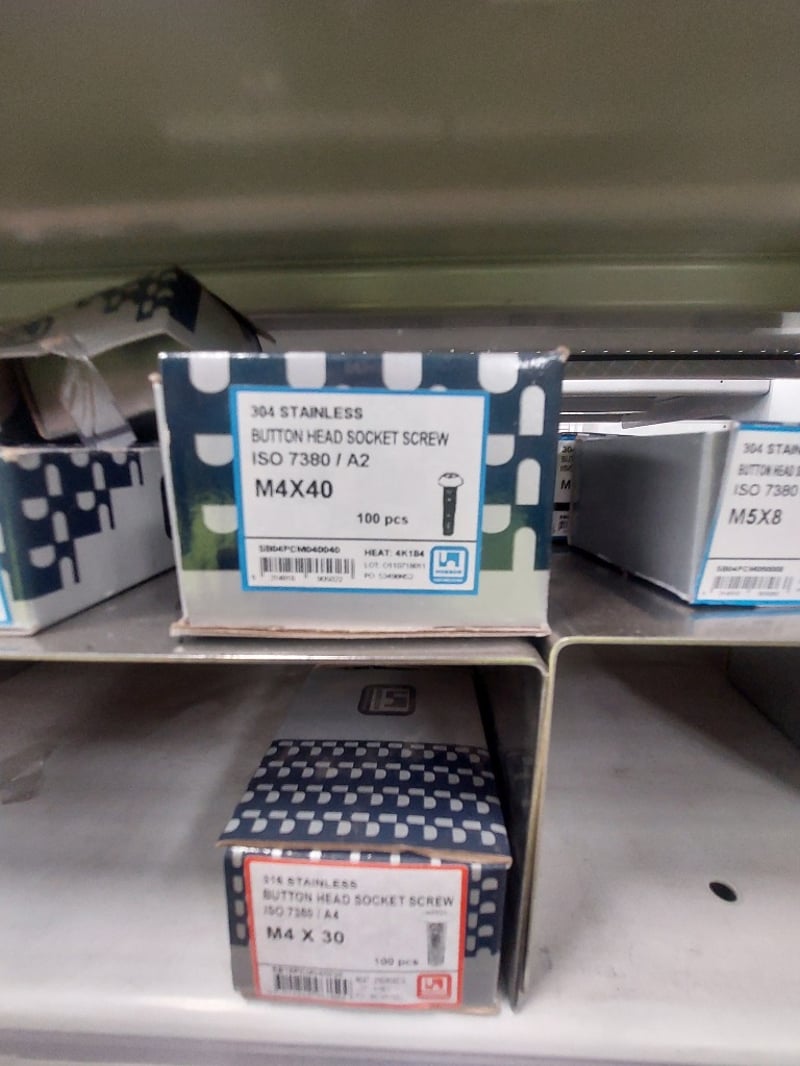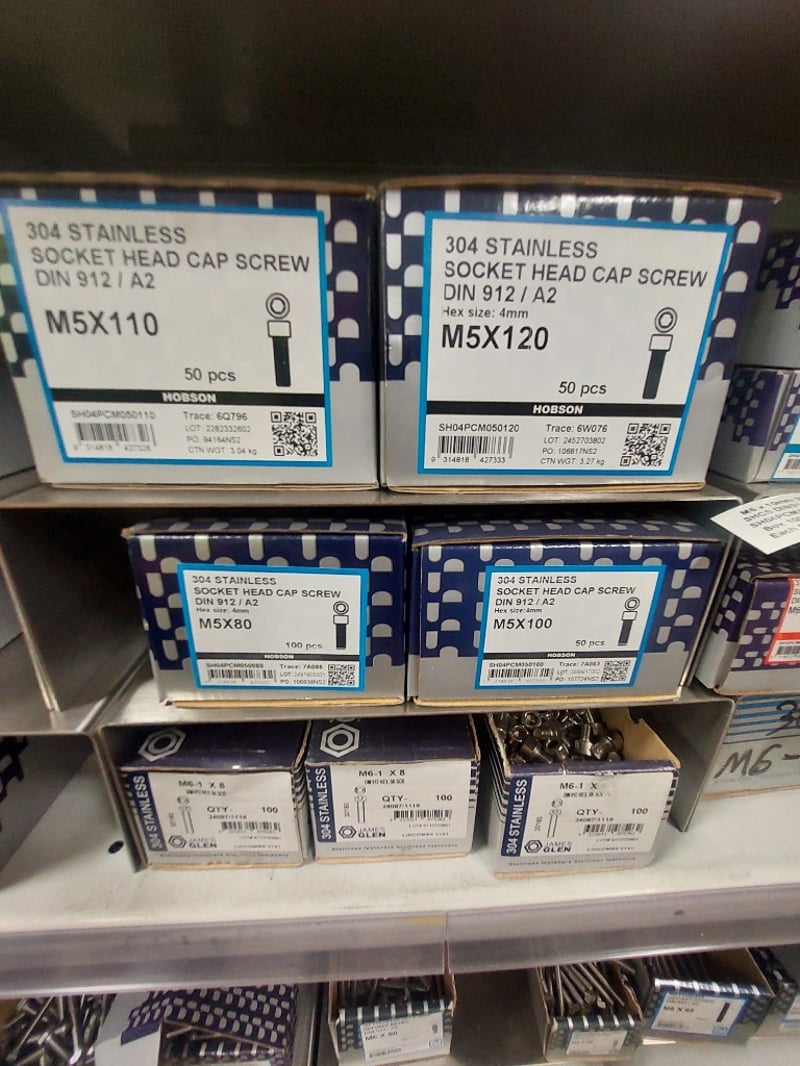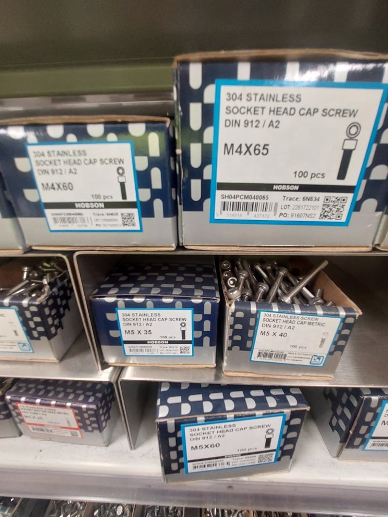 Comprehensive bulk lot of 304 stainless steel socket head cap screws and button head socket screws in various metric sizes. Inventory includes multiple DIN 912/A2 and ISO 7380/A2 specifications ranging from M4x30 to M5x120, with quantities from 50 to 100 pieces per box. Stock features Hobson brand packaging with organized storage in individual compartments and bulk cardboard boxes. Includes socket head cap screws (M4x40, M4x60, M4x65, M5x40, M5x60, M5x80, M5x100, M5x110, M5x120) and button head socket screws (M4x30, M4x40) and more ..... Sold as Lot