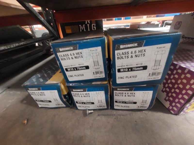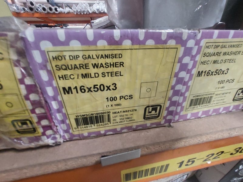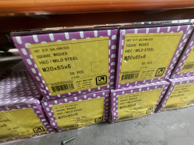 Comprehensive lot of industrial fasteners and hardware comprising hot dip galvanised square washers in multiple specifications (M16x50x3 and M20x65x6), Class 4.6 hex bolts and nuts by Bremick (M10 x 75mm, zinc plated), and assorted miscellaneous fastening components and more ..... Sold as Lot