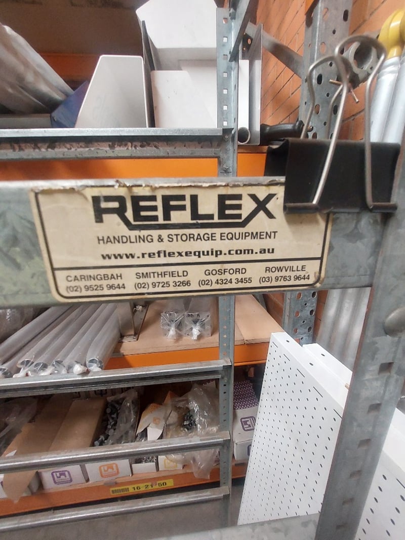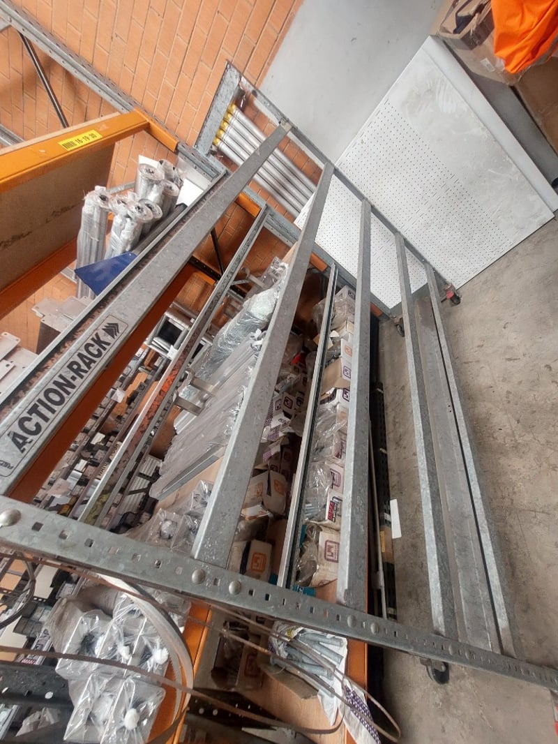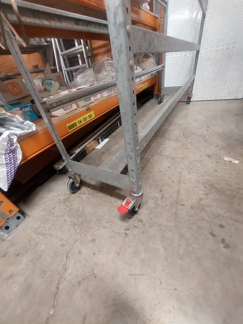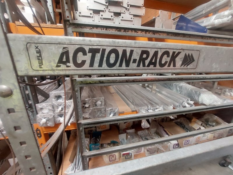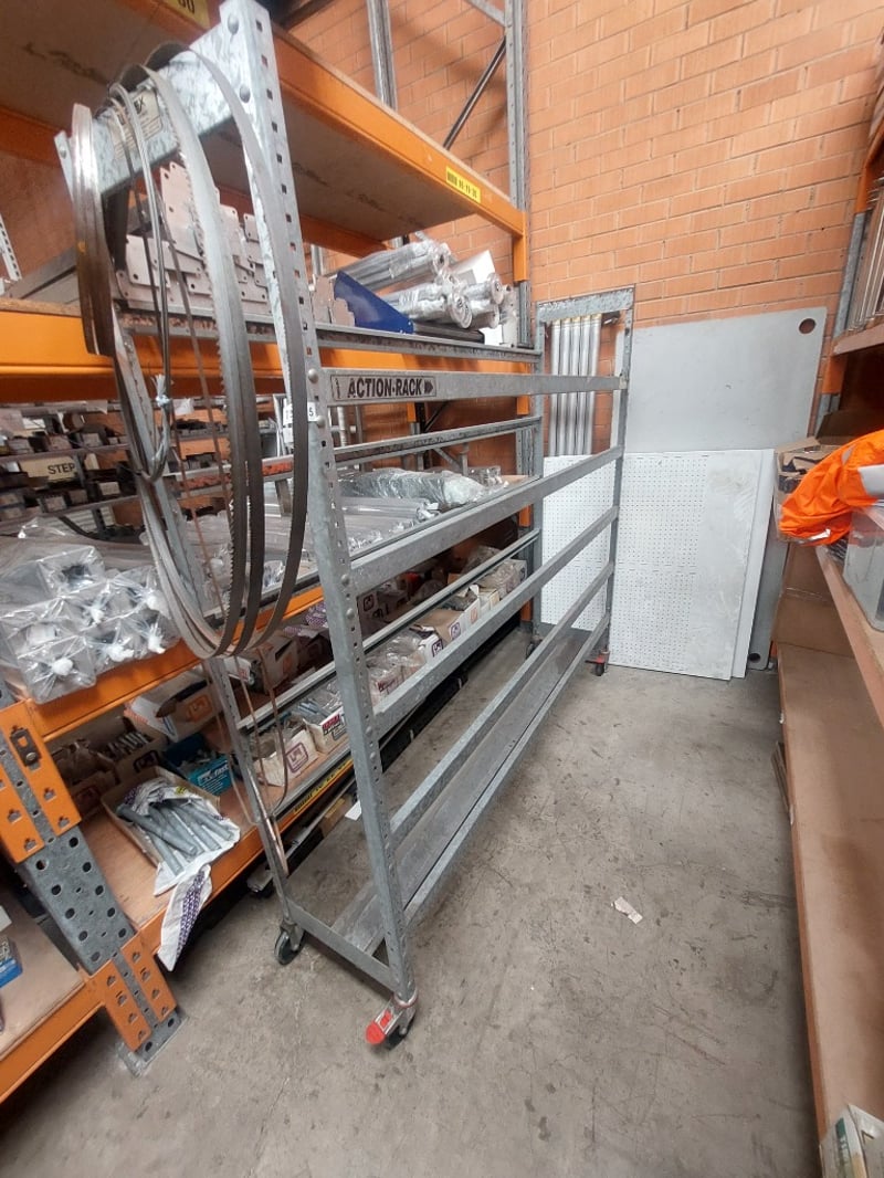 Industrial mobile shelving unit by Action-Rack (Reflex Handling & Storage Equipment). Galvanised steel frame construction with multiple adjustable shelves featuring orange safety rails. Unit mounted on four heavy-duty castor wheels for easy mobility. Note: Signs of wear