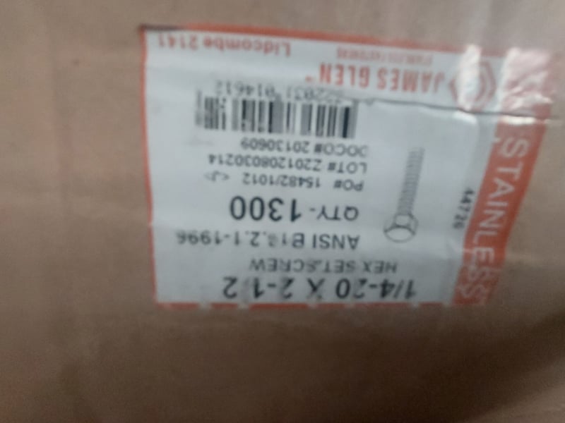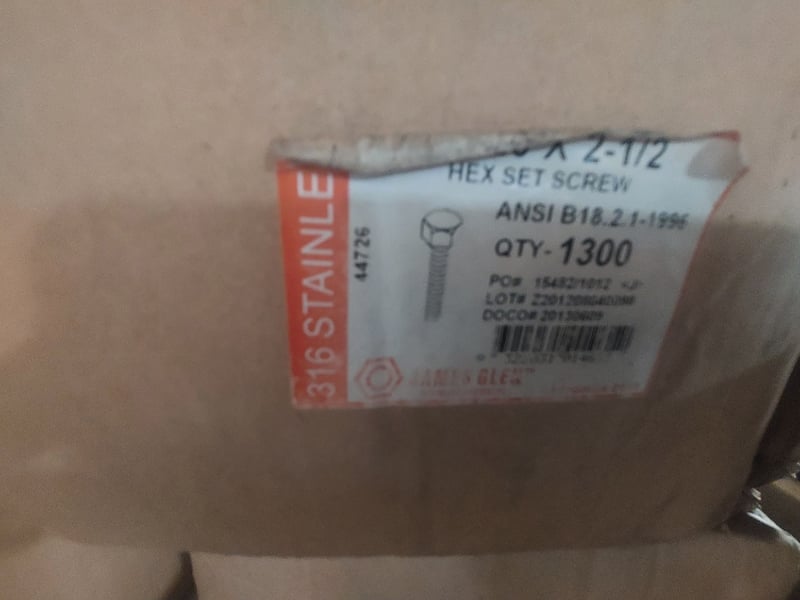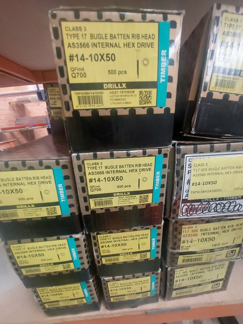 Comprehensive lot, includes hardware and fastener inventory lot featuring industrial-grade components. Includes multiple boxes of Drillx Class 3 Type 17 Bugle Batten Rib Head screws (#14-10x50, AS3566 internal hex drive, QFind Q700), Stanley hex set screws (1/2"-12x1-1/2" ANSI B18.2.1-1996, qty 1300), and more .....Sold as Lot