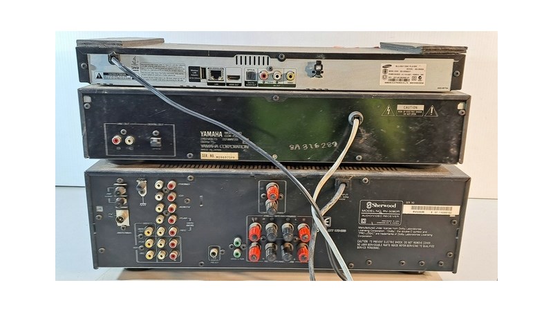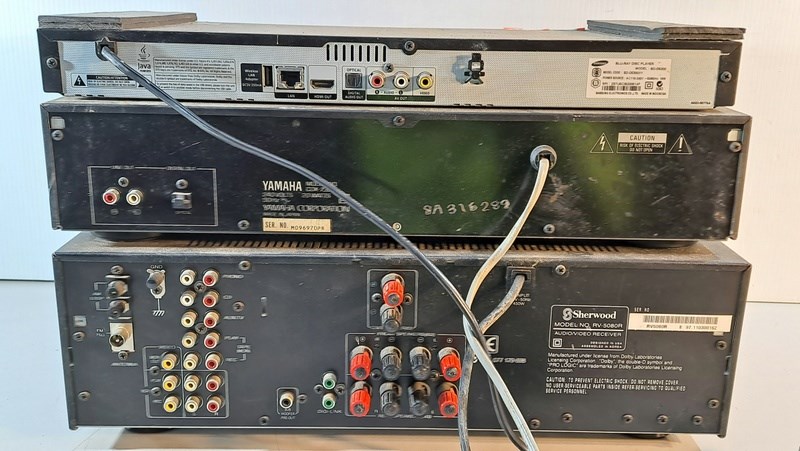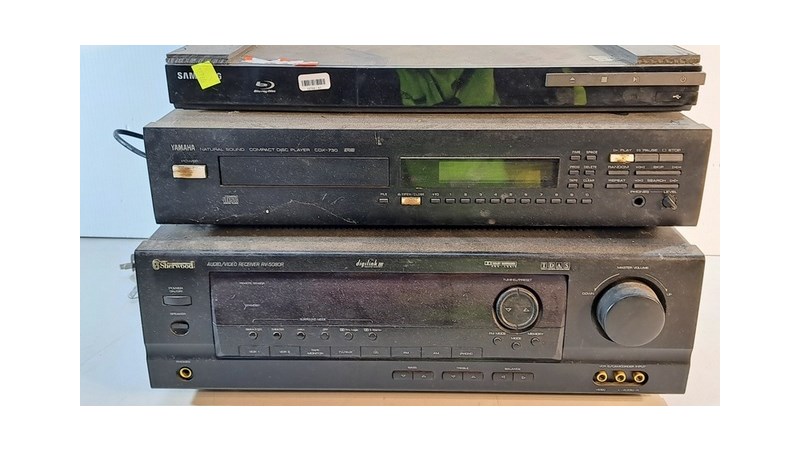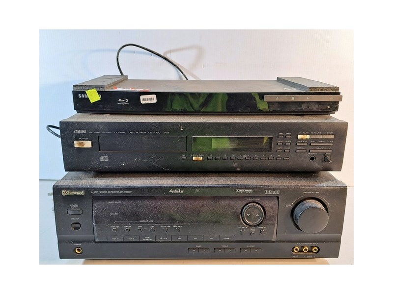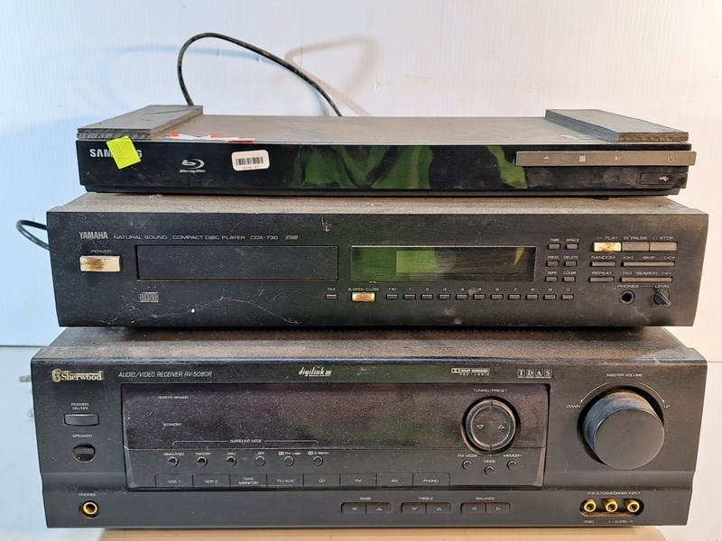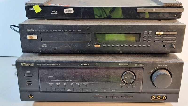 Electrical, includes Yamaha disc player CDX-730, Sherwood receiver RV-5080R and Samsung Blu-ray player