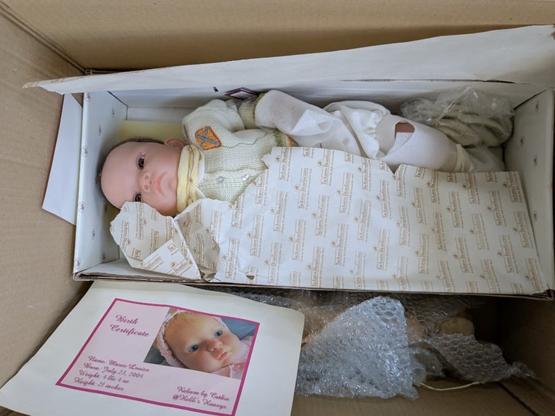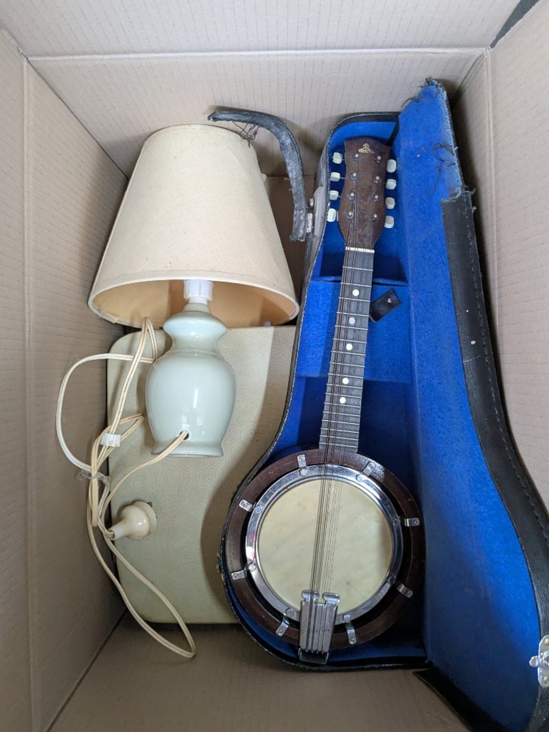 Homewares, 3 boxes including assorted dolls, Banjo with case and more Sold as lot