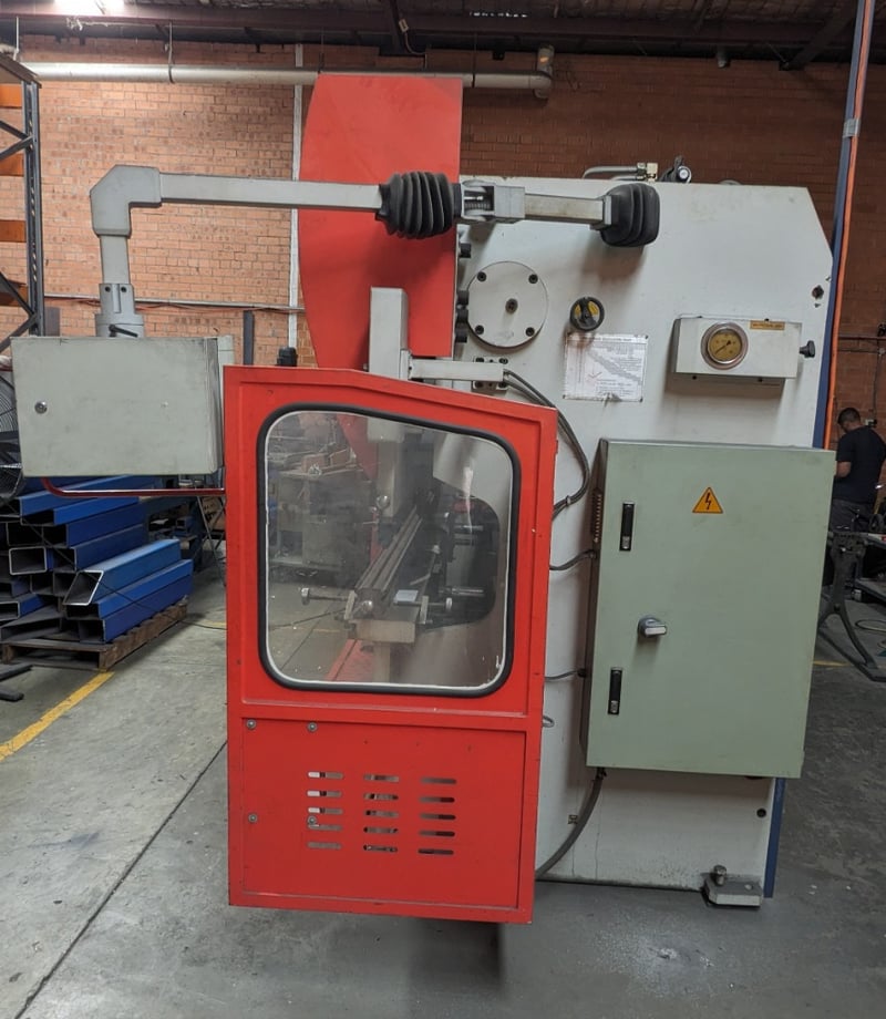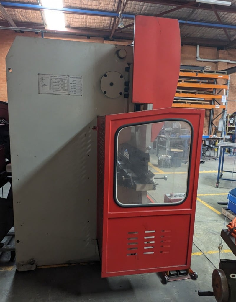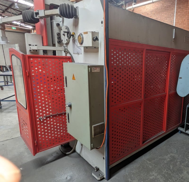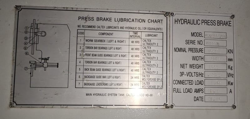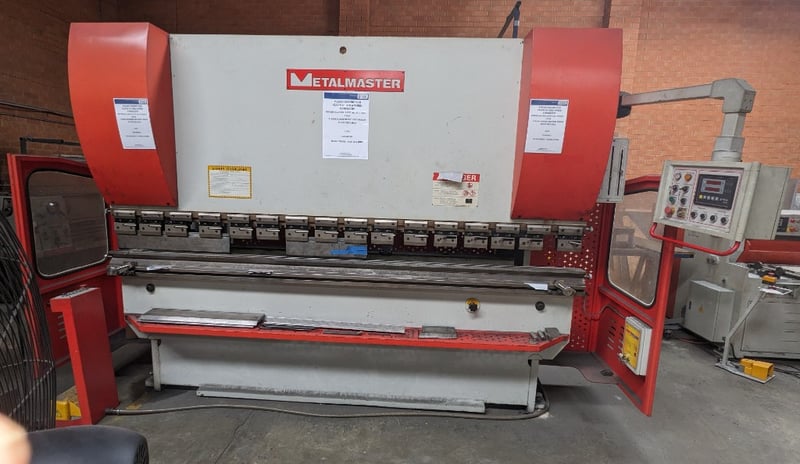 Industrial Metalmaster hydraulic press brake system comprising a large main press unit with red and white frame, featuring multiple control stations with numerical keypads and emergency stops. The system includes a full safety enclosure with perforated red metal paneling and lockable access doors, operator control cabinet with gauge displays, and comprehensive hydraulic components. Unit shows operational wear consistent with industrial use. Equipped with adjustable backstop mechanism, foot pedal controls, and integrated lubrication system. Includes detailed maintenance documentation and lubrication chart for worm gearbox, torsion bar bearings, and guide beam components with recommended Caltex hydraulic oil specifications.