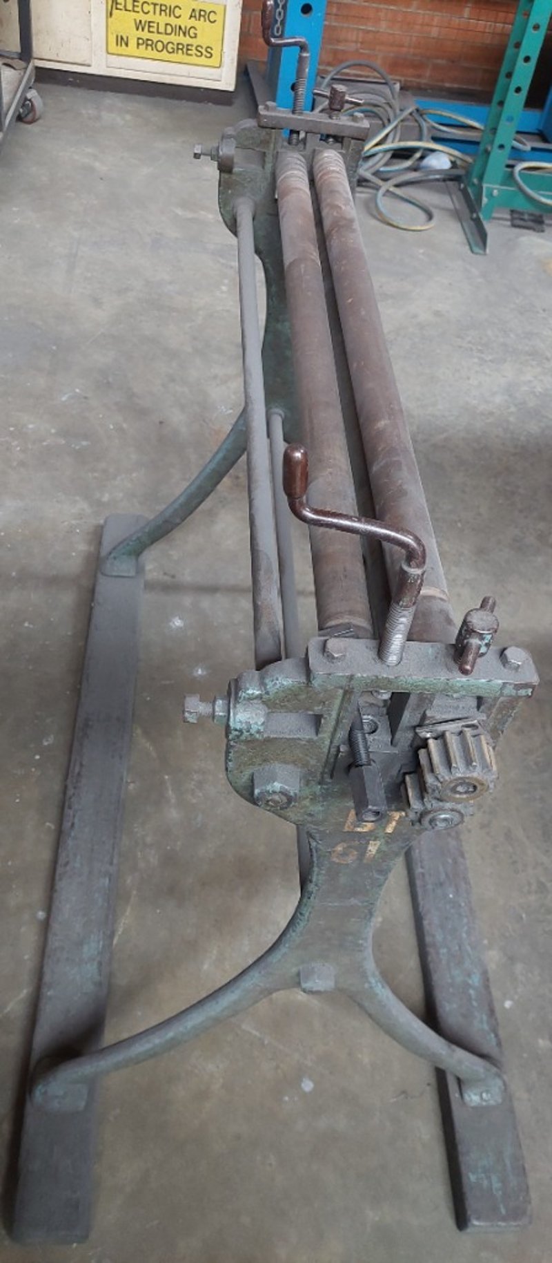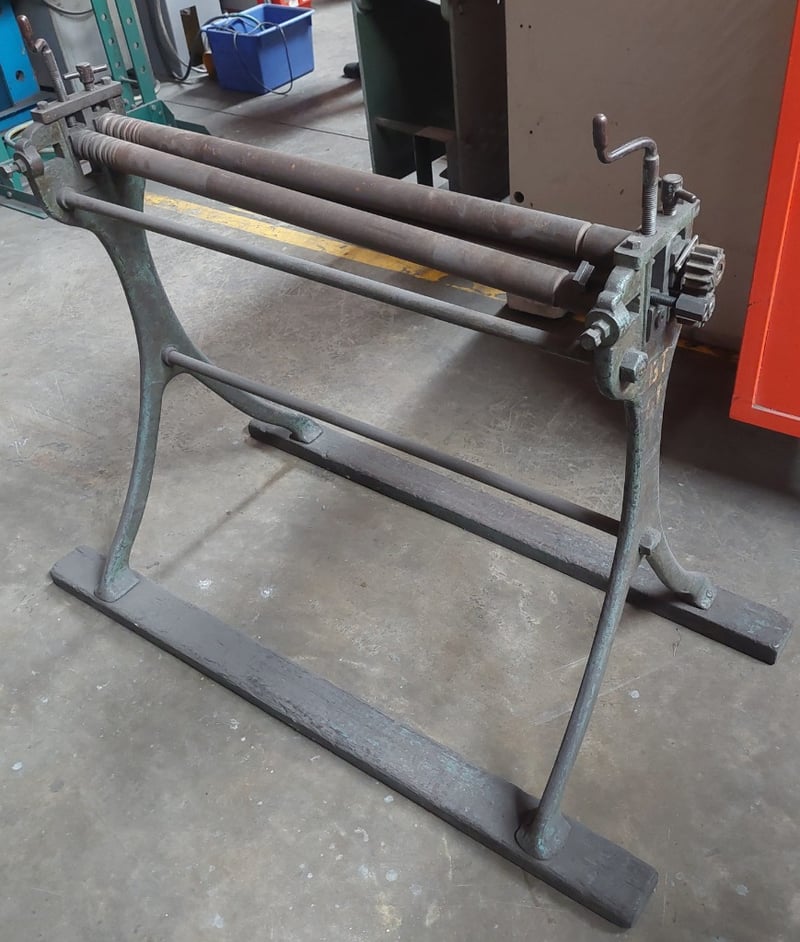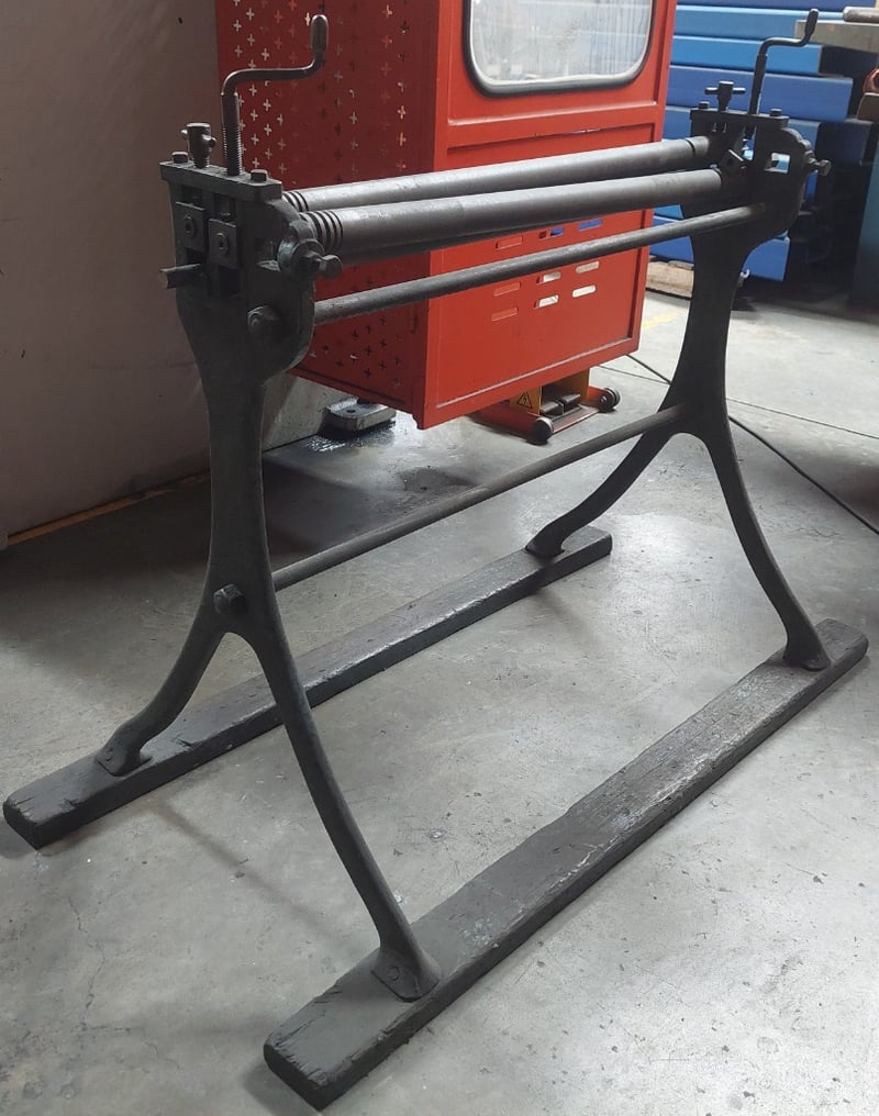 Manual sheet metal roller used for curving sheet metal into cylindrical or conical shapes. Dimensions: 101cm L, 65cm W, 105cm H Note: item is untested, signs of wear.