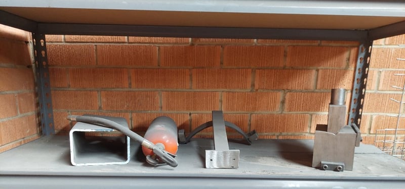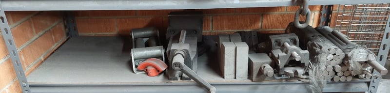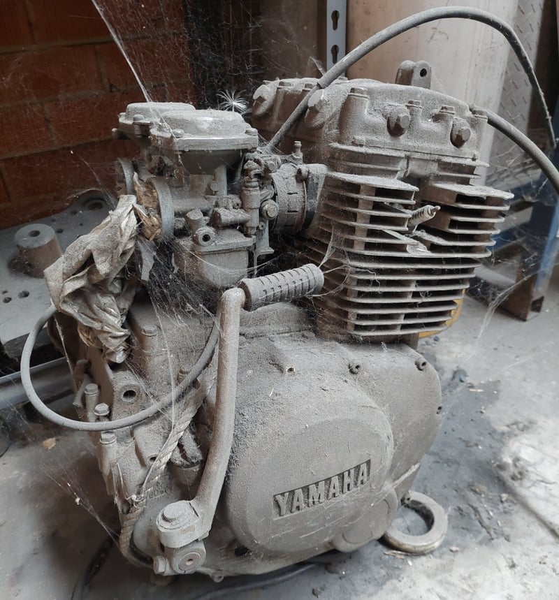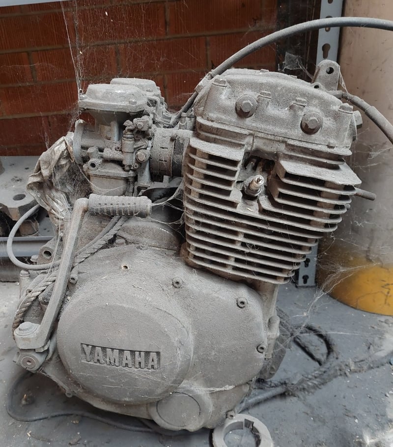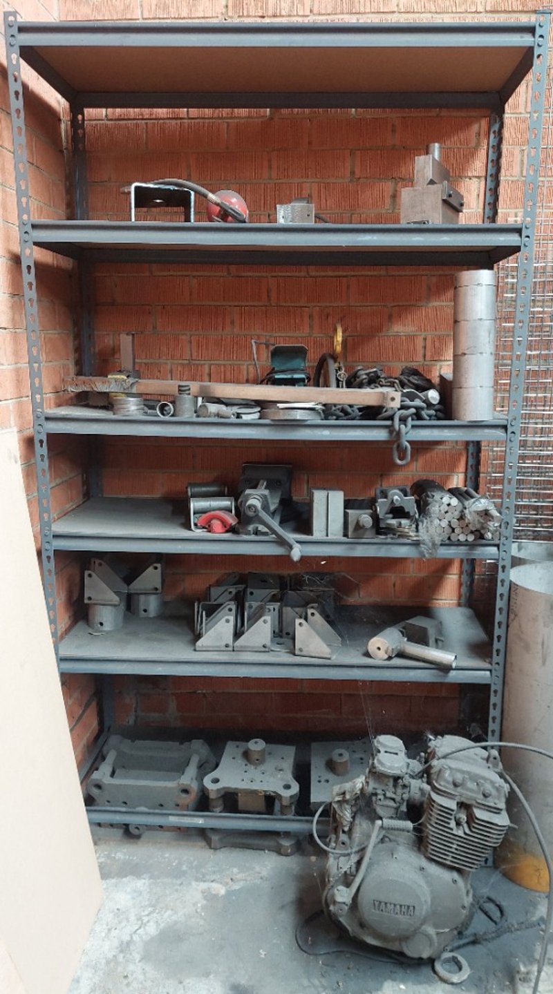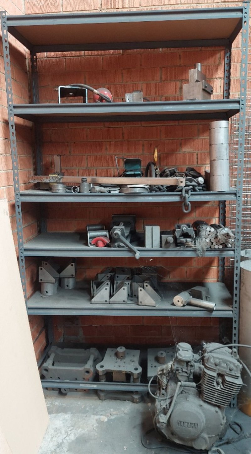 Heavy-duty industrial metal shelving unit filled with various machine parts, tools, a Yamaha engine and more...Dimension: 122cm L, 45cm W, 212cm HSold as a lot.Note: items are untested, signs of wear.