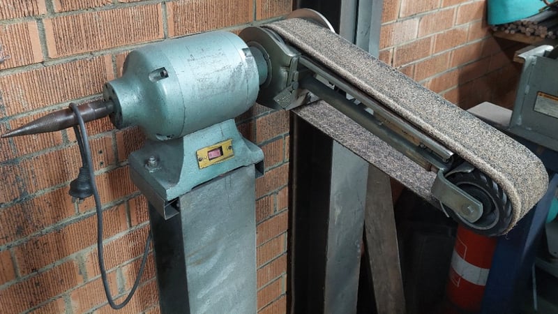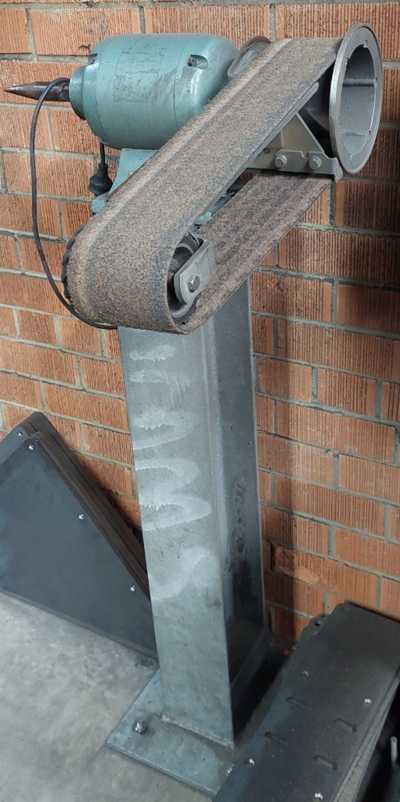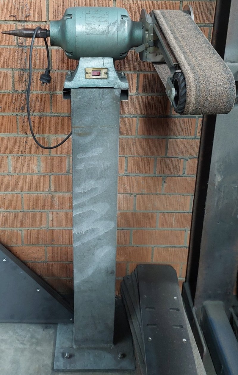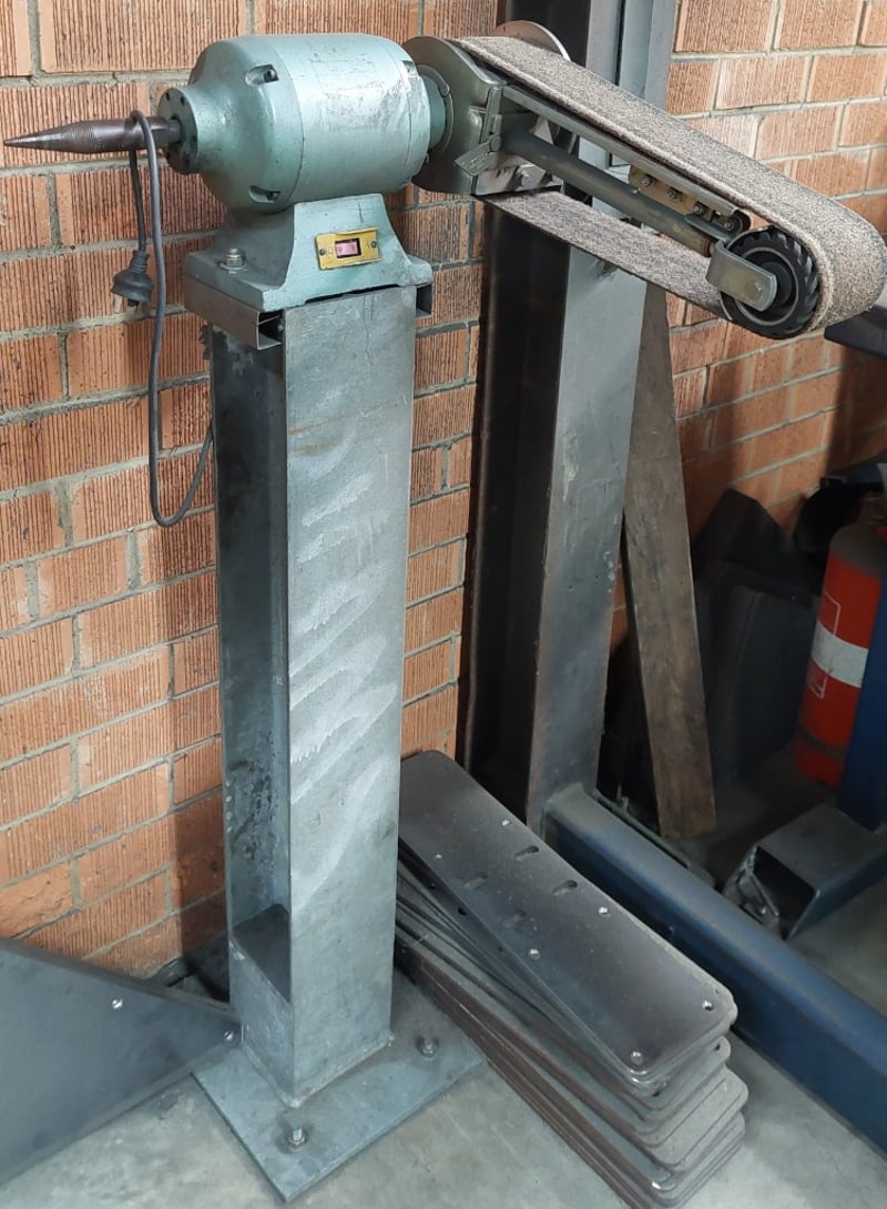 Pedestal-mounted belt grinder. Dimensions: 60cm L, 60cm W, 130cm H Note: item is untested, signs of wear.