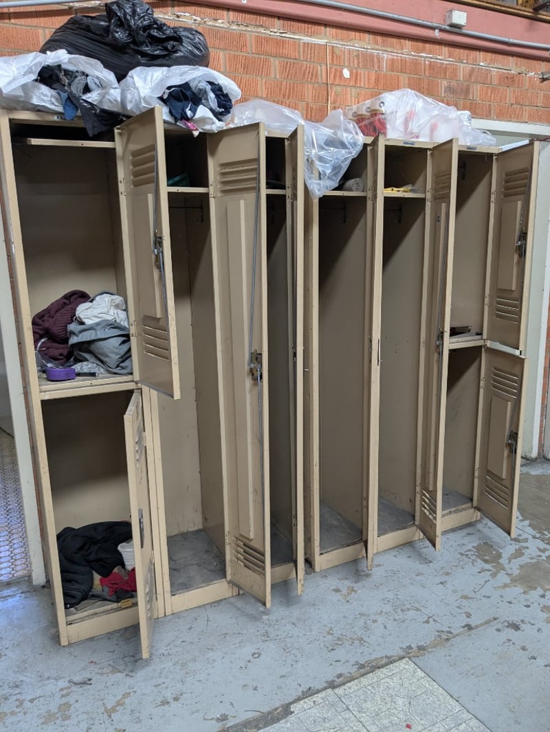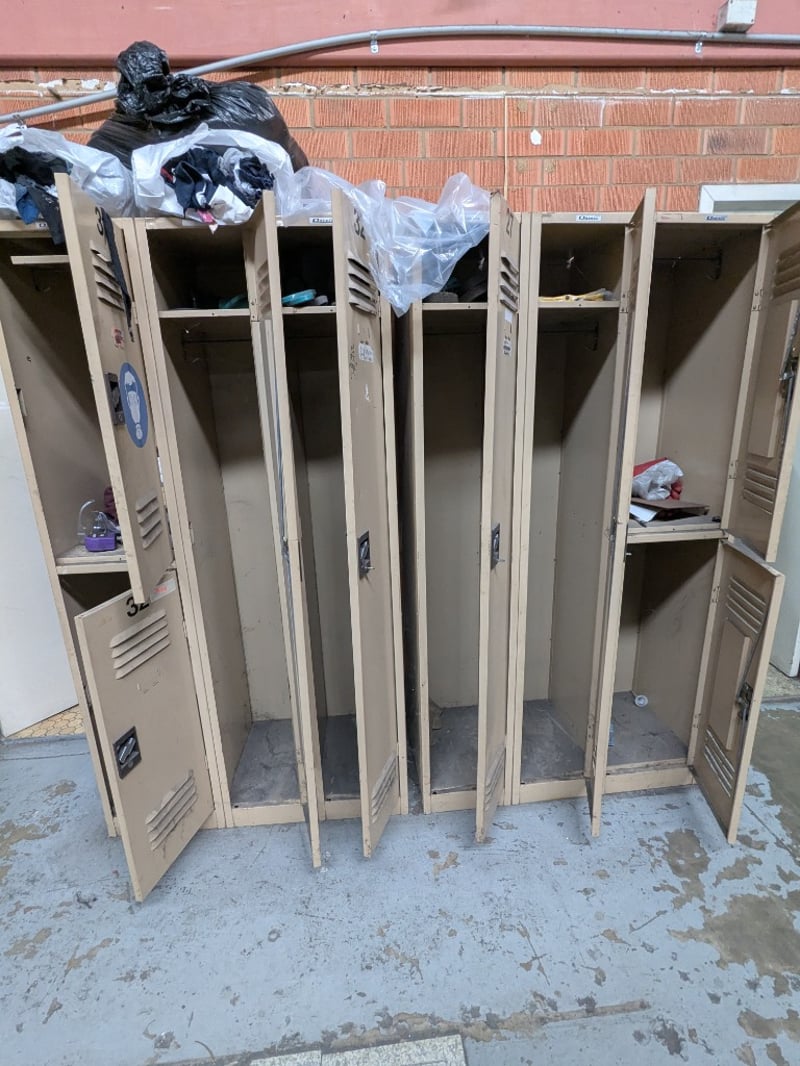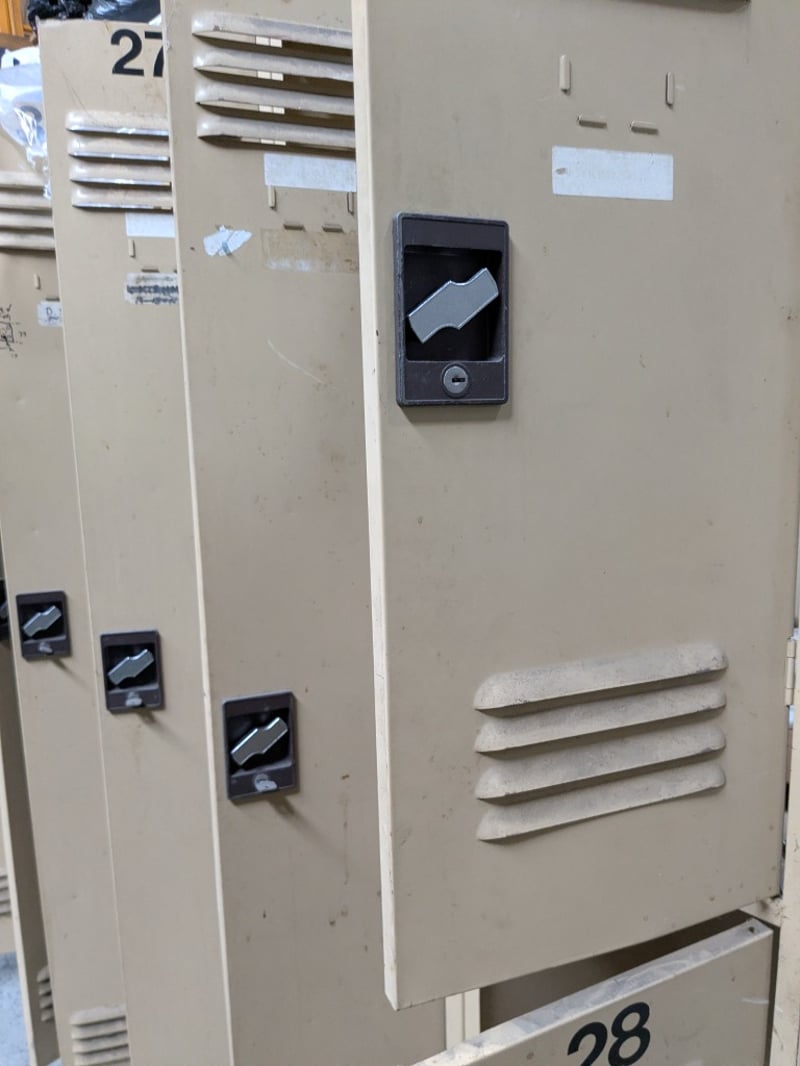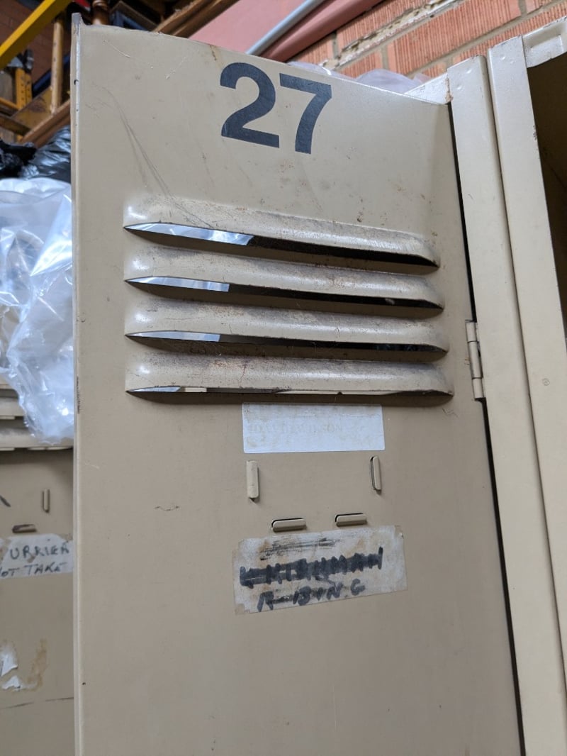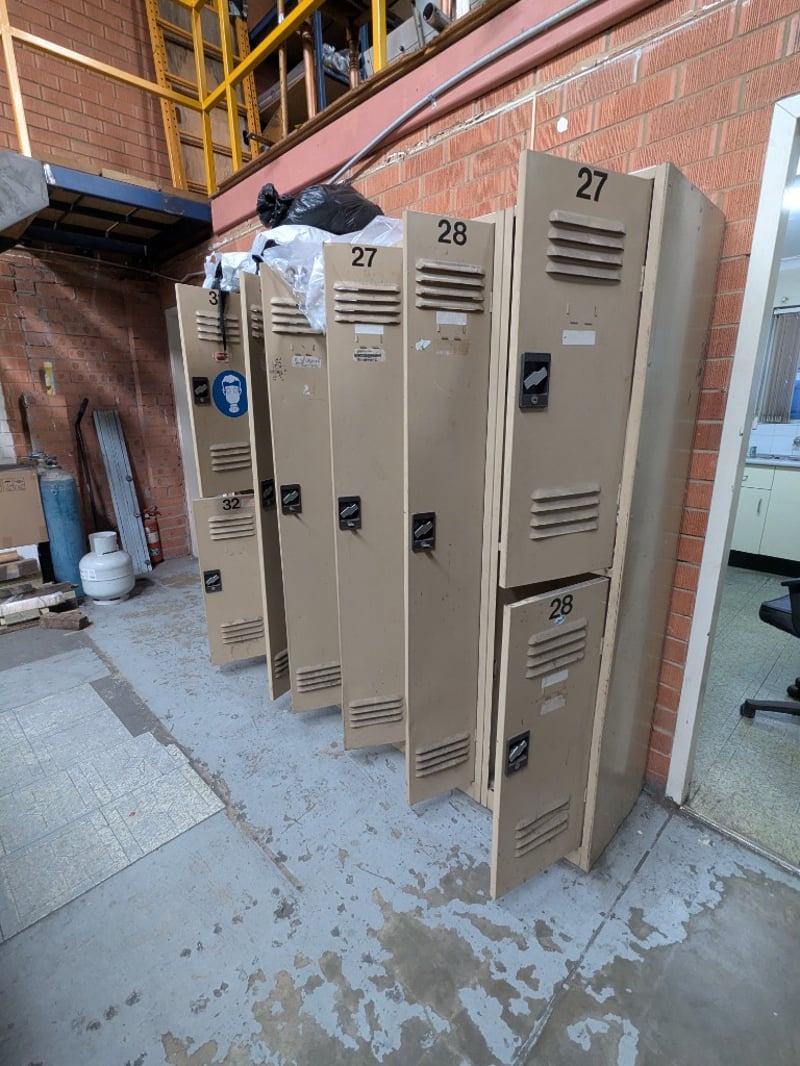 Industrial metal storage lockers, 8 units, mix of single and double-tier locker units.Dimensions: 180cm H, 200cm L, 18cm WSold as a lotNote: Signs of wear and tear