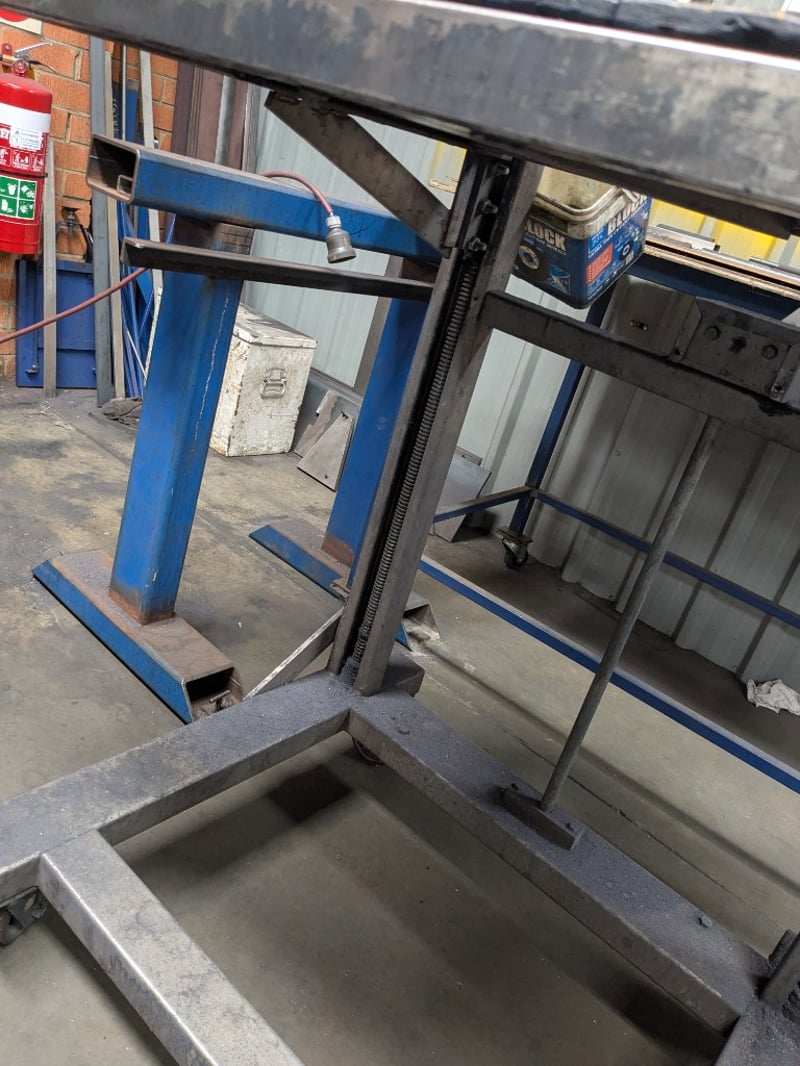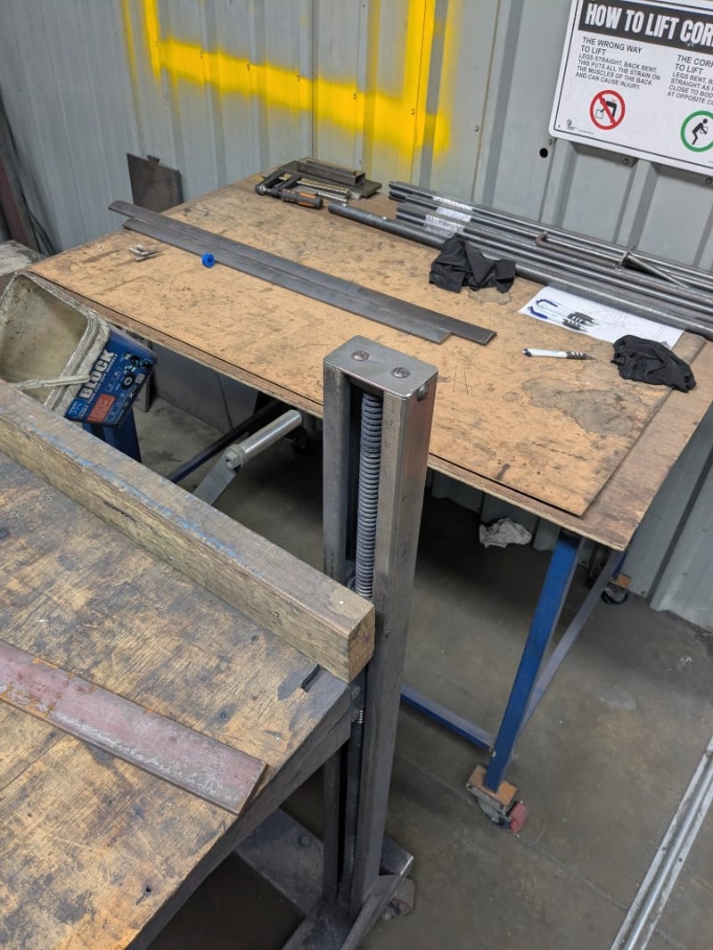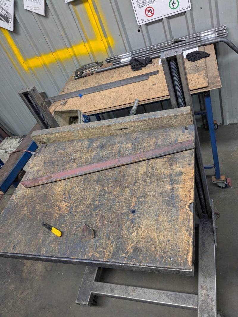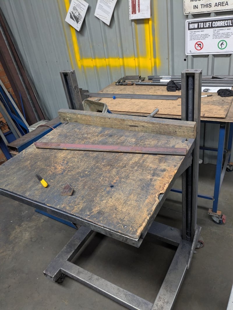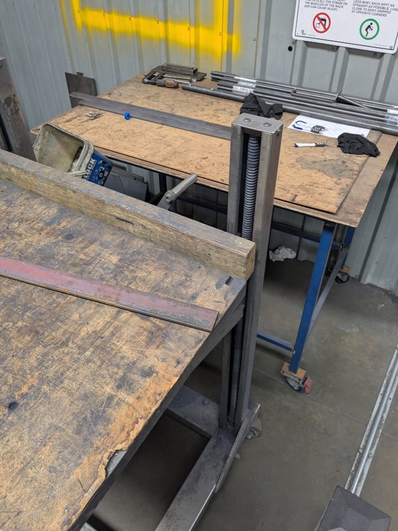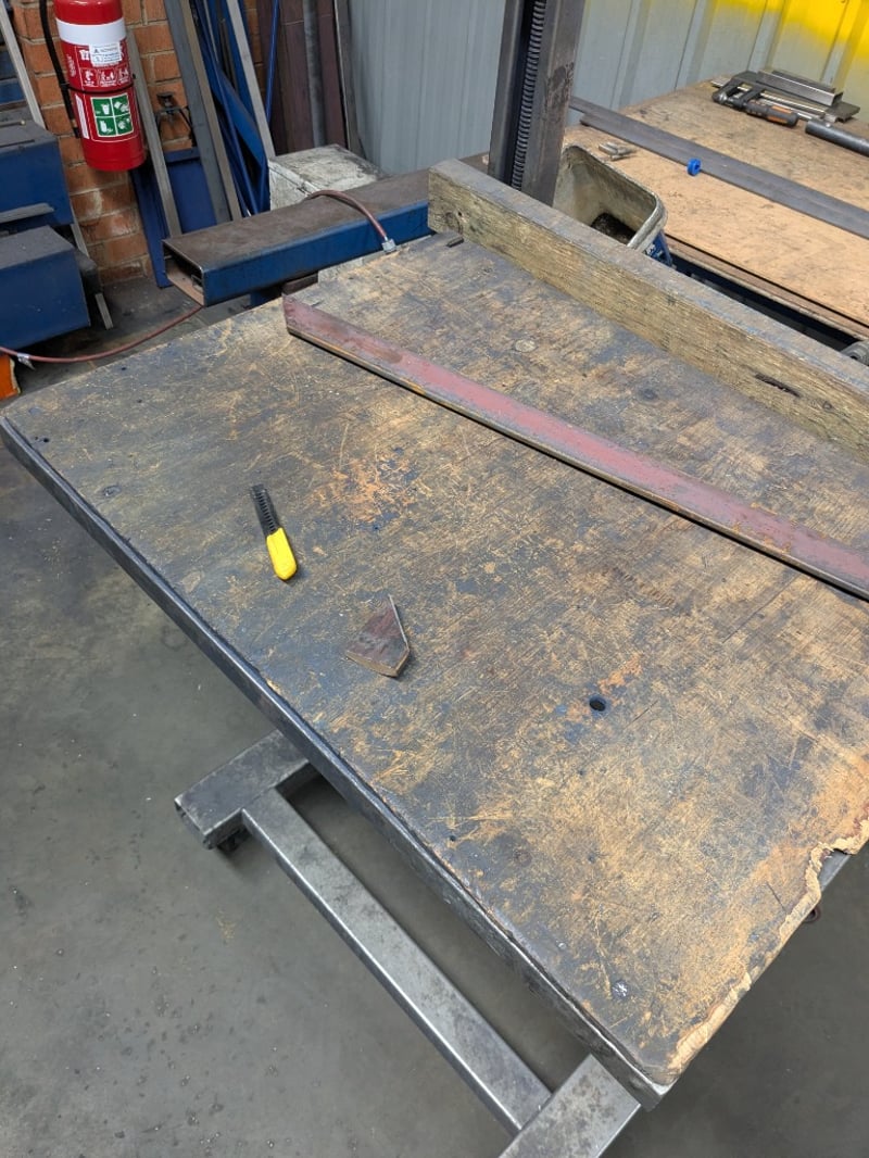 Set of three workshop tables, timber and metal. Sold as a lot. Note: Signs of wear and tear