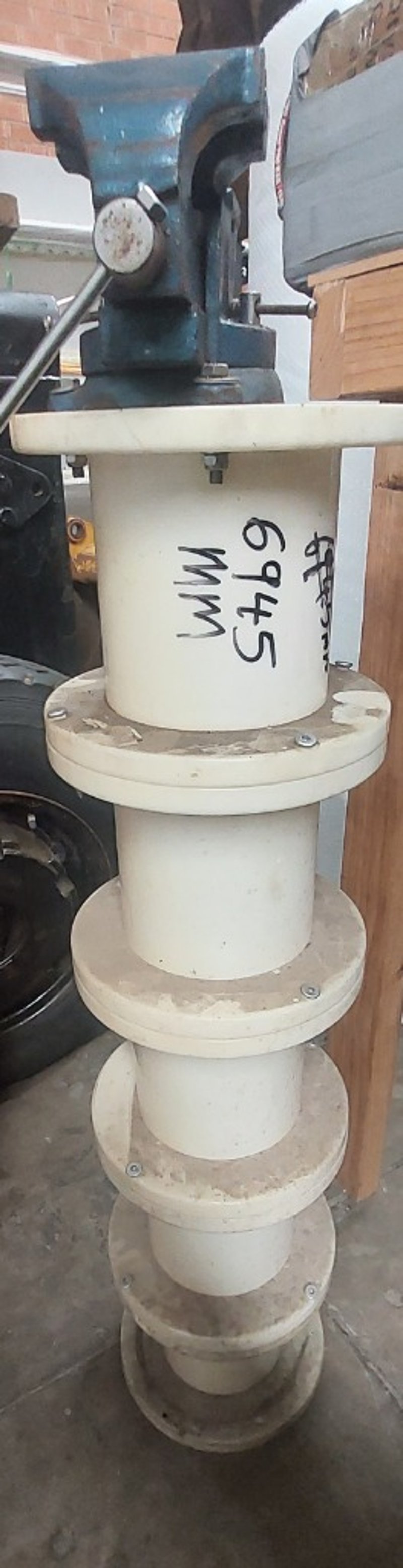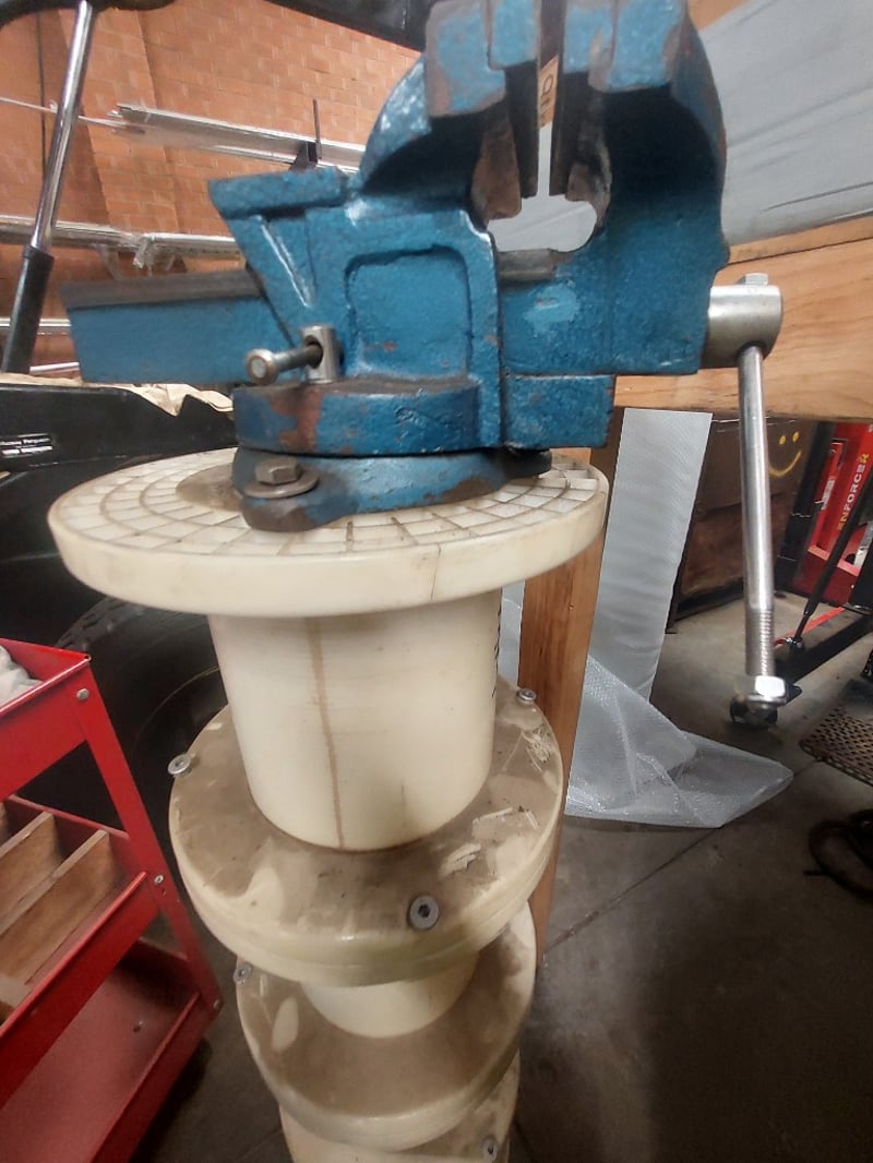 Vise assembly featuring a robust blue cast iron vise head mounted on a cream-coloured cylindrical pedestal base.