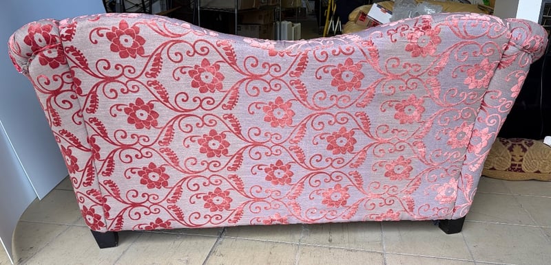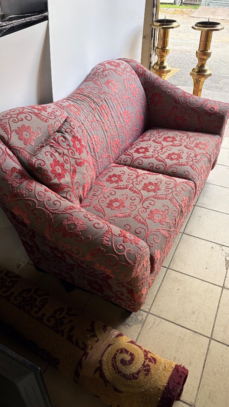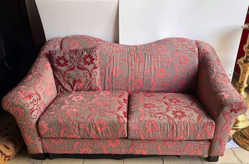 Couch, red and grey finish upholstery with floral design includes one cushion.Dimensions: H 84cm , W 158cm, D 87cm