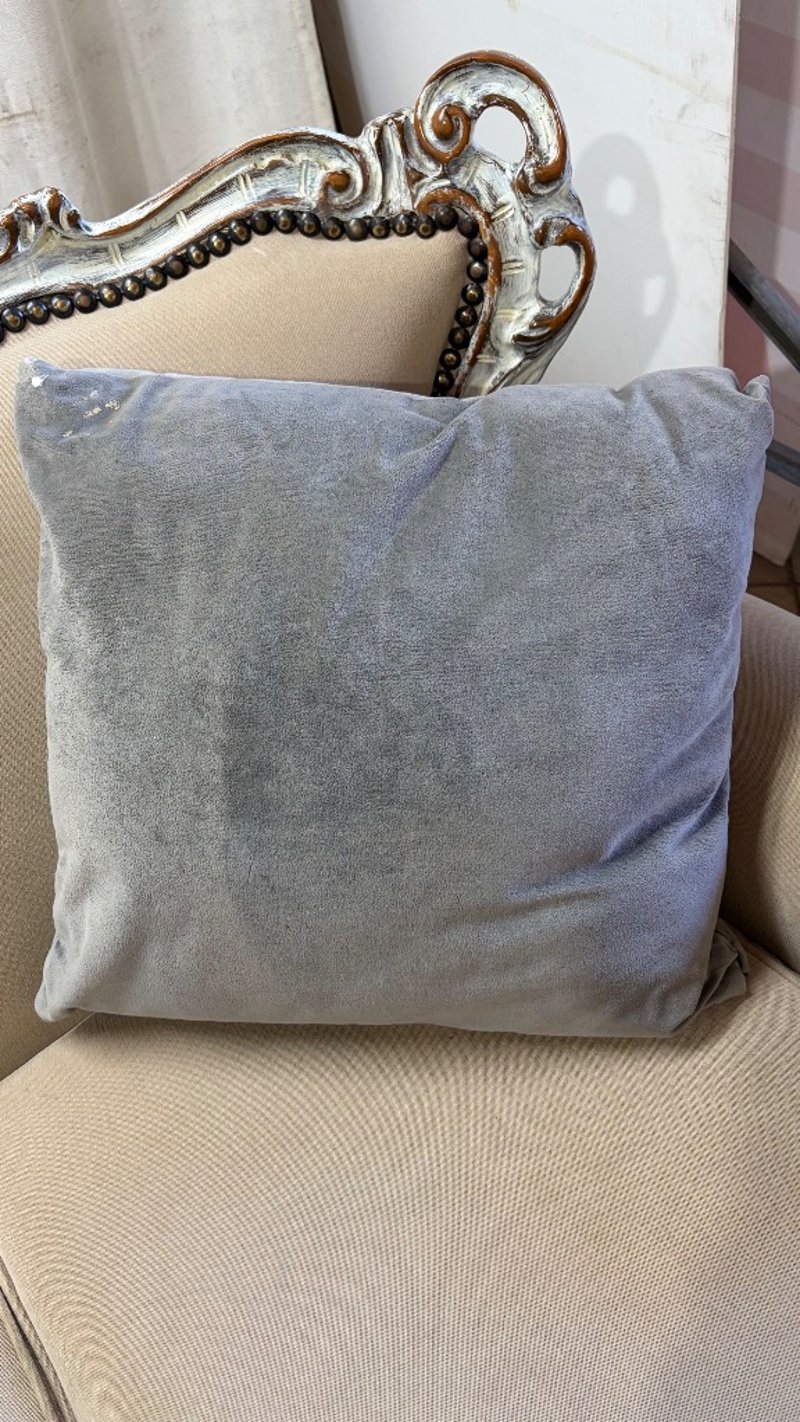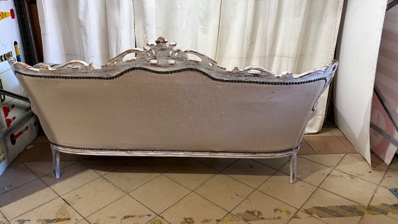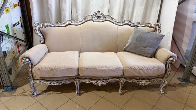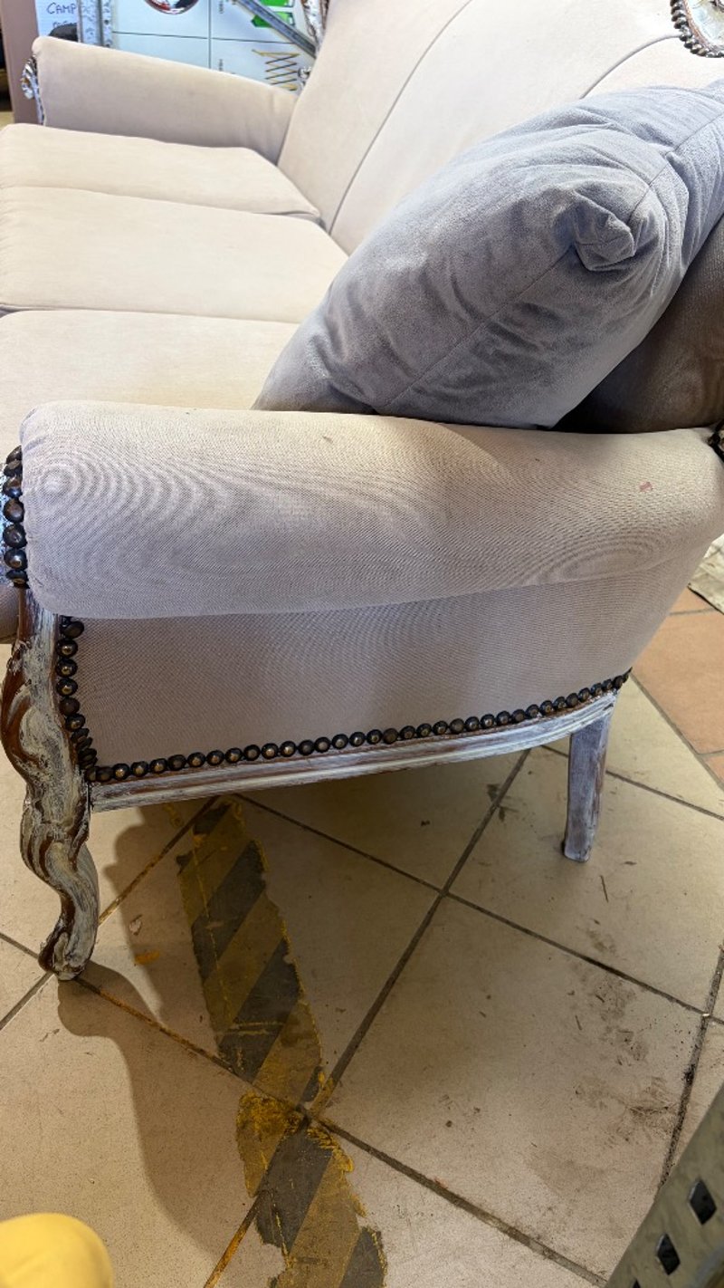 Sofa, Decorative timber frame, three seater, tan finish upholstery, one grey pillow included.