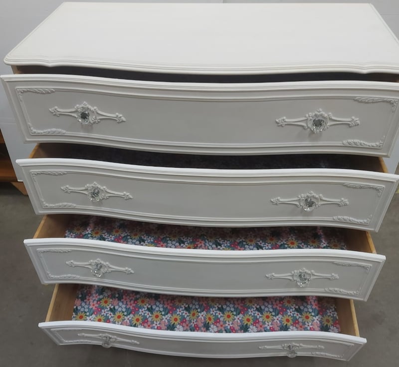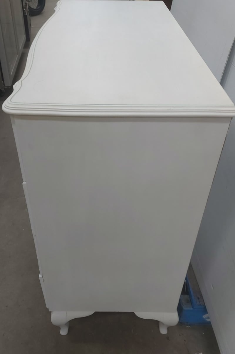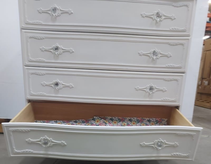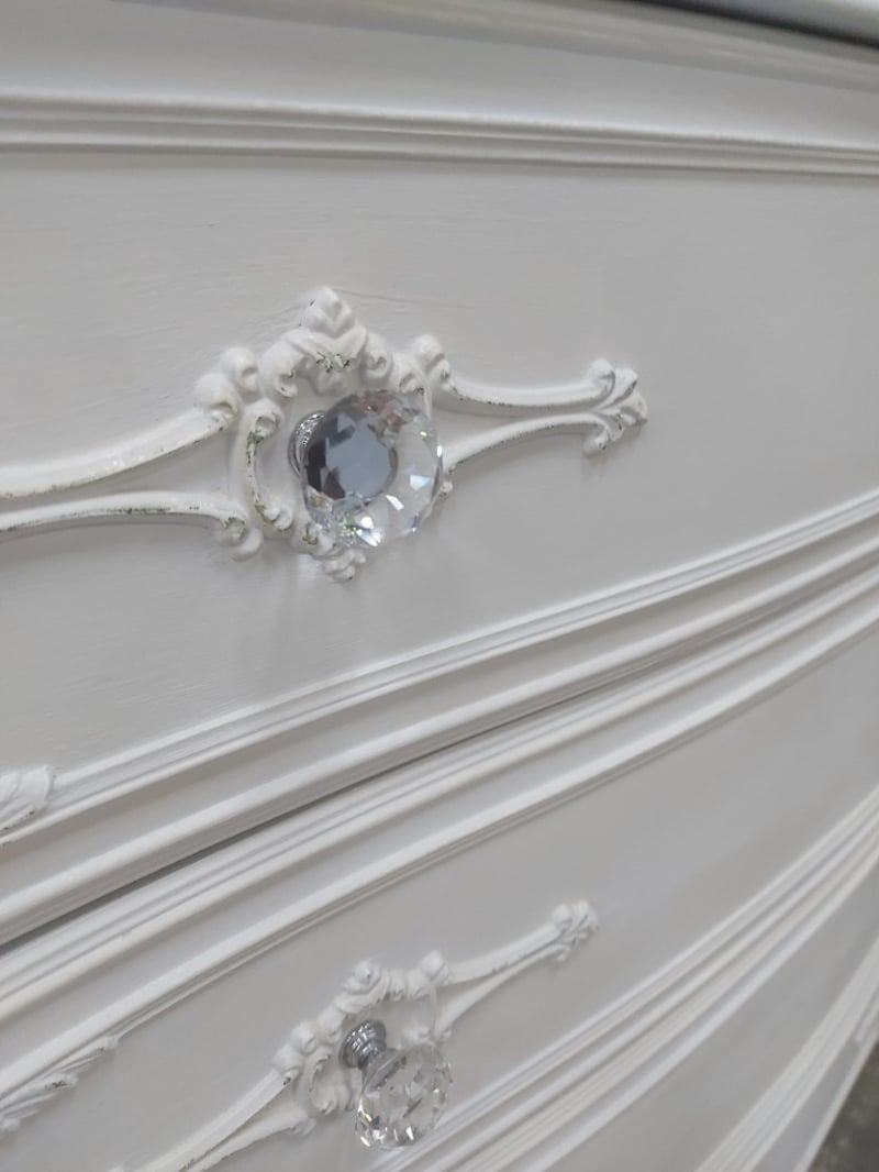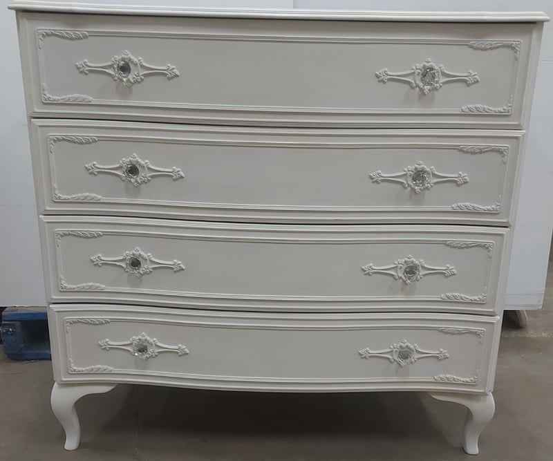 Elegant white painted four-drawer chest of drawers featuring ornate embellishments. DIMENSIONS: 92cm (H), 94cm (W), 44cm (D)