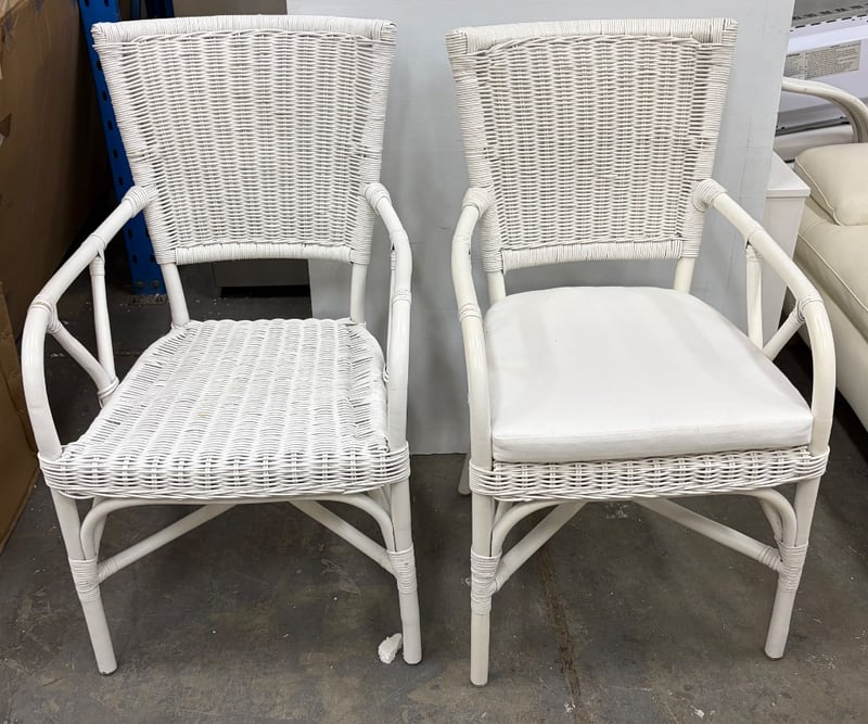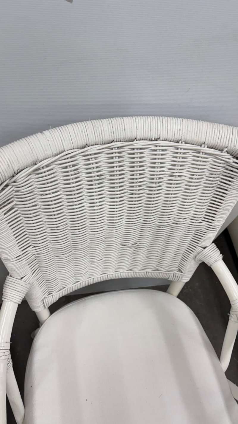 Pair of white woven rattan armchairs featuring timber frames with curved cross-bracing. Includes one cushion.Dimensions: 95cm (H), 53cm (W), 65cm (D)SOLD AS LOT.