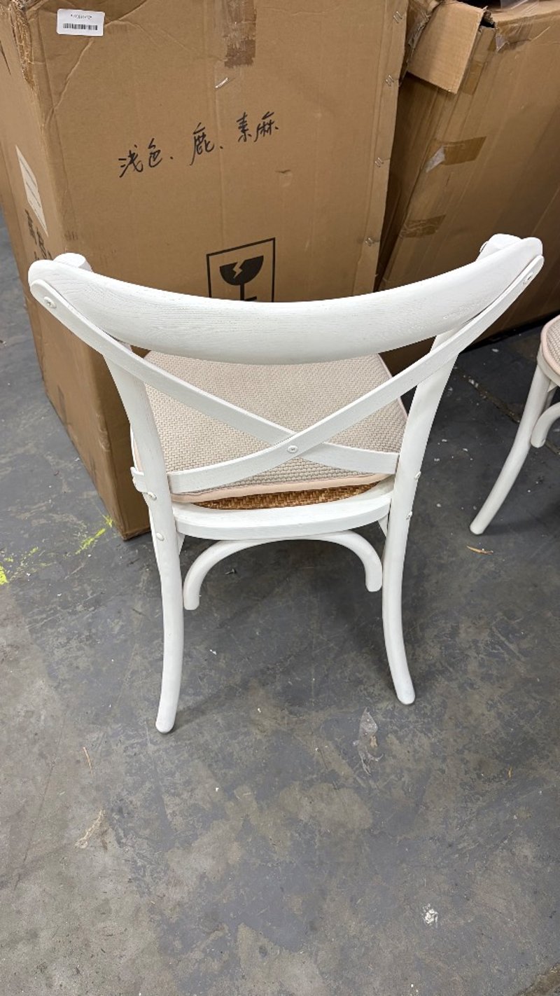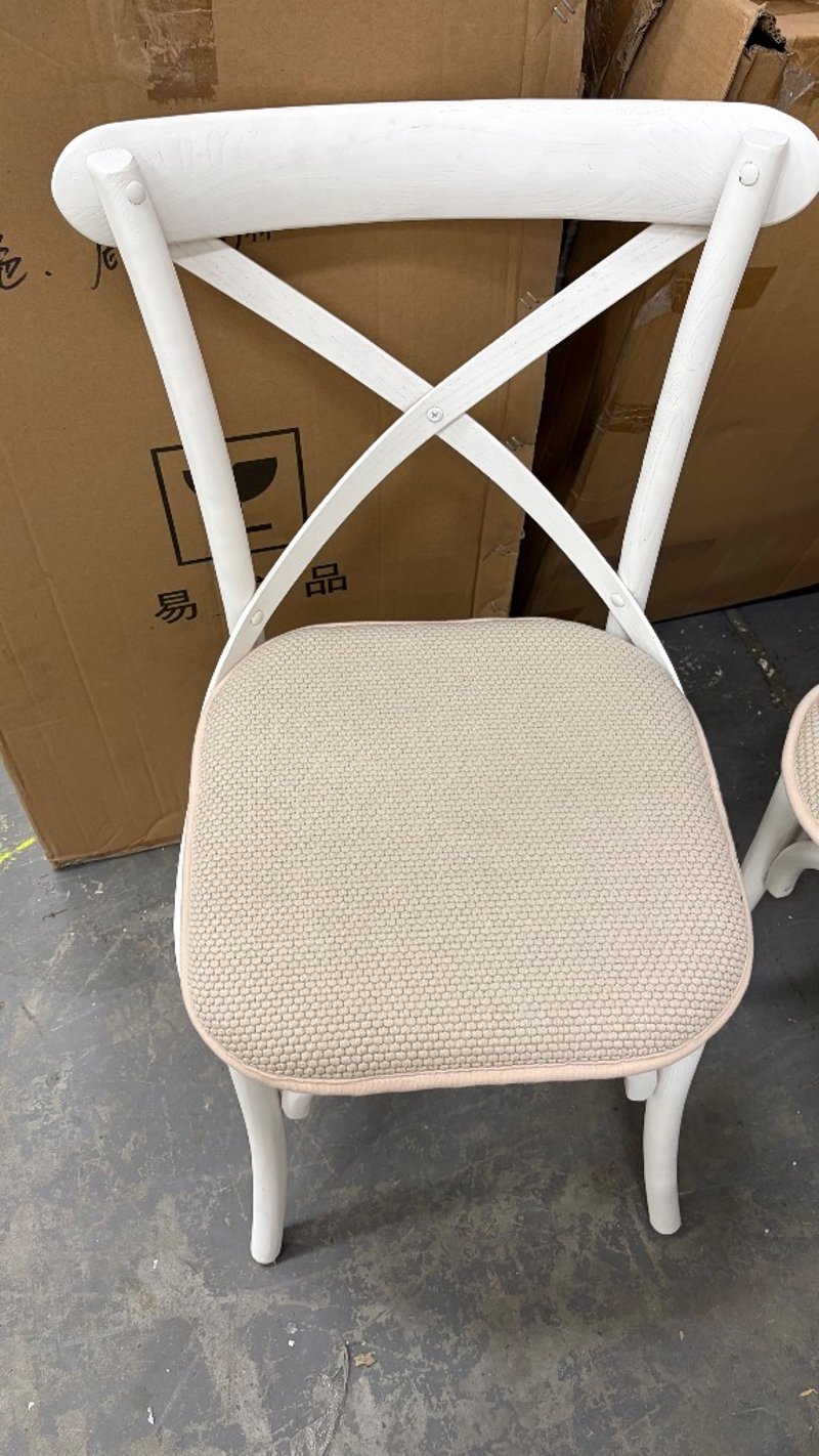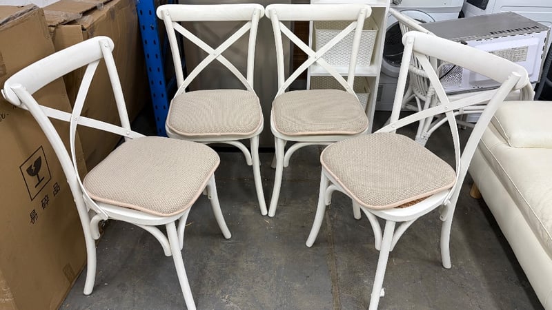 Set of four timber white finish dining chairs featuring a classic X-back design with curved top rail. Dimensions: 90cm (H), 49cm (W), 47cm (D).SOLD AS LOT.