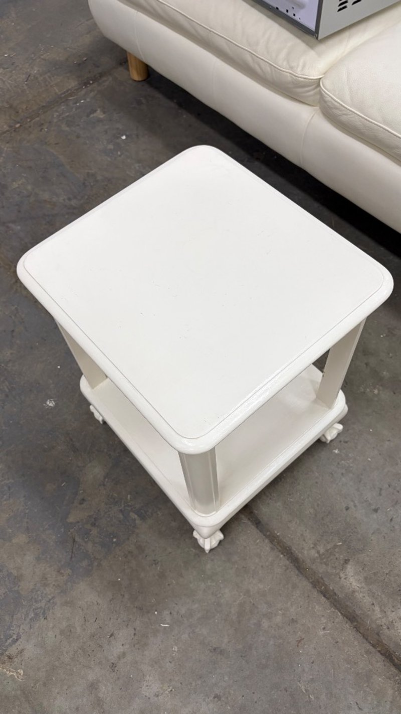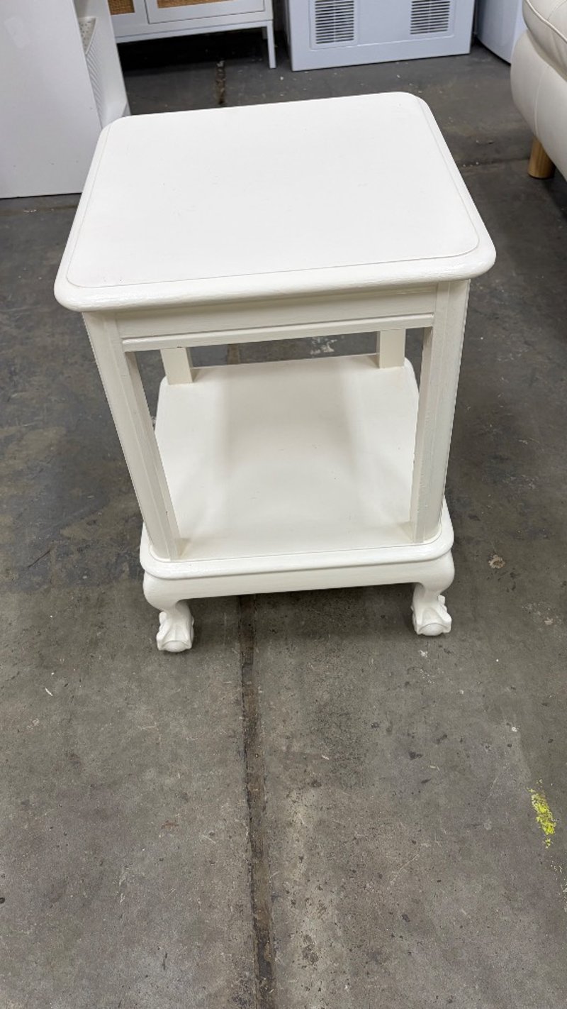 Bedside table, white finish timber featuring a two-tier design with open shelf storage. Dimensions: 54cm (H), 37cm (W), 41cm (D).