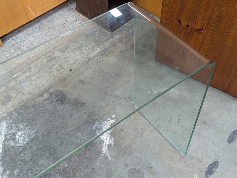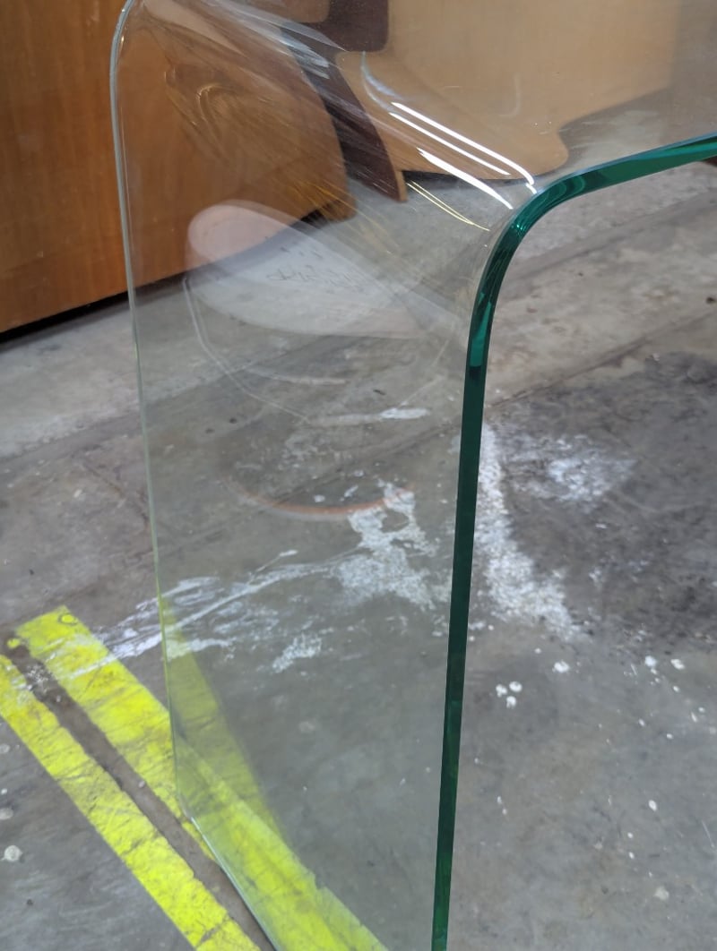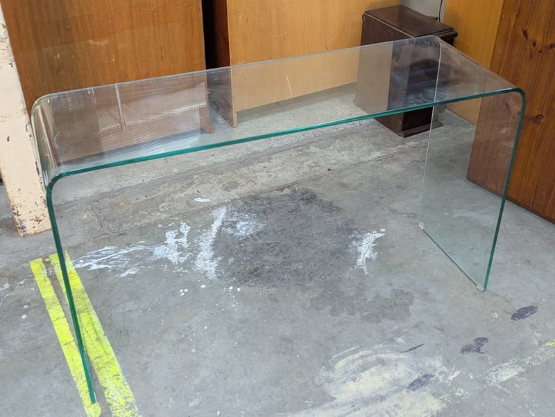 Modern glass console table featuring curved tempered glass construction with integrated green-tinted glass edging. The table showcases a minimalist design with smooth, flowing lines and a contemporary aesthetic. The curved glass panels create an elegant waterfall effect at both endsItem size: 73cm h x 124cm w x 40cm D