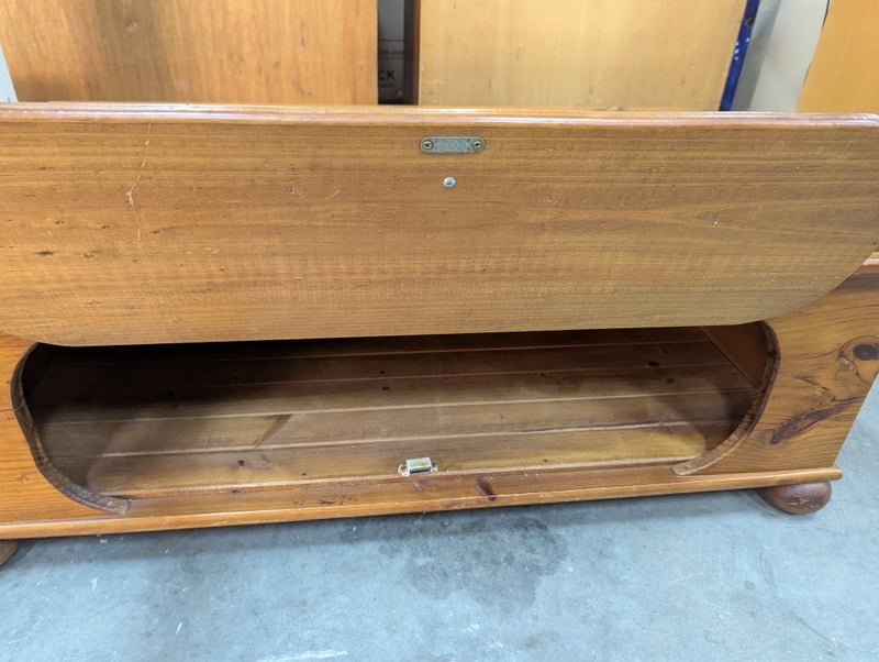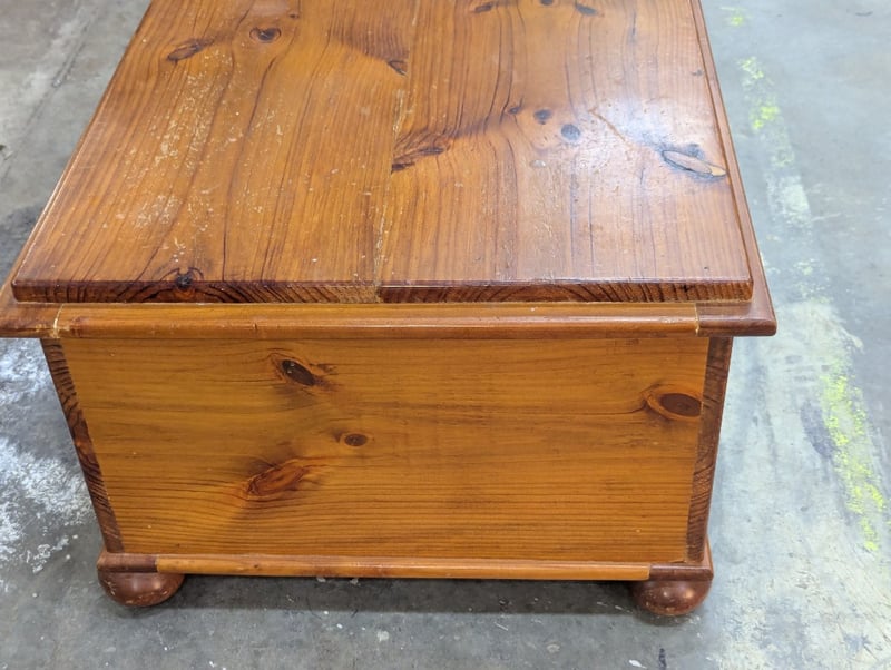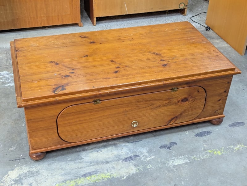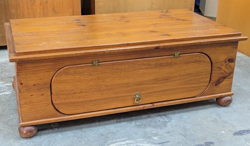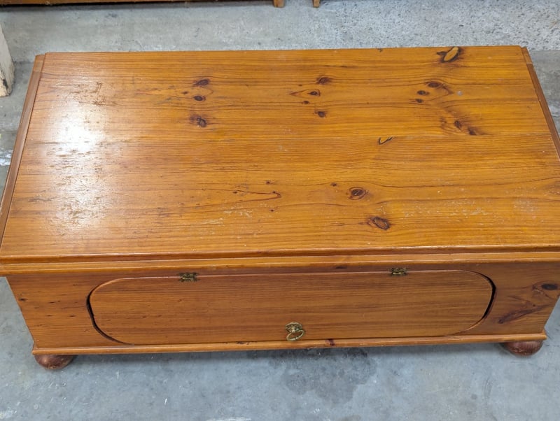 Coffee table featuring a hinged lift-top lid with brass hardware and decorative curved panel detailing to the front and back. The chest showcases solid timber construction with characteristic knots and grain throughout. Rounded bun feet provide period styling. Interior reveals a spacious storage compartment with a fitted tray. The piece displays a warm honey-golden finish with visible patina consistent with age Dimensions: 42cm h x 113cm w x 61cm d