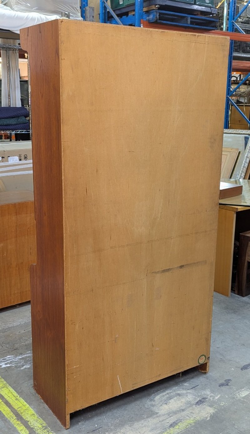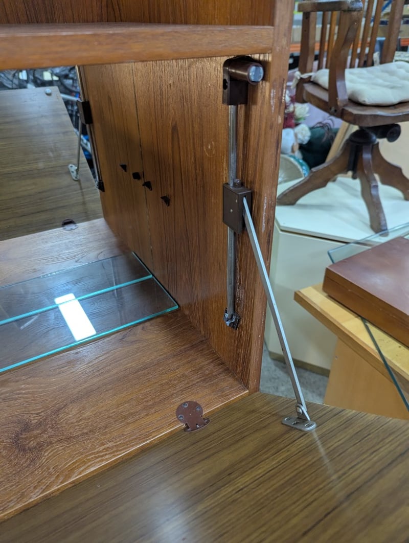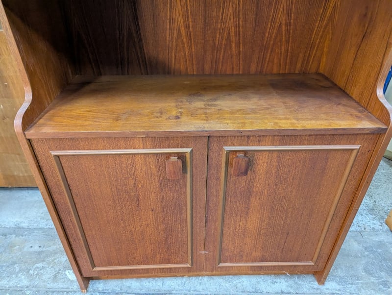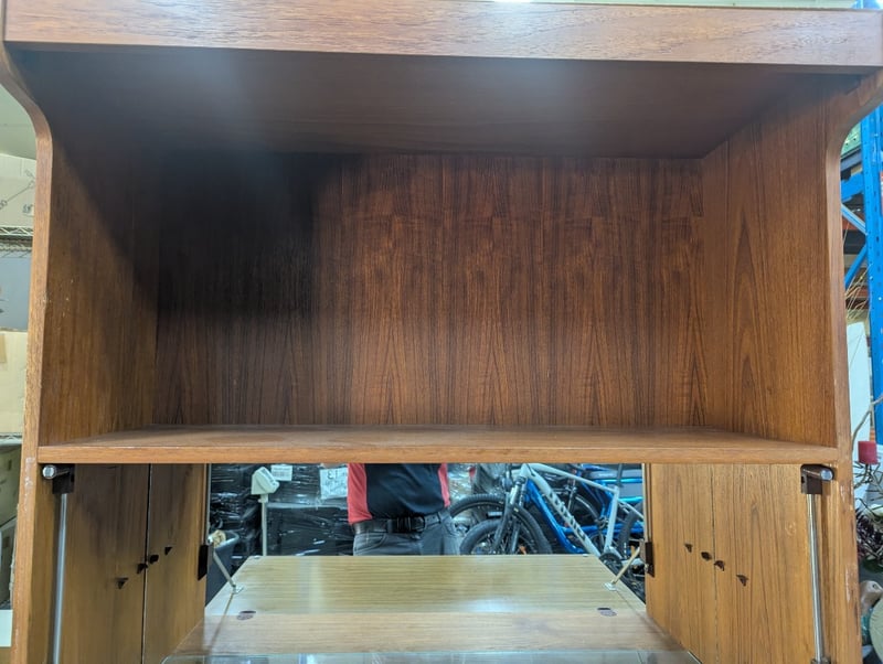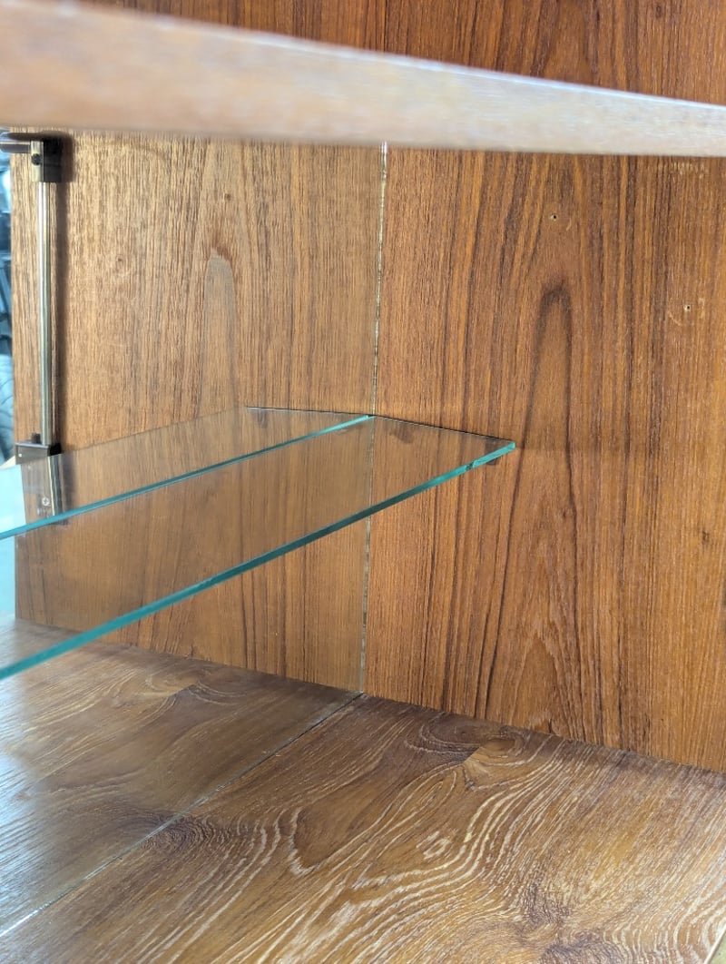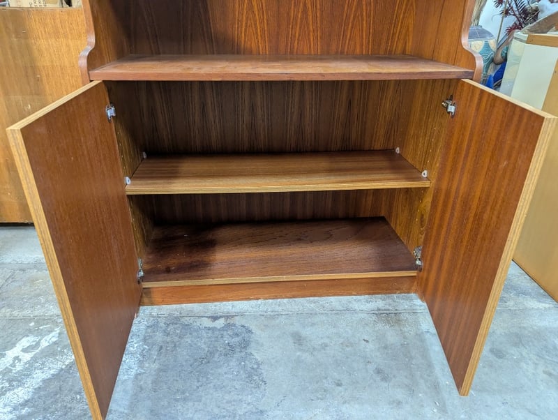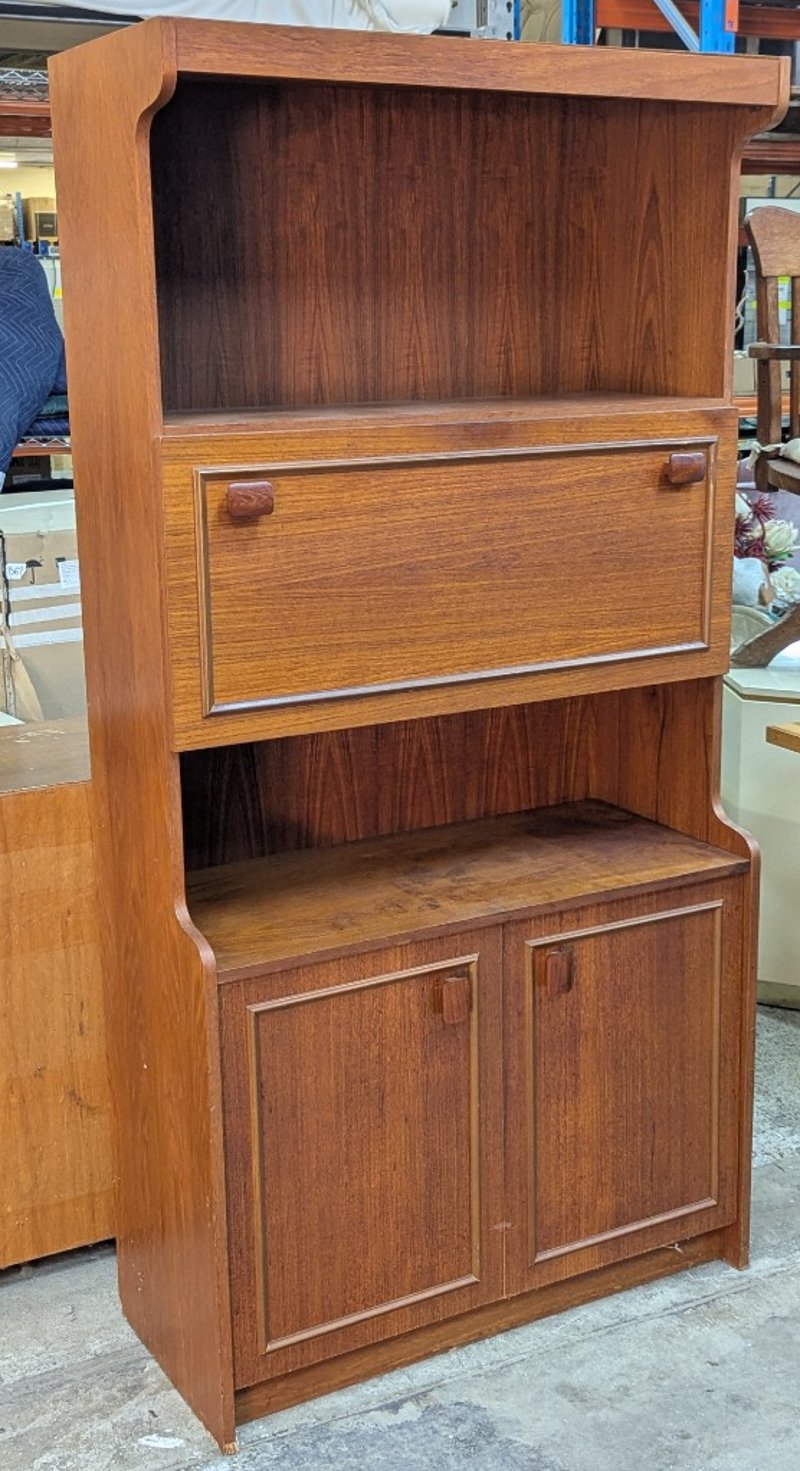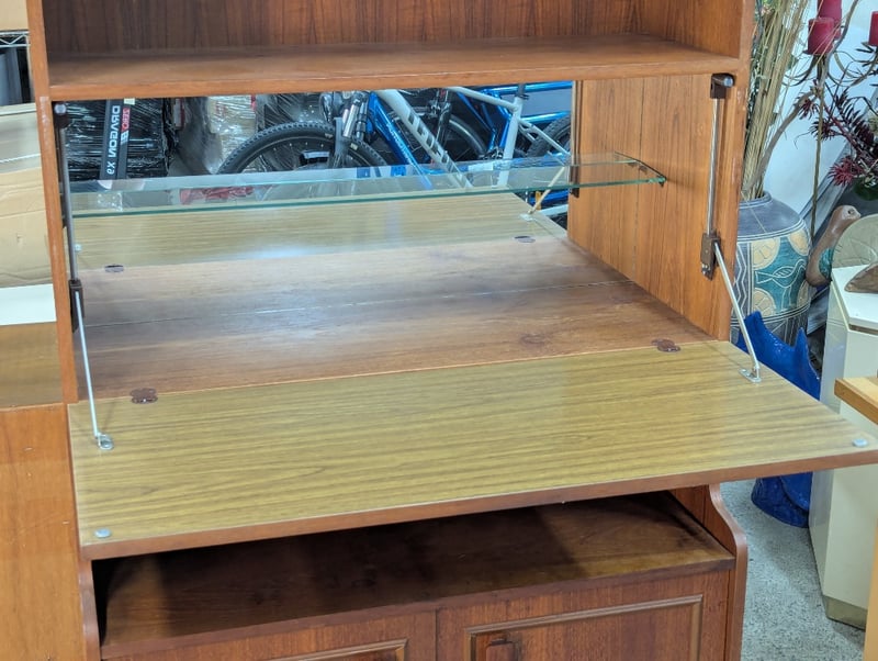 Timber display cabinet, wood finish, lower two door cabinet with one shelf, fold out centre storage with interior glass shelf and mirror back, Dimensions: 180cm h x 90cm w x 40cm d