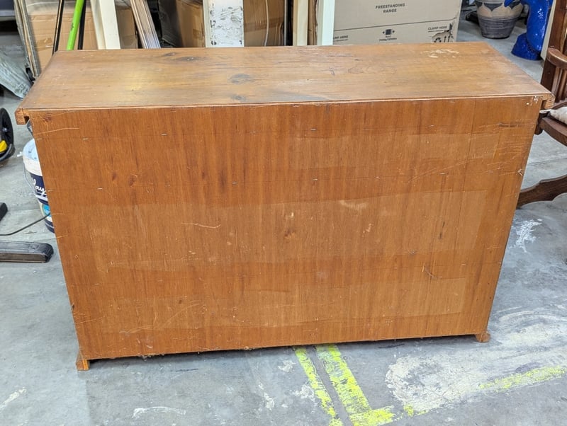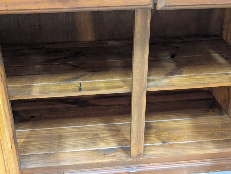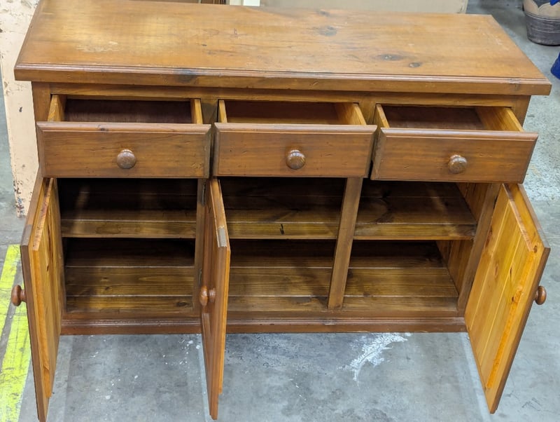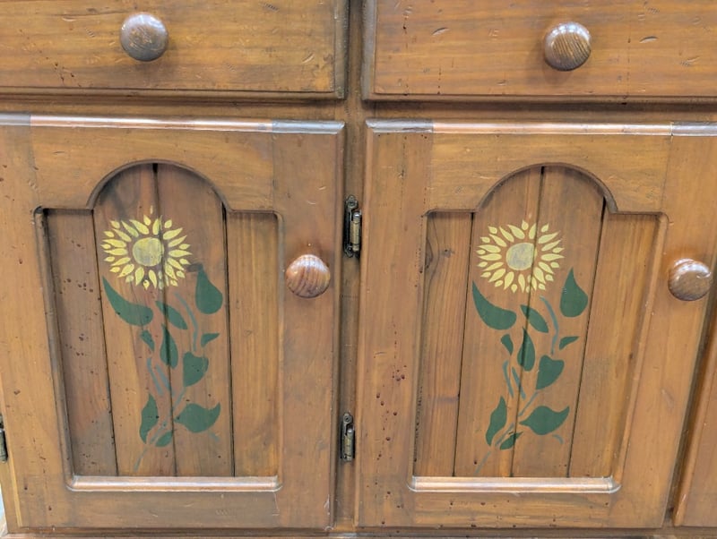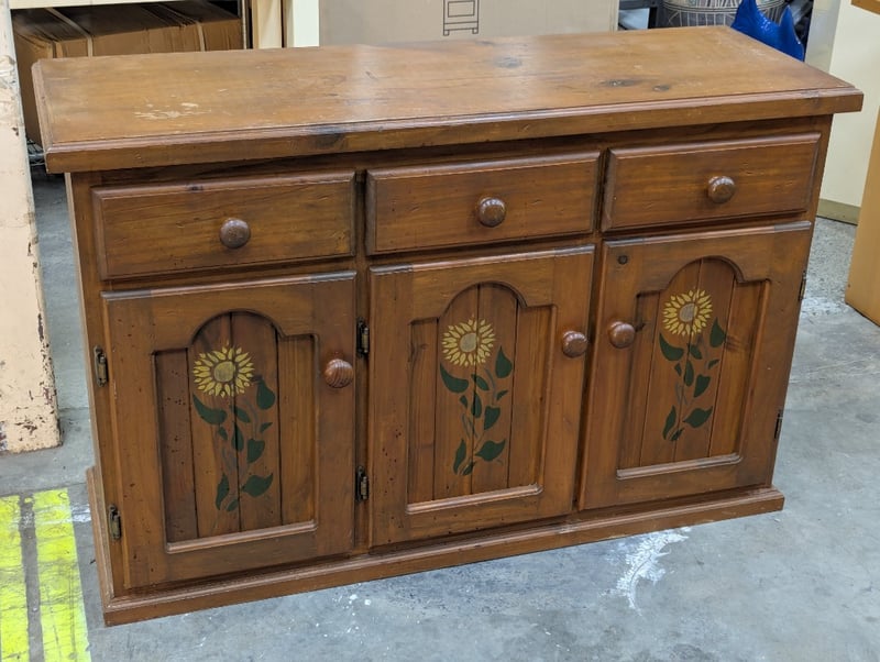 Timber sideboard, wood finish, item features three cupboard doors and three drawers, doors open to single interior compartment with one shelf, painted flower designs on doorsDimensions: 76cm H x 124cm W x 44cm D