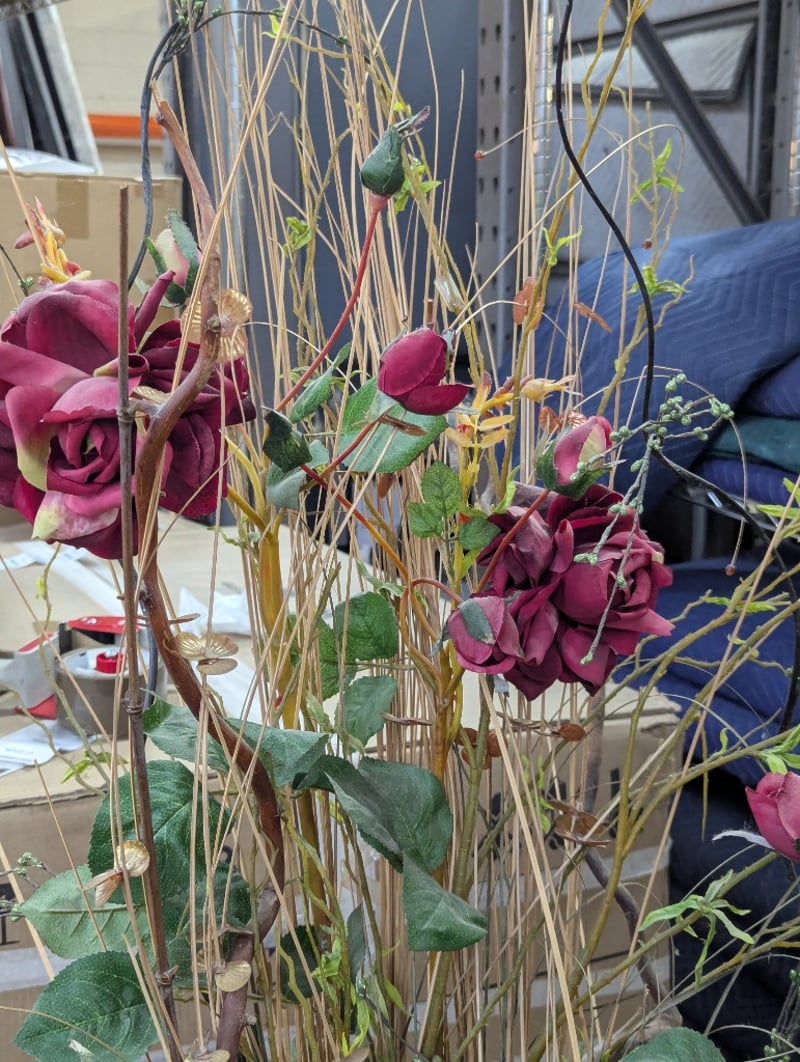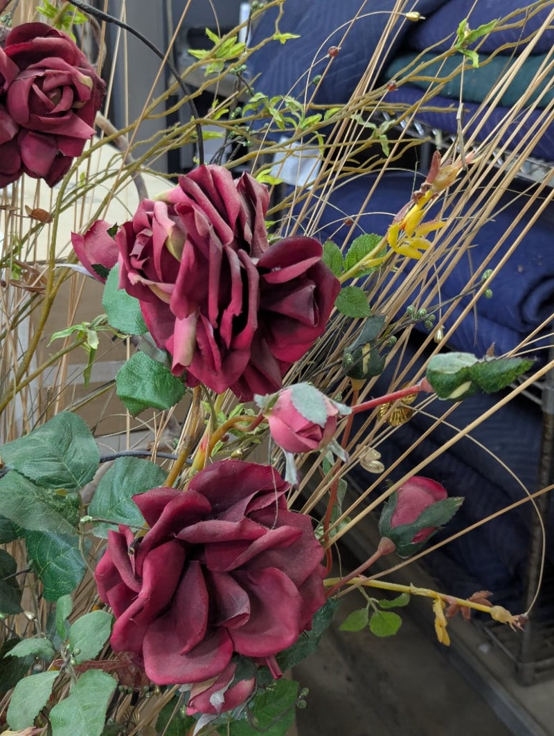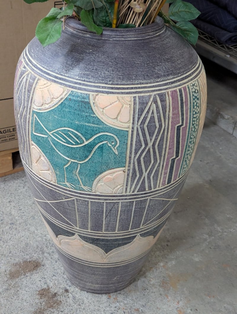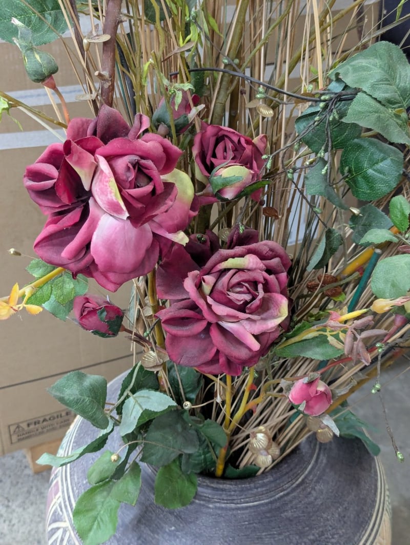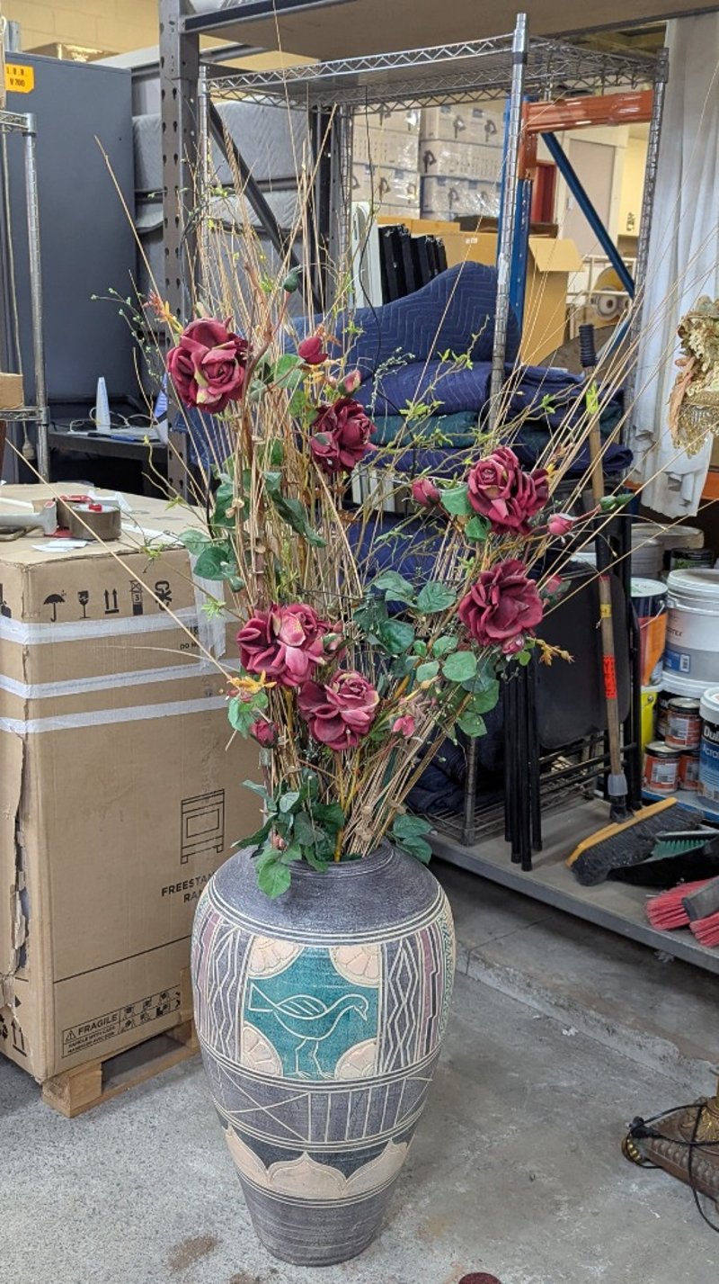 decorative floor vase featuring indigenous-inspired geometric patterning in teal, cream, and charcoal tones. The vessel showcases a stylised bird motif within a turquoise panel, complemented by linear and abstract designs. Accompanied by an elaborate faix floral arrangement comprising burgundy/wine-coloured artificial roses with green foliage, dried grasses, and decorative branches in natural tan and ochre tones. The arrangement demonstrates professional floristry composition with layered height variation and textural contrast. The vase exhibits a traditional barrel form with tapered base and wide shoulder, characteristic of contemporary artisan ceramics inspired by indigenous Australian design traditions.Vase size: 70cm h x 40cm w