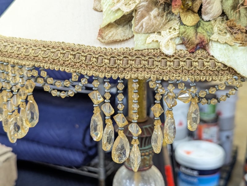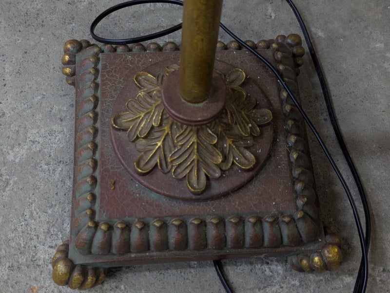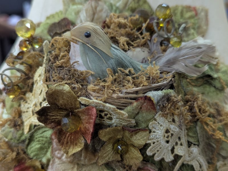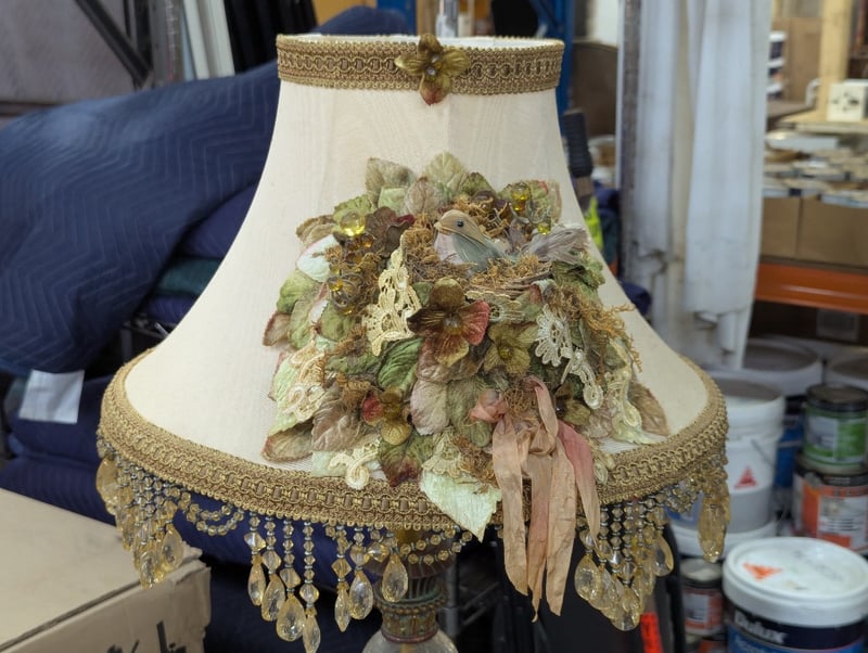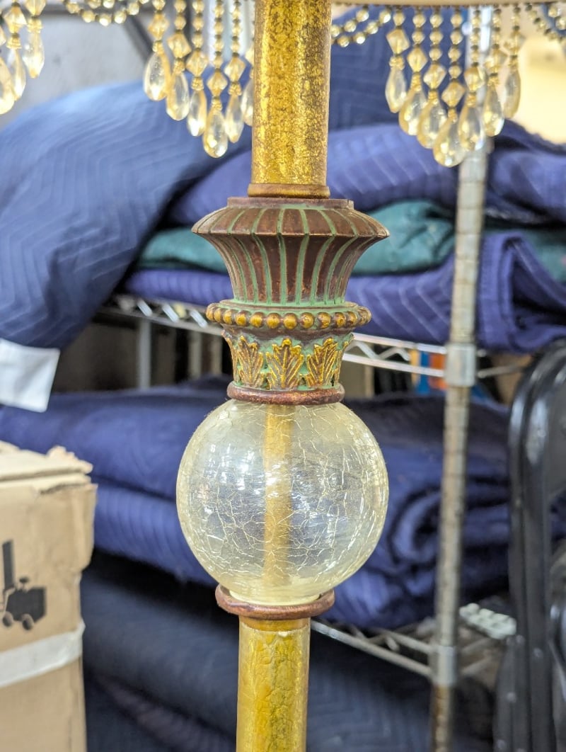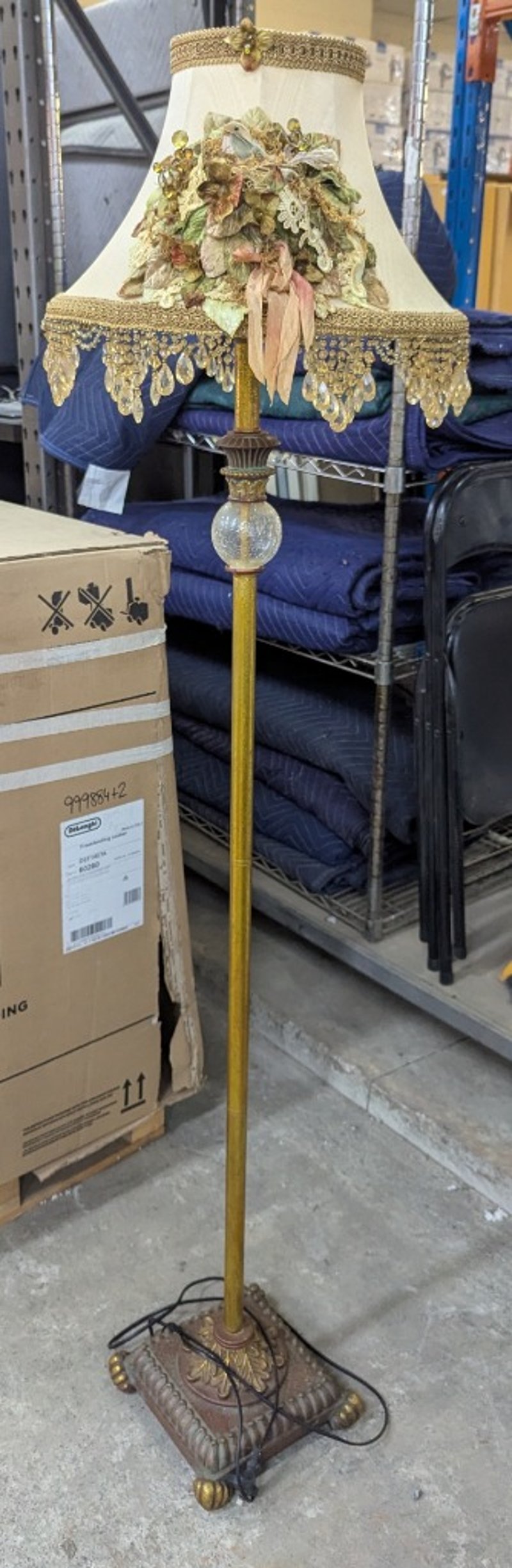 Electric floor lamp with bird nest style lampshade, metal body with glass orb, lampshade features model bird in nest amongst leavesDimensions: 164cm h x 44cm w