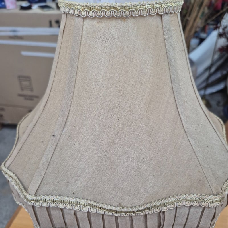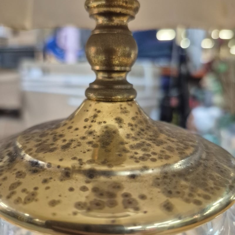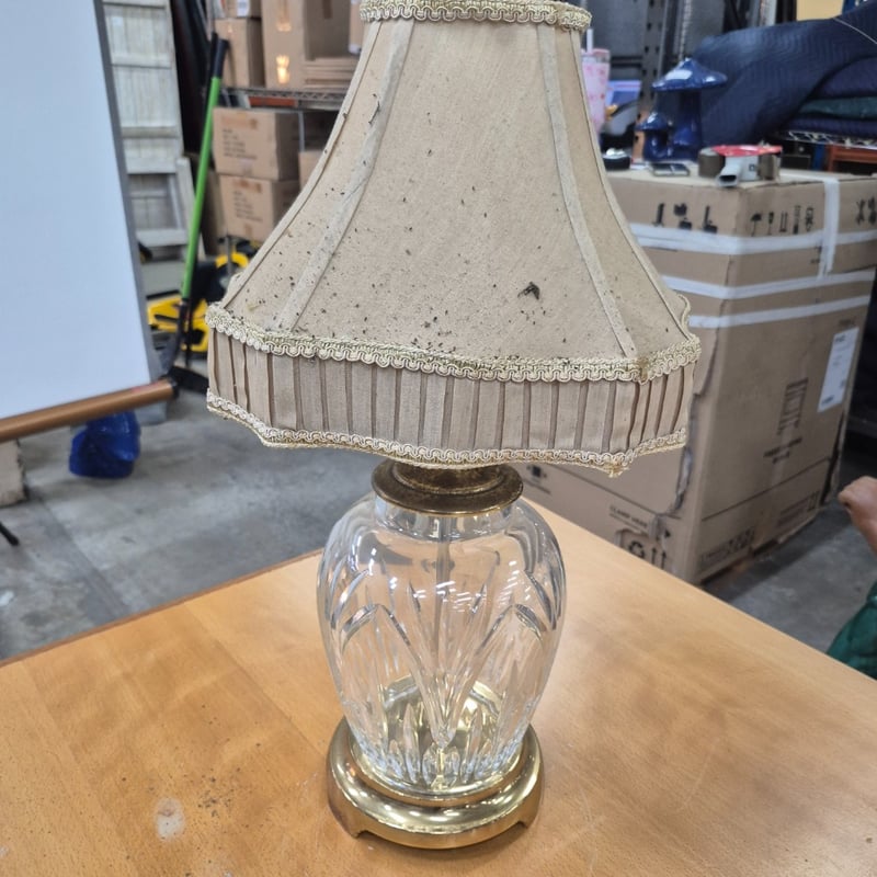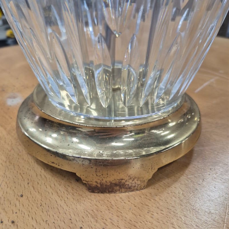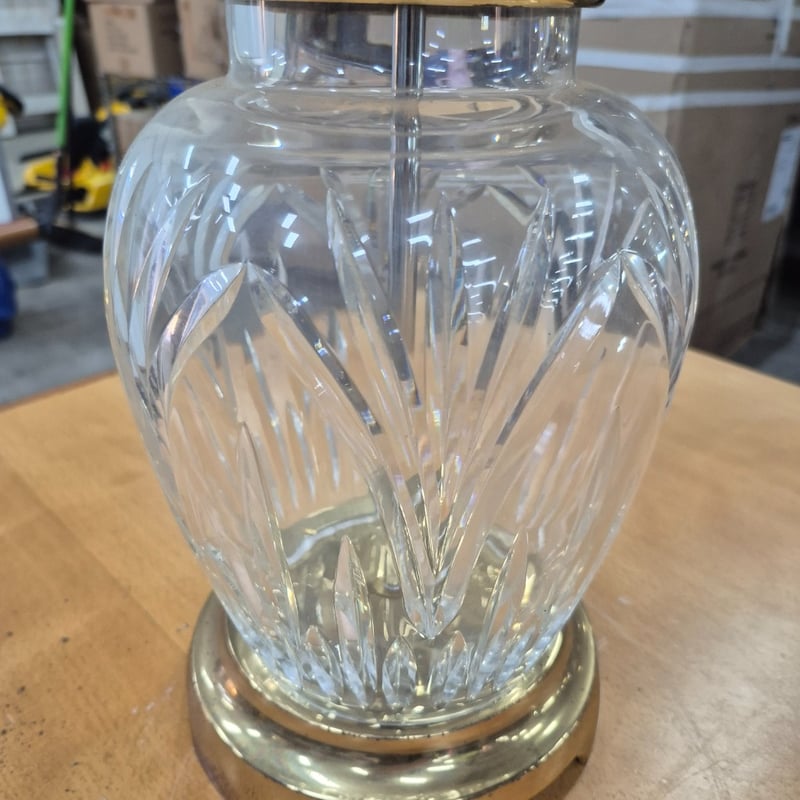Table lamp featuring a cut-glass base with radiating fan pattern and brass fittings.