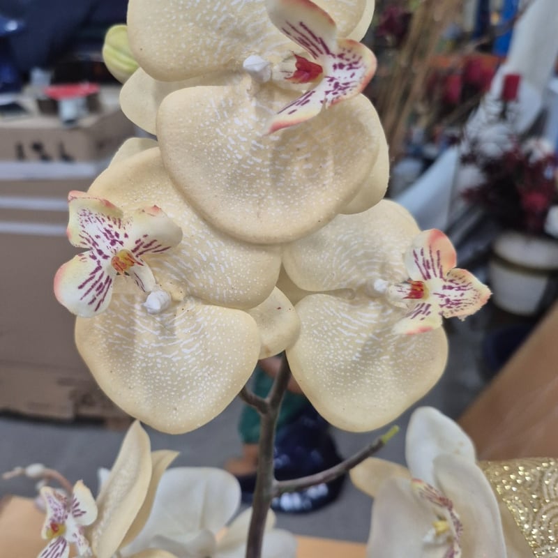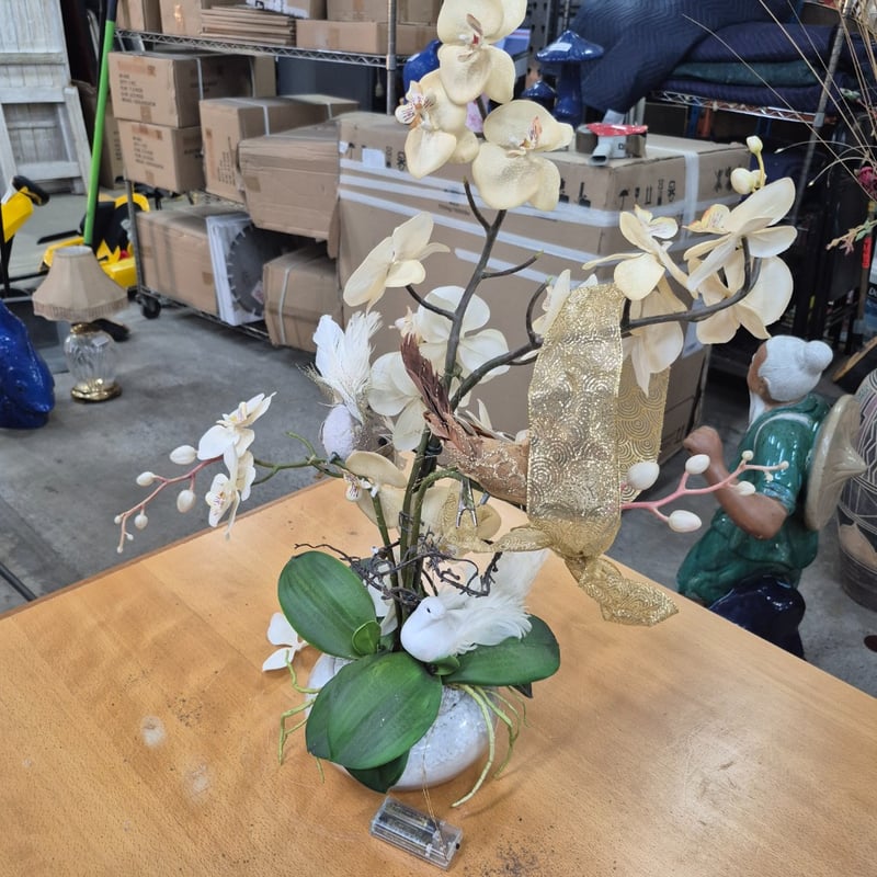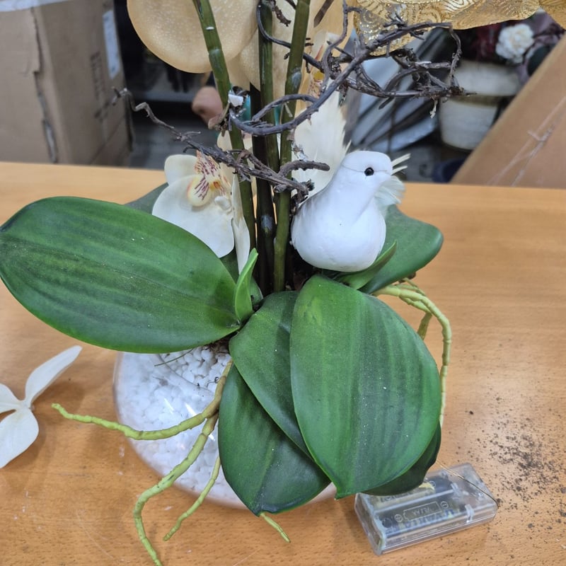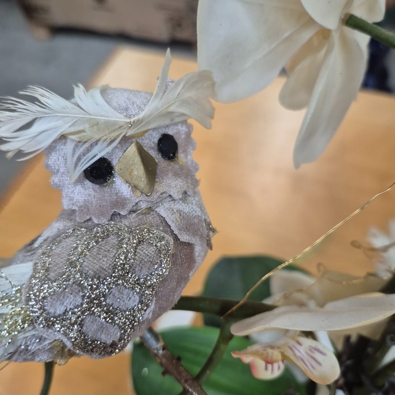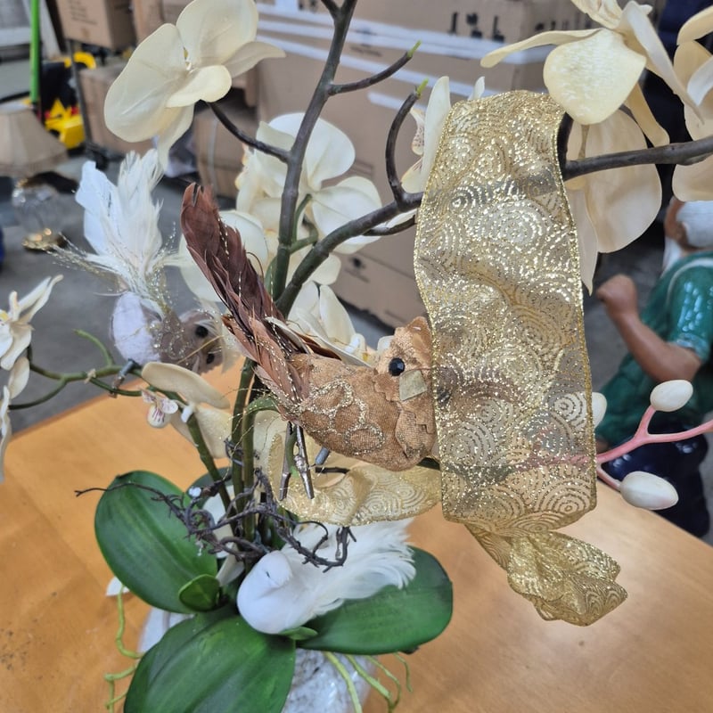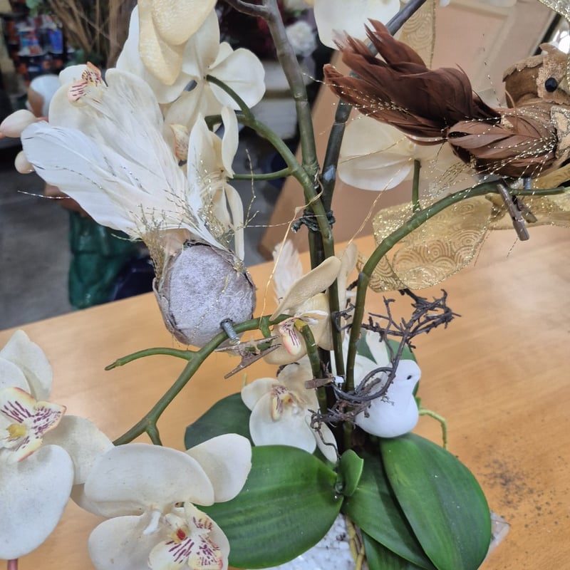 decorative orchid arrangement featuring white Phalaenopsis orchids with delicate purple-red markings on multiple blooms. The composition includes lush green foliage, dark woody branches, and decorative embellishments including white feathered bird figurines and gold-patterned ribbon accents.